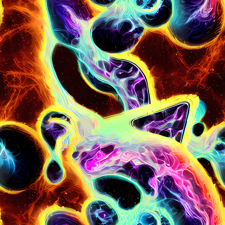 "Etherial Eruption" bursts with vibrant neon hues of electric blue, fiery orange, and vivid magenta, swirling in an abstract dance of cosmic energy. The pattern's fluid shapes and dynamic textures evoke a sense of otherworldly wonder, perfect for those with an adventurous spirit. Ideal for bold evening events or art gallery openings, this design shines in transitional seasons, catering to the daring and expressive personality.