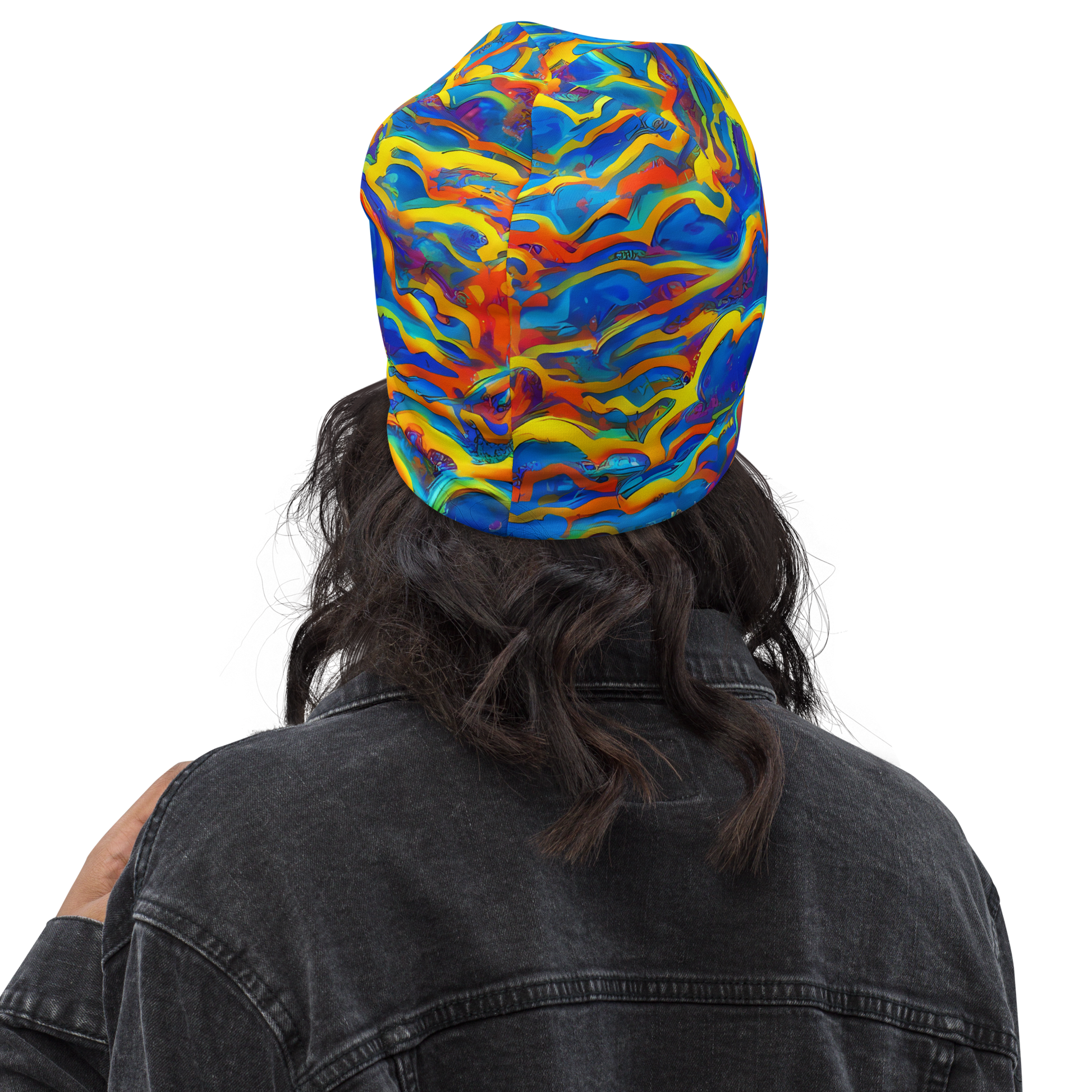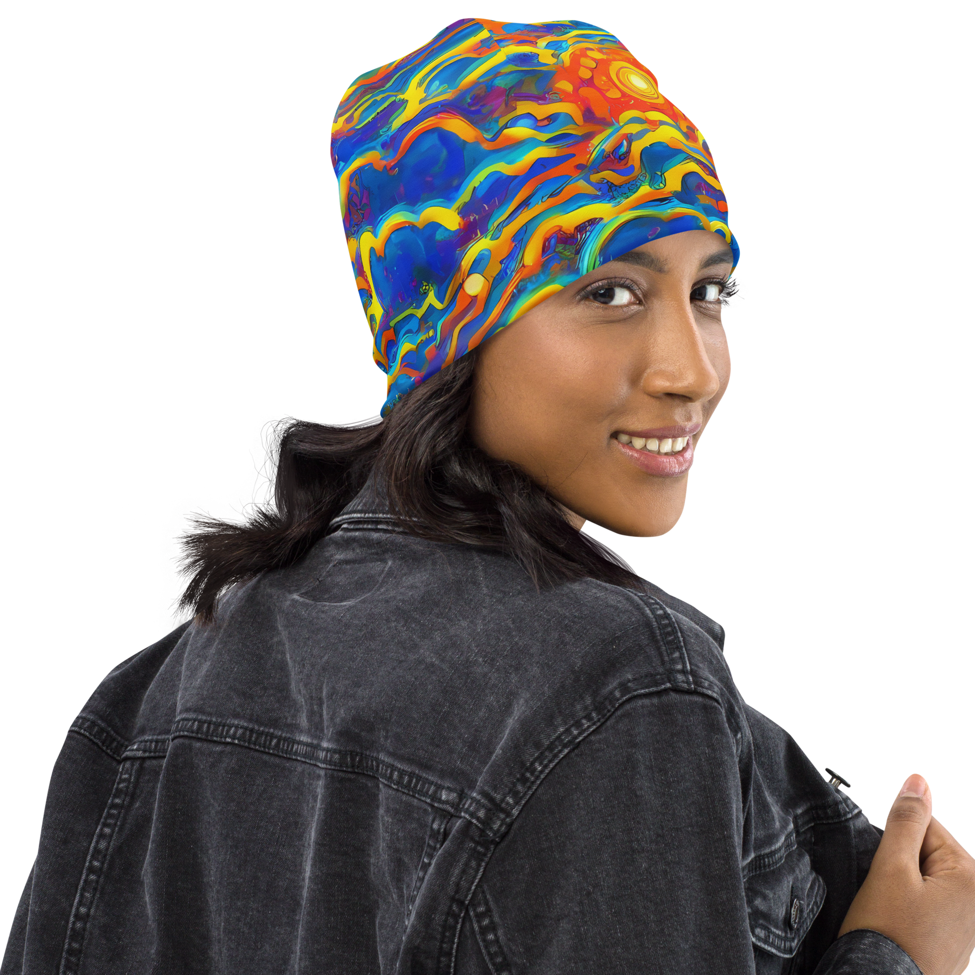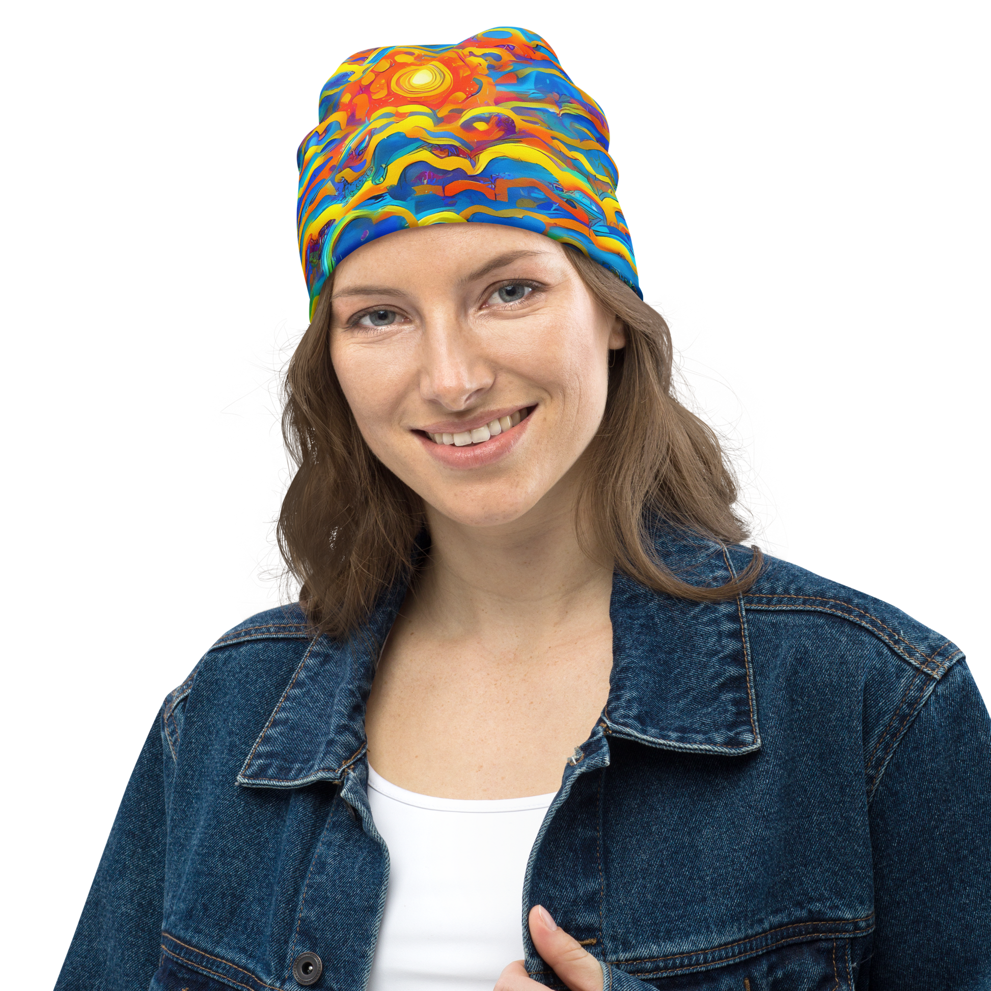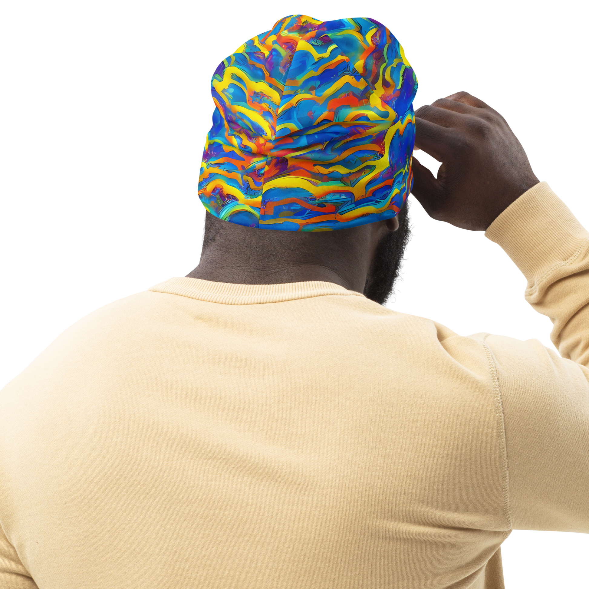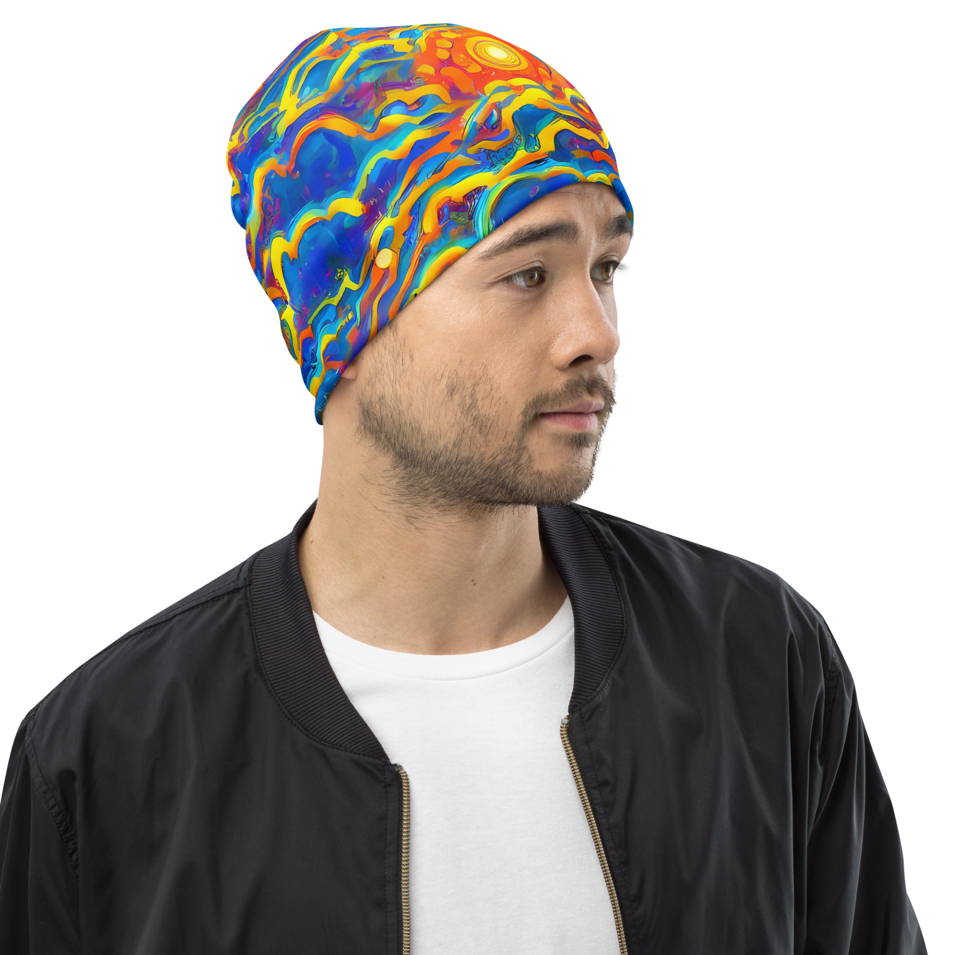 Step into a world of vibrant energy with our custom-designed, double-layered beanie. Featuring a dynamic tapestry of electric blues, sunny yellows, and fiery oranges, this beanie captures the essence of a celestial dance in wave-like, glossy textures. Perfect for festivals, summer events, or making a bold, artistic statement, each beanie is a unique AI-generated masterpiece, ensuring you stand out in style.