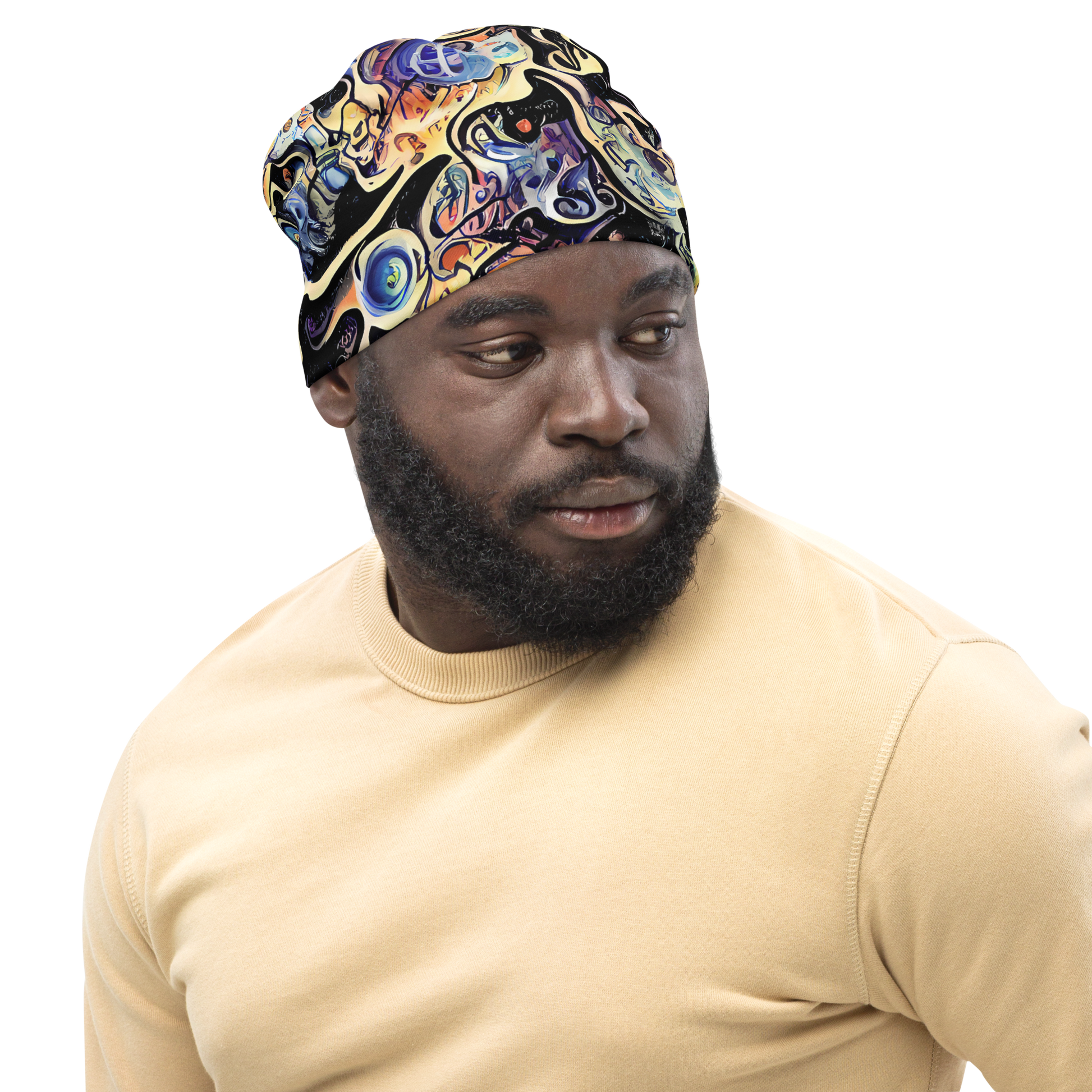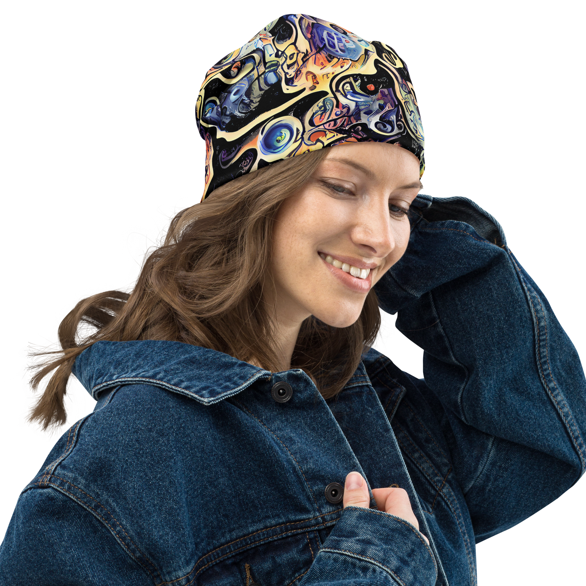 Dive into the depths of the cosmos with our exclusive beanie, featuring a vibrant fusion of abstract shapes and cosmic motifs that dance across the fabric in a symphony of blues, oranges, and yellows. Inspired by the chaotic energy of expressionist art, this headpiece is a tribute to those with a bold spirit and an eye for the avant-garde. It's the perfect accessory to crown your look for creative gatherings or music festivals, especially as the weather warms.