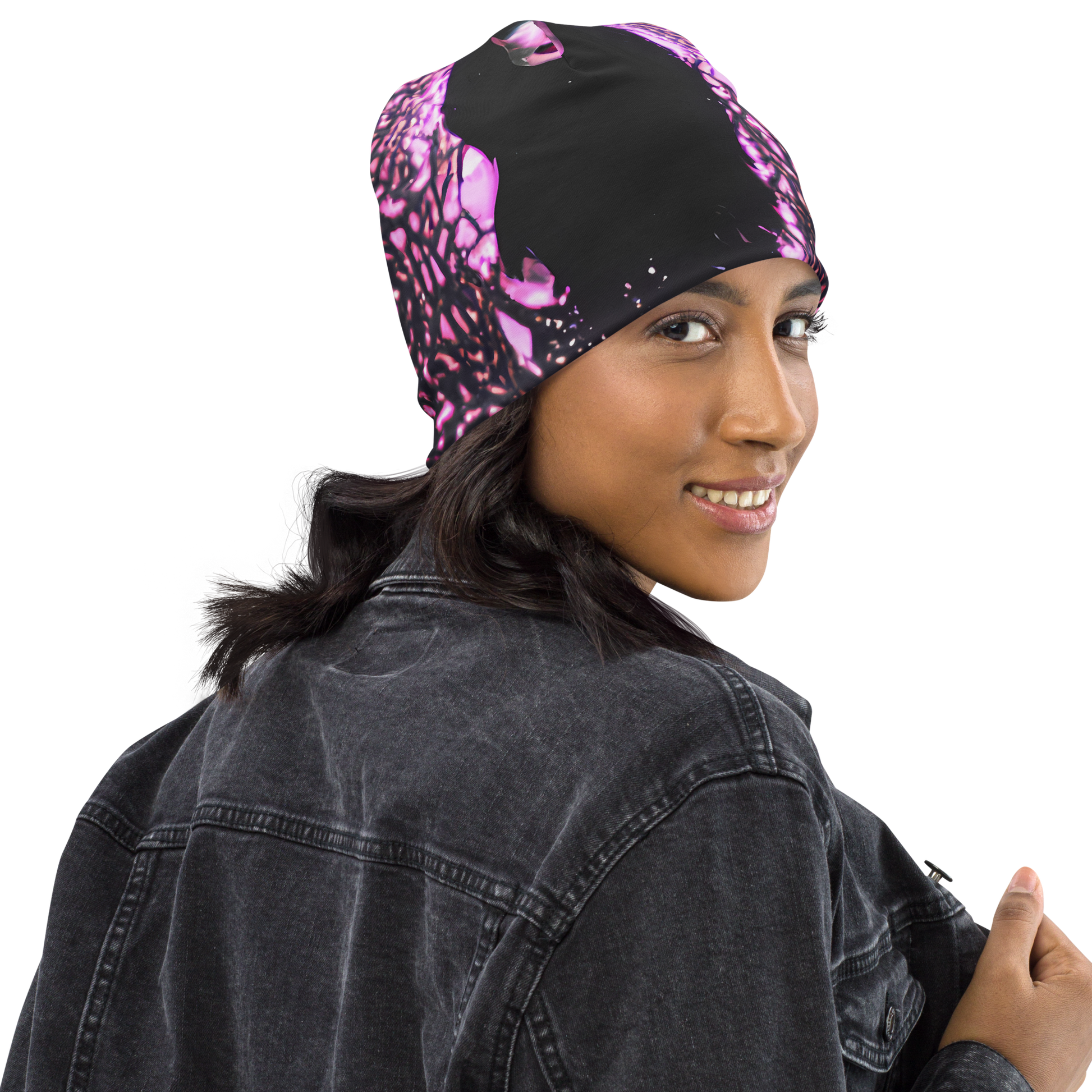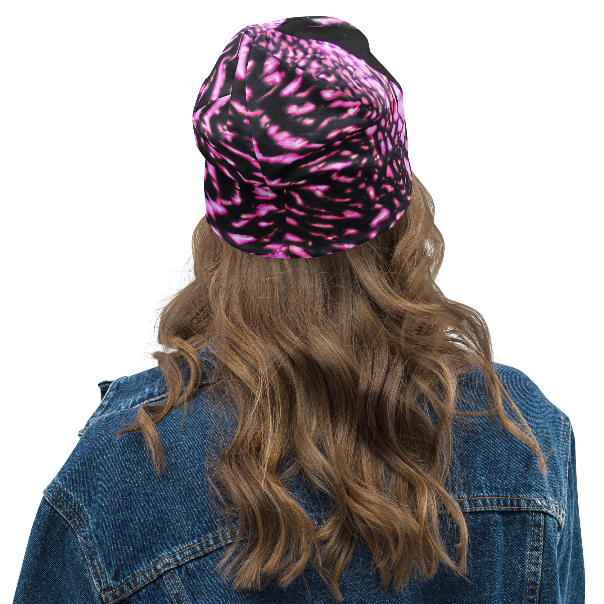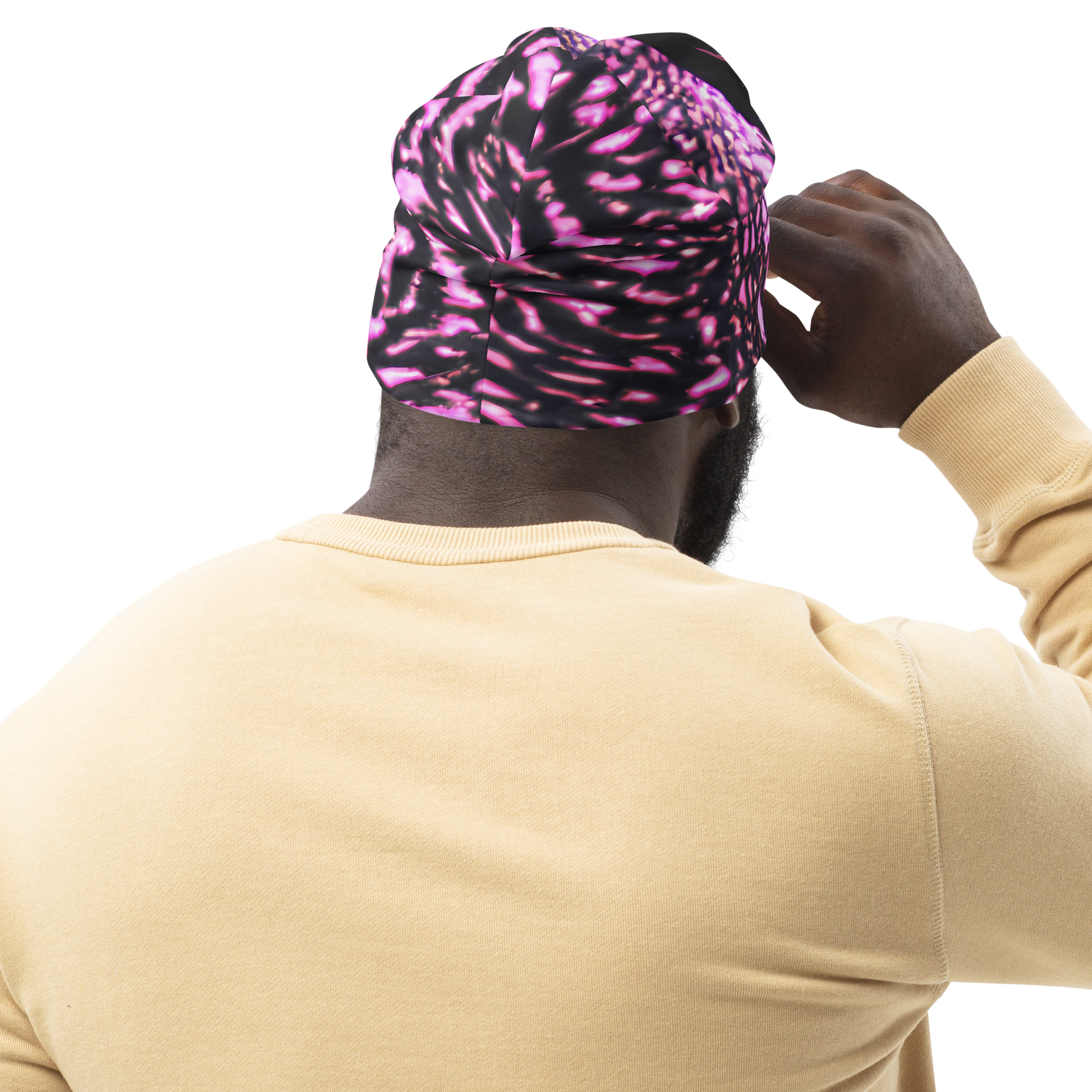 Wrap your head in the enigmatic allure of our latest beanie, where art meets comfort in a symphony of deep purples and magentas. The abstract, zebra-like stripes dance around the silhouette, capturing the provocative energy and ethereal narratives that whisper tales of introspection and avant-garde elegance. Designed for the bold and the artful, this beanie is your perfect companion for fall gatherings and expressions of unique style.