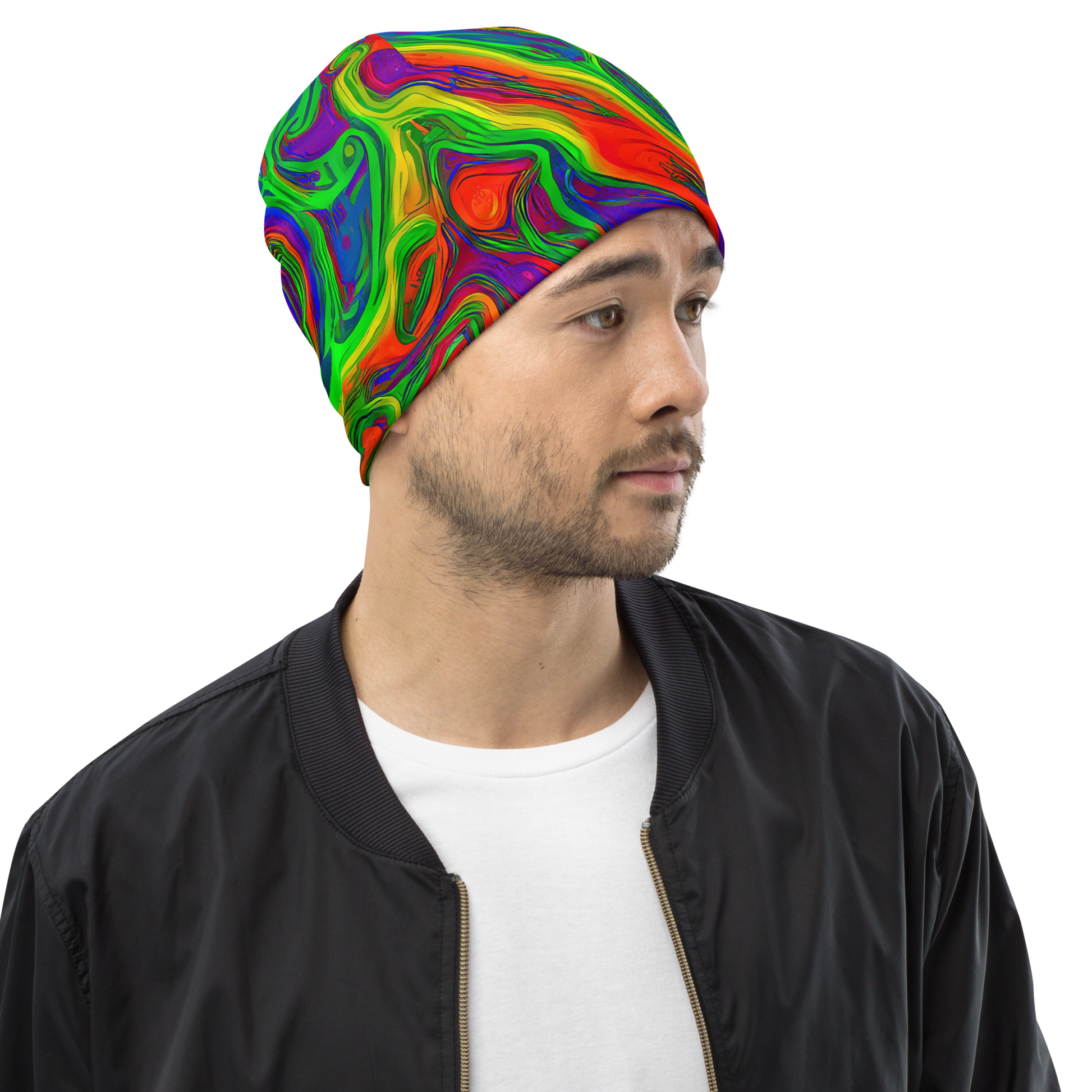 Step into a realm of cosmic wonder with our custom-designed, double-layered beanie, featuring a vibrant tapestry of neon green, electric blue, fiery red, and deep purple swirls. This dynamic pattern, inspired by the mysteries of deep space, evokes a sense of energetic movement and artistic expression, perfect for those who dare to stand out. Whether you're heading to a festival or just embracing your unique style, this beanie ensures you do it with flair.