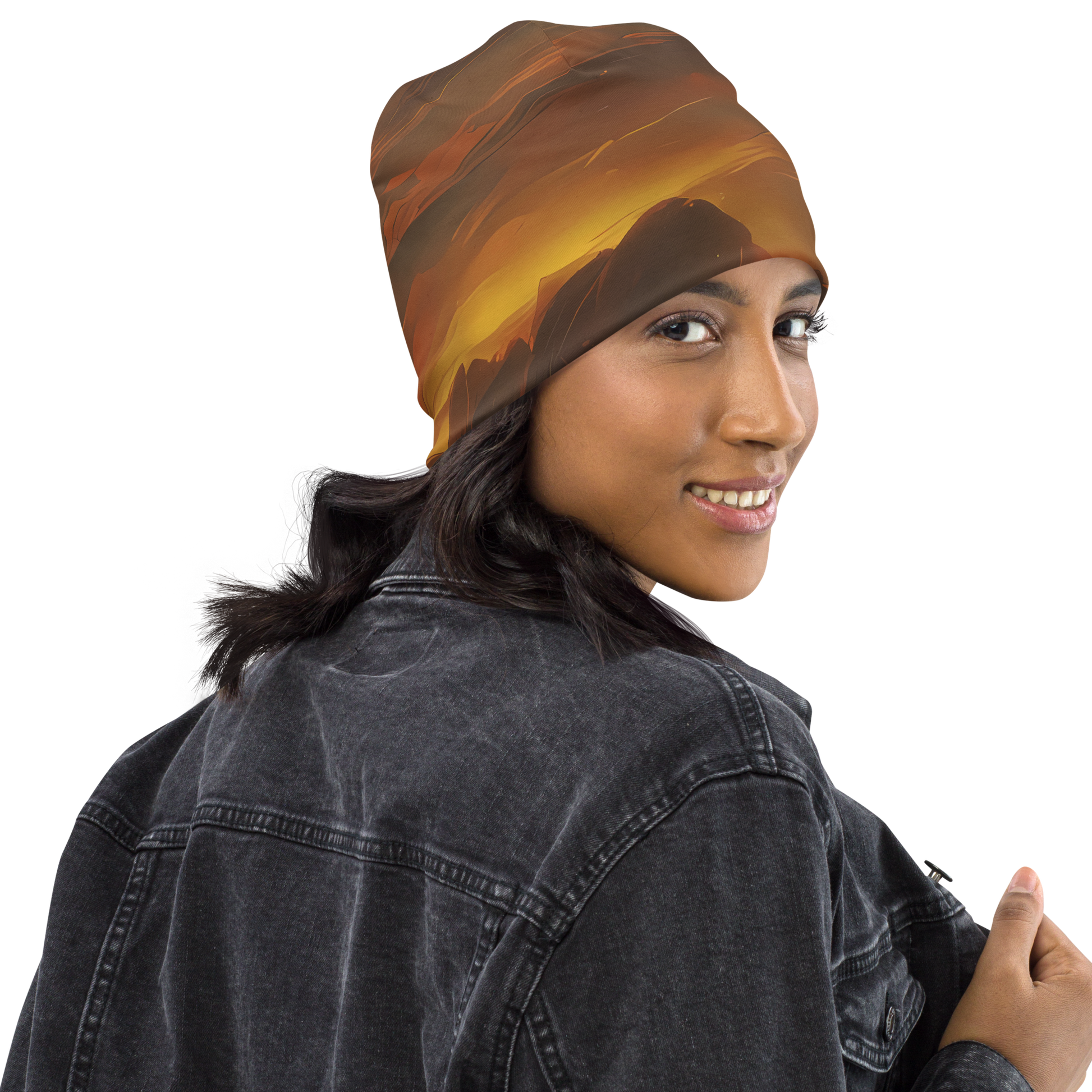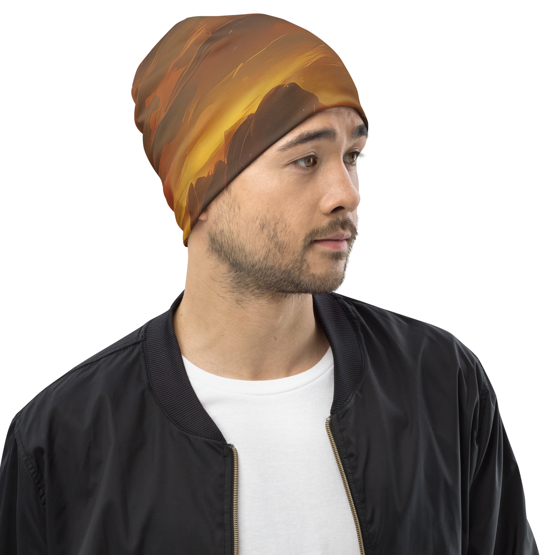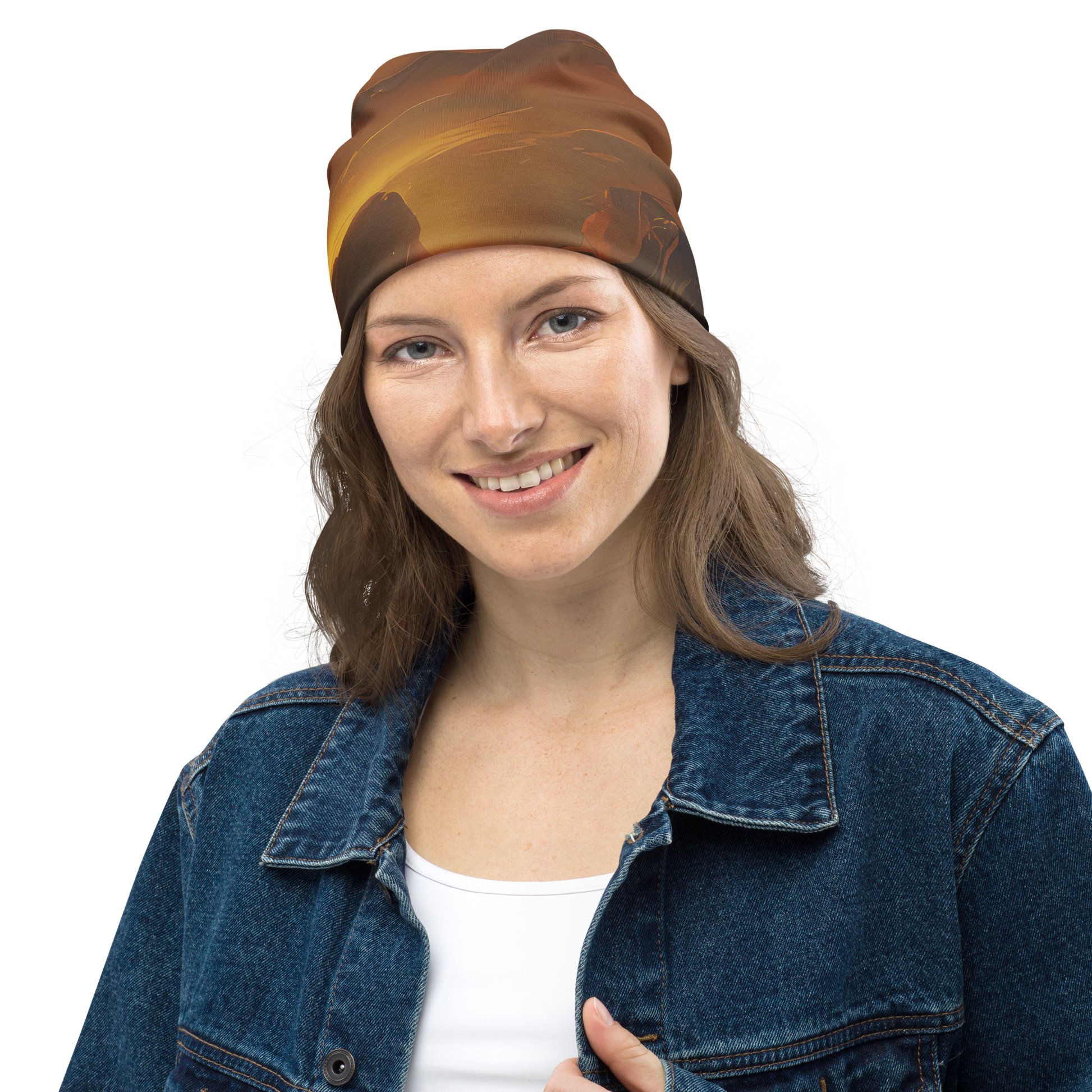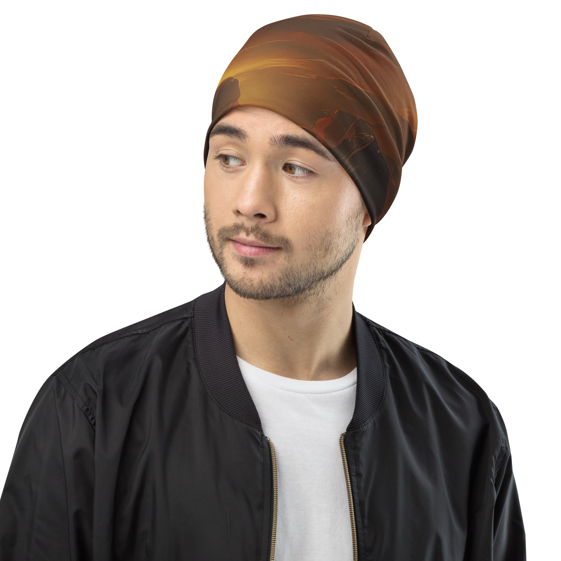 Step into a world of art and nature with our custom-designed, double-layered beanie, featuring a mesmerizing blend of fiery oranges, deep reds, and shadowy purples. Inspired by romantic landscapes and dramatic seascapes, this beanie captures the awe-inspiring beauty of a sunset over rugged cliffs and tranquil waters. Perfect for evening gatherings, art exhibitions, or autumn outings, it suits a confident, adventurous personality who appreciates the fusion of classic artistry and contemporary design.