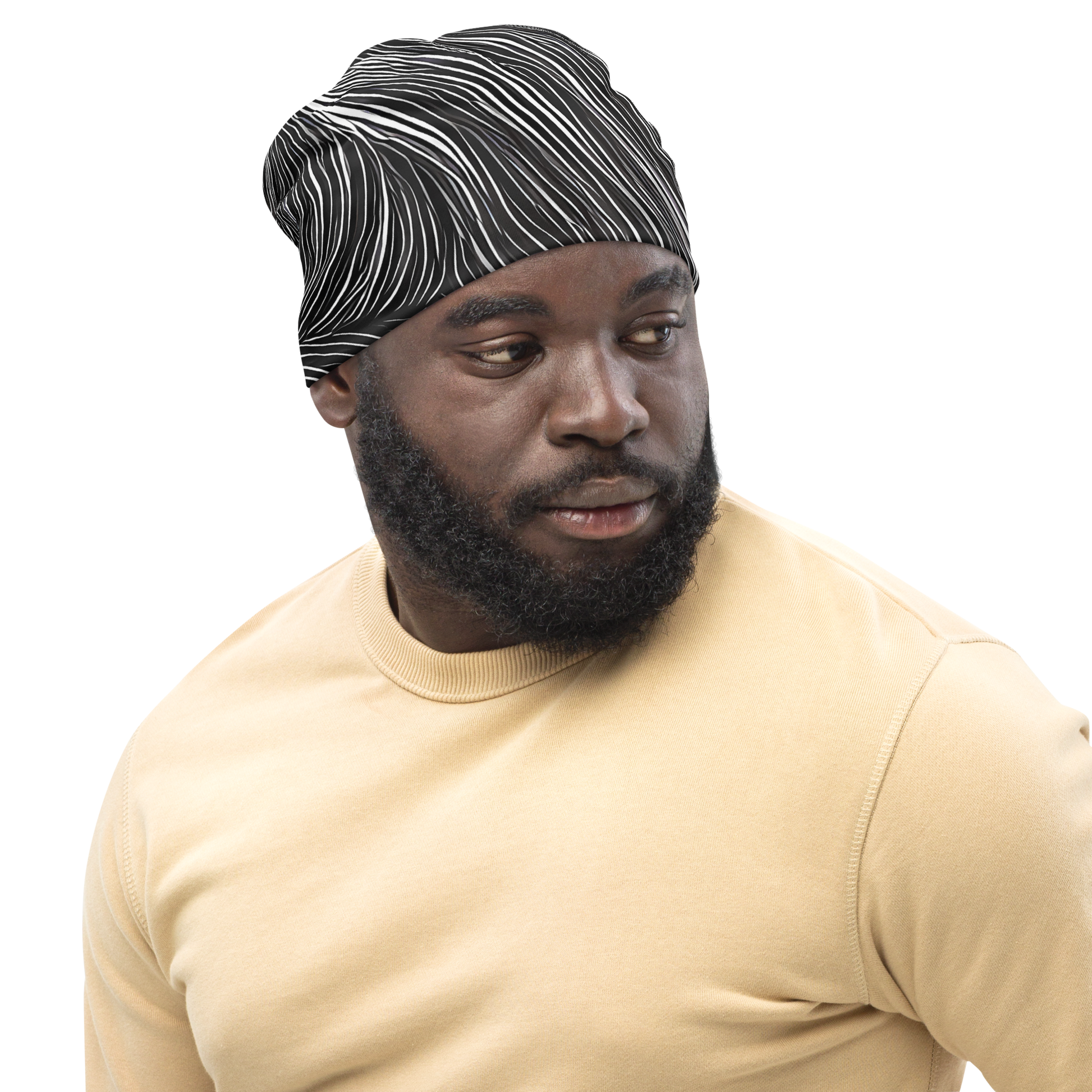 Wrap your head in the tranquil beauty of our exclusive beanie, featuring the serene "Wirth Waves" design. This unique piece showcases an enchanting array of flowing lines in subtle monochromatic shades, offering a touch of minimalist art to your wardrobe. The organic curves and soothing grayscale palette are reminiscent of a peaceful seascape or elegant wood grain, perfect for those who seek a blend of comfort and sophisticated style. Ideal for the reflective soul, this beanie complements the quiet cool of autumn and the fresh bloom of spring, making it a versatile addition to any outfit.