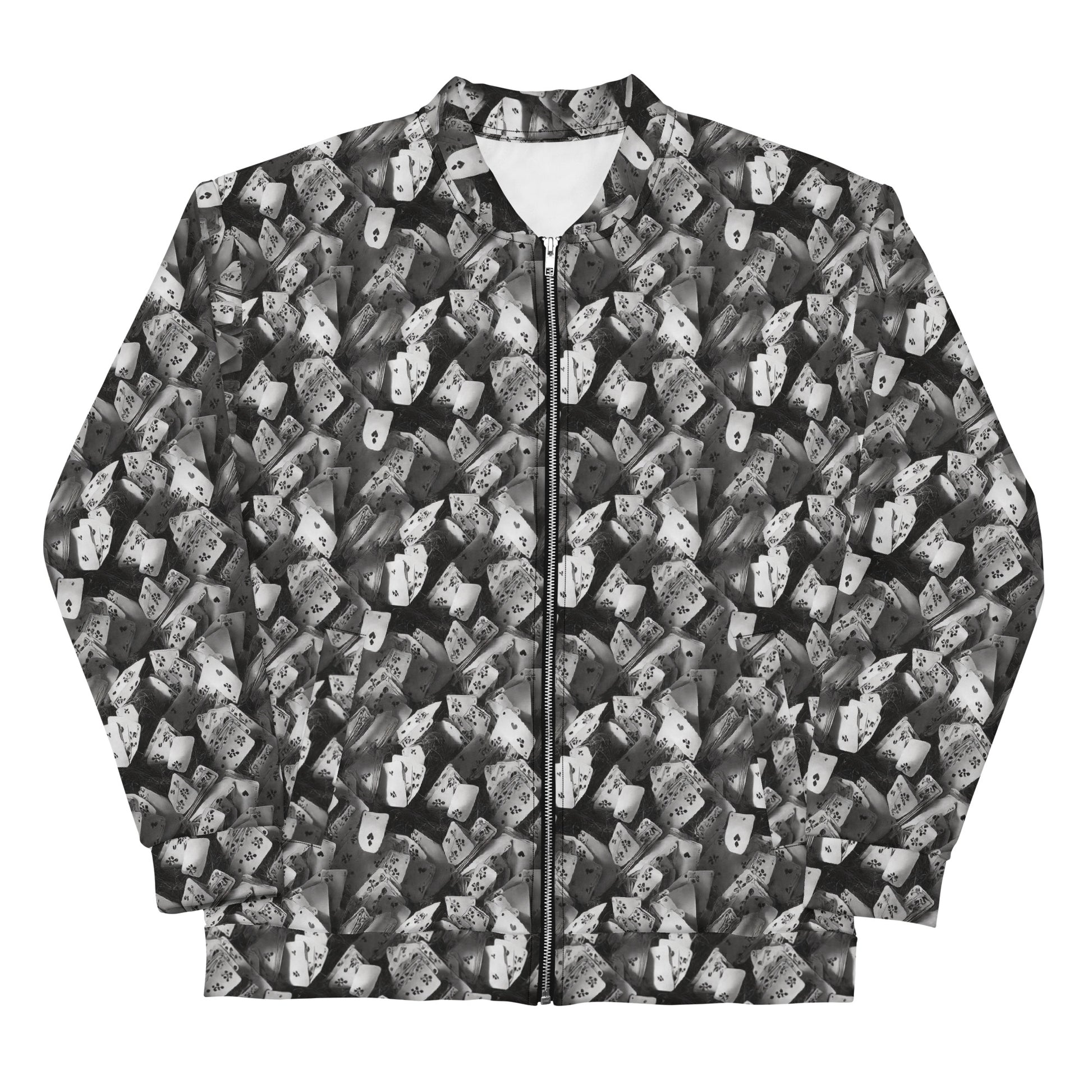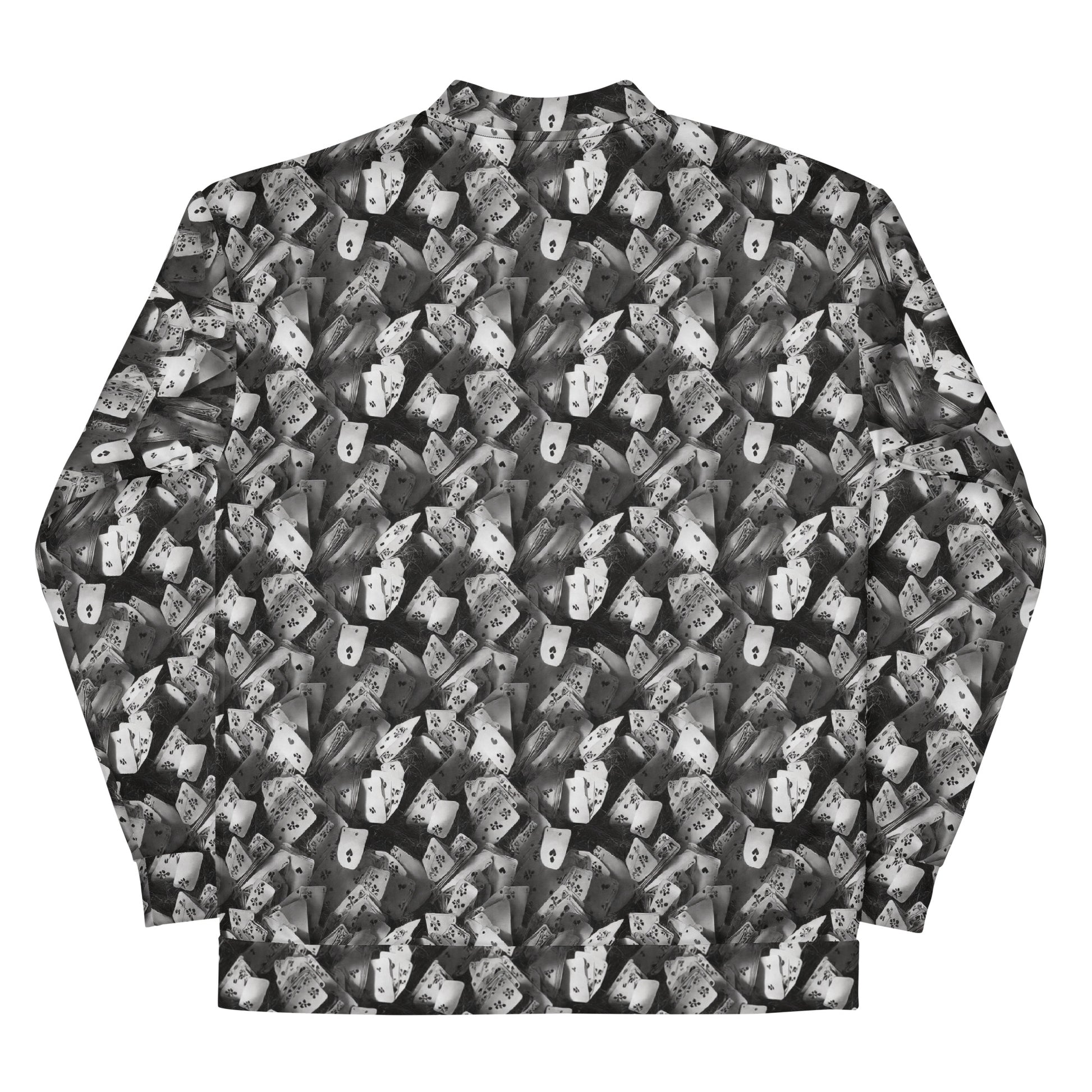 Unleash your inner adventurer with our "Fortune’s Folly" Bomber Jacket, where whimsy meets sophistication in a striking monochrome design. This jacket features a captivating pattern of scattered playing cards, evoking a sense of mystery and playful intrigue. Perfect for autumn gatherings or avant-garde events, it's an essential staple for those who thrive in life’s unexpected twists. Crafted for comfort and style, this piece promises to be a standout addition to your wardrobe.