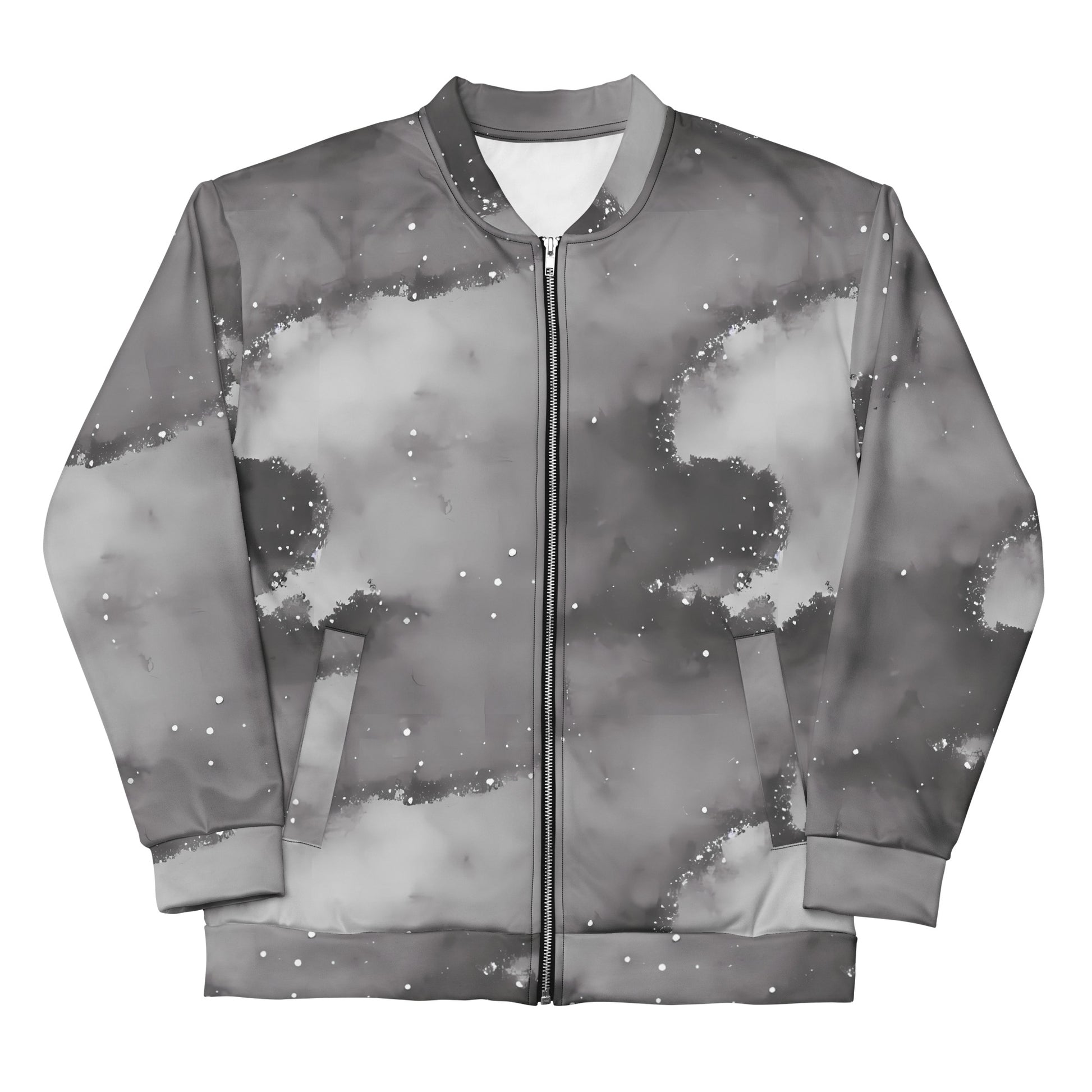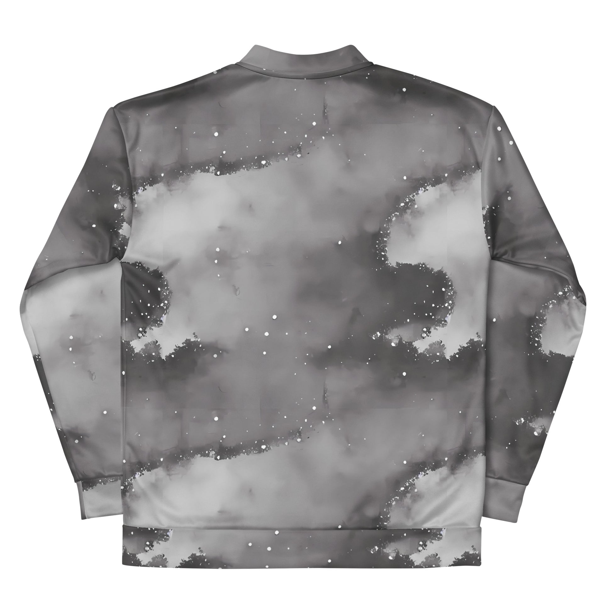 Step into the cosmos with our "Monochrome Dreams" Bomber Jacket, where ethereal beauty meets urban chic. This unique piece features a mesmerizing pattern that captures the essence of a misty cosmic landscape, blending soft greys and deep blacks with delicate white specks reminiscent of distant stars. Perfect for the introspective and imaginative soul, this jacket not only elevates your style but envelops you in dreamy comfort with its brushed fleece lining. Whether you're heading to an avant-garde evening event or simply strolling through the city, this versatile unisex bomber is your ideal companion for the cooler seasons.