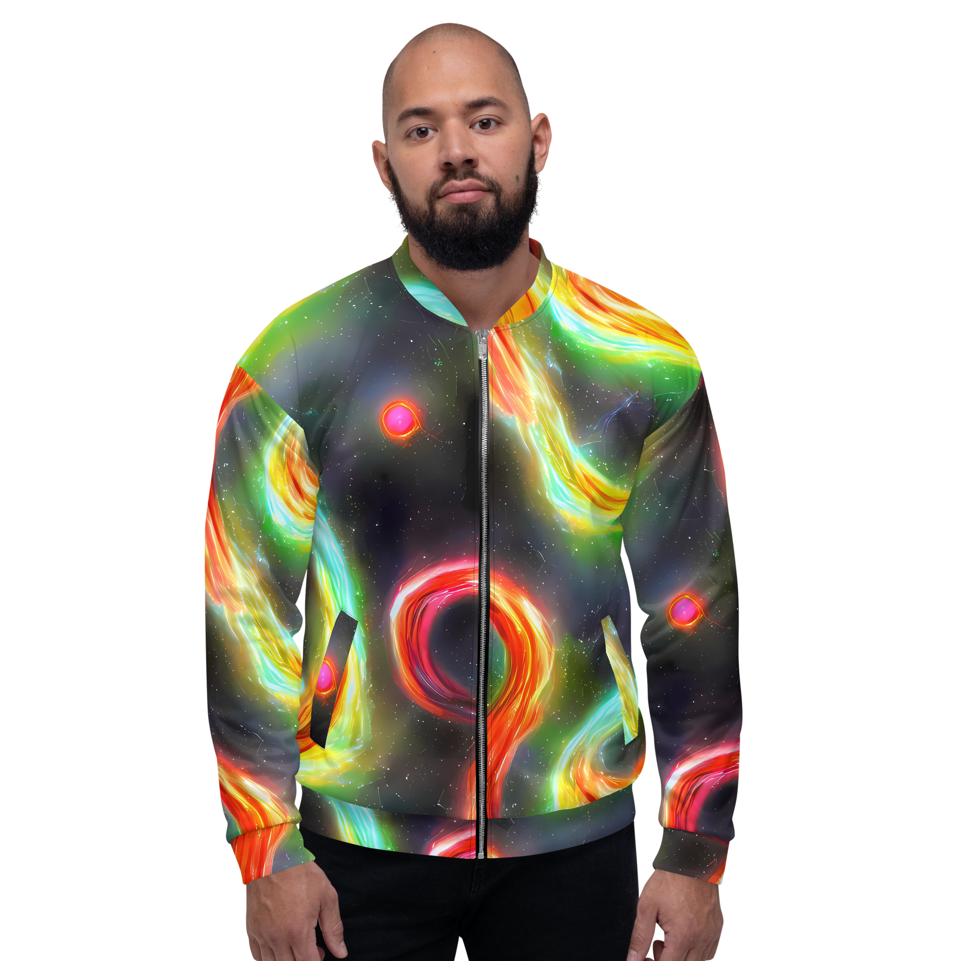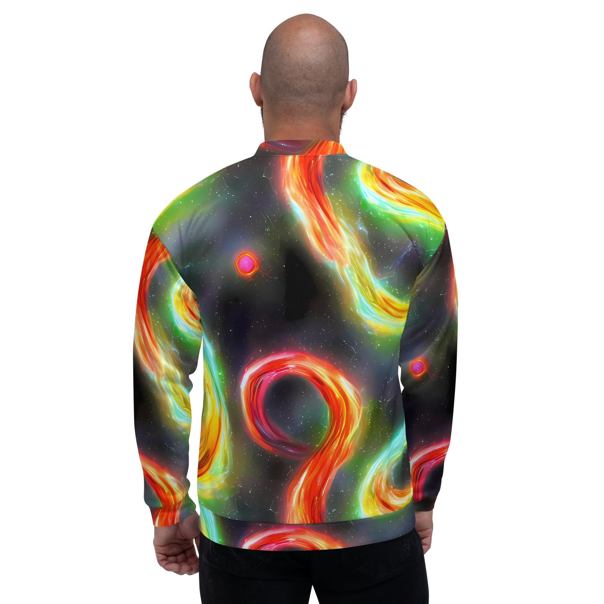 Step into a world of vibrant energy and cosmic allure with our latest Bomber Jacket, featuring an exclusive design of intertwining ribbons of reds, greens, yellows, and blues against a star-speckled black backdrop. This dynamic pattern captures the adventurous spirit and adds a bold statement to any outfit. Perfect for dynamic social events or creative gatherings, this jacket is your go-to for year-round style.