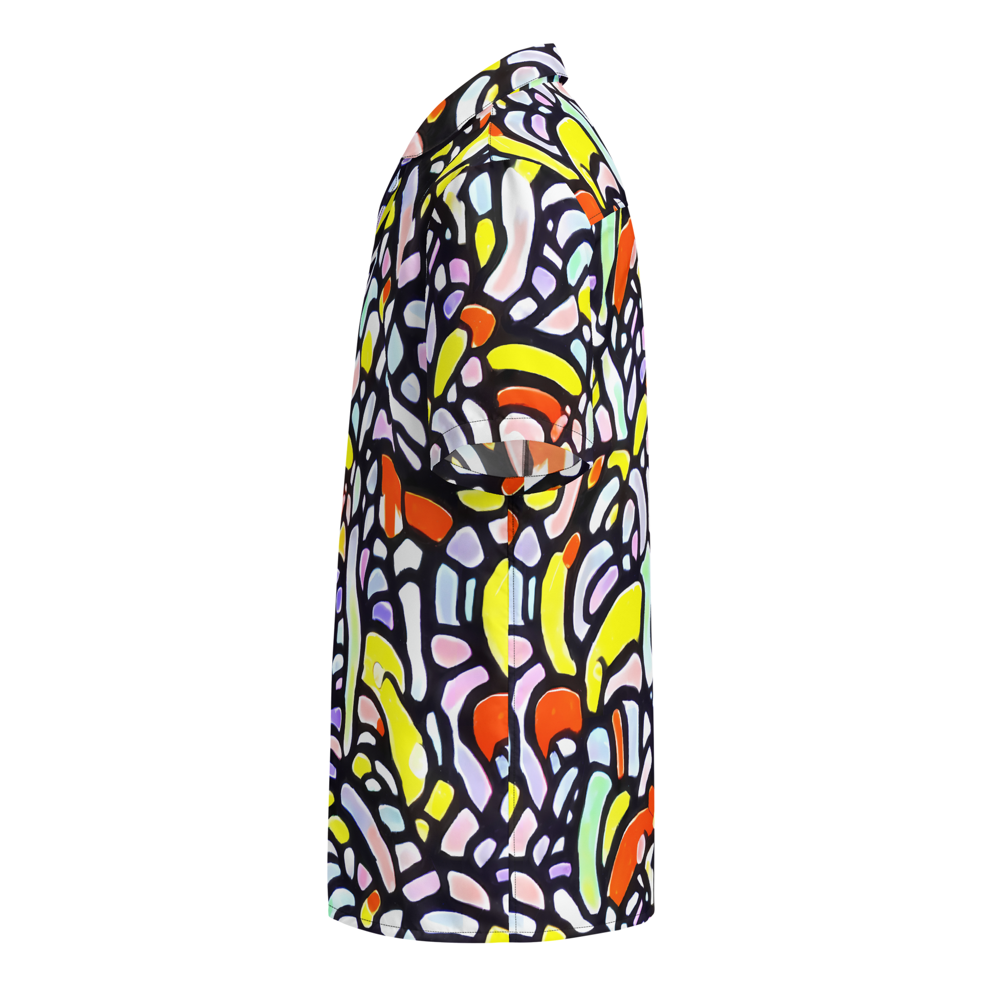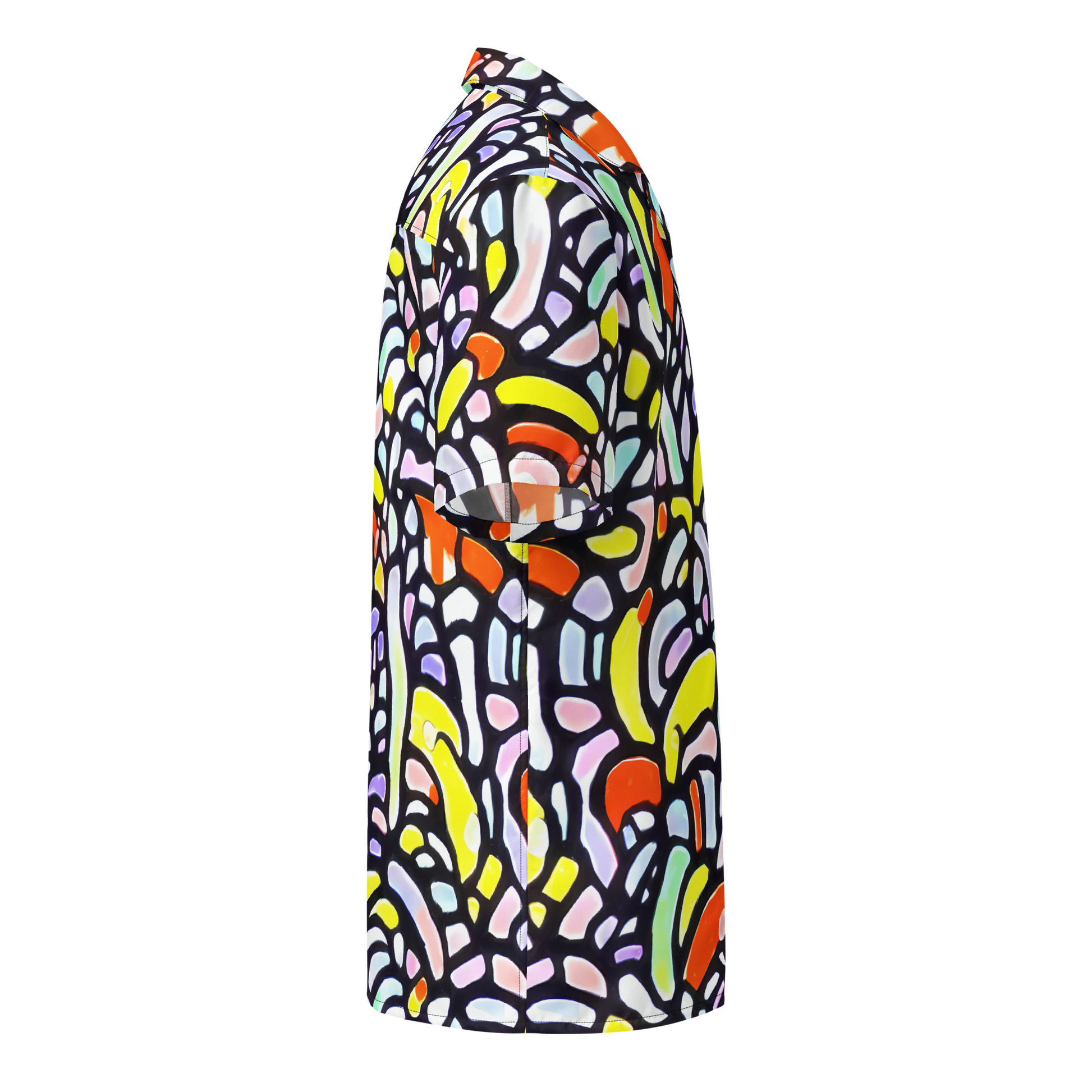 Elevate your summer style with our exclusive Button Shirt featuring the vibrant "Cubist Carousel" pattern. This dynamic design showcases bold, curvilinear shapes in a striking palette of orange, pink, yellow, and white, inspired by the lively essence of modern art. Perfect for creative gatherings or casual outings, this shirt is a statement piece that reflects your spirited personality while keeping you comfortable and stylish all season long.