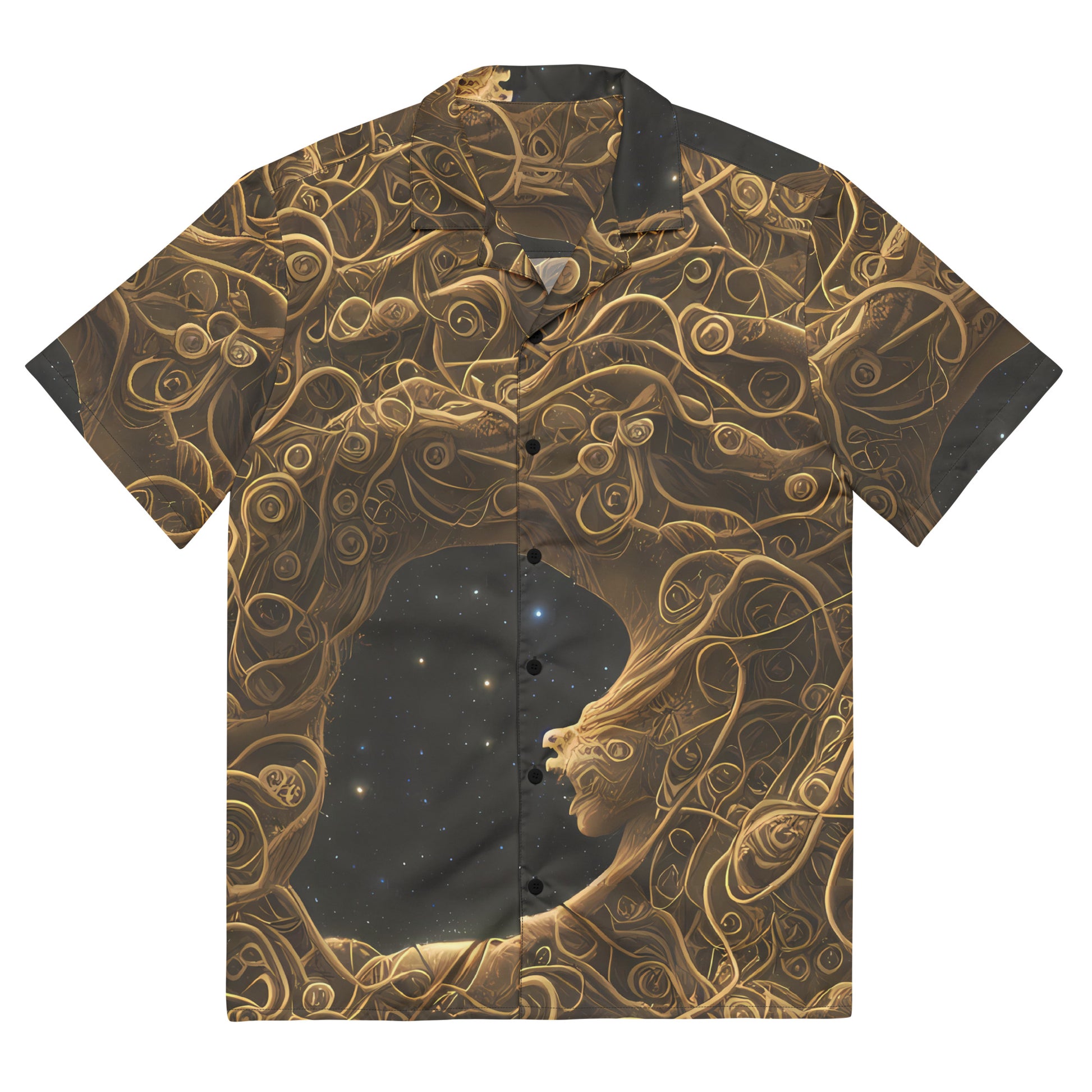 Step into a realm of enchantment with our "Gilded Reverie" Button Shirt, where swirling golden motifs dance against a deep, starry night backdrop, capturing the essence of ethereal elegance. This AI-crafted masterpiece not only showcases your individuality but also offers a luxurious style that’s perfect for evening events or autumnal gatherings. With its lightweight design and eco-conscious fabric, you’ll stay comfortable and chic while making a statement that resonates with the mystical and dramatic.
