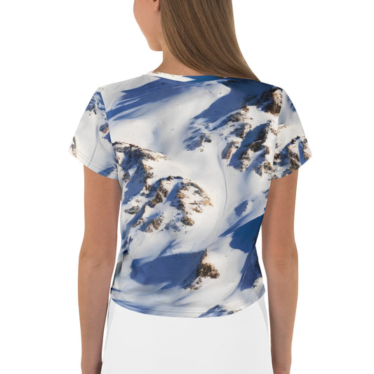 Elevate your winter wardrobe with our "Snowlit Peaks" crop top, where elegance meets adventure. This stunning design captures the serene beauty of sunlit alpine landscapes, blending sweeping whites and soft blues with earthy browns to evoke the tranquility of a crisp winter morning. Perfect for après-ski gatherings or winter getaways, this body-hugging crop top not only highlights your personal flair but also offers the comfort and flexibility you need for all your spirited escapades.