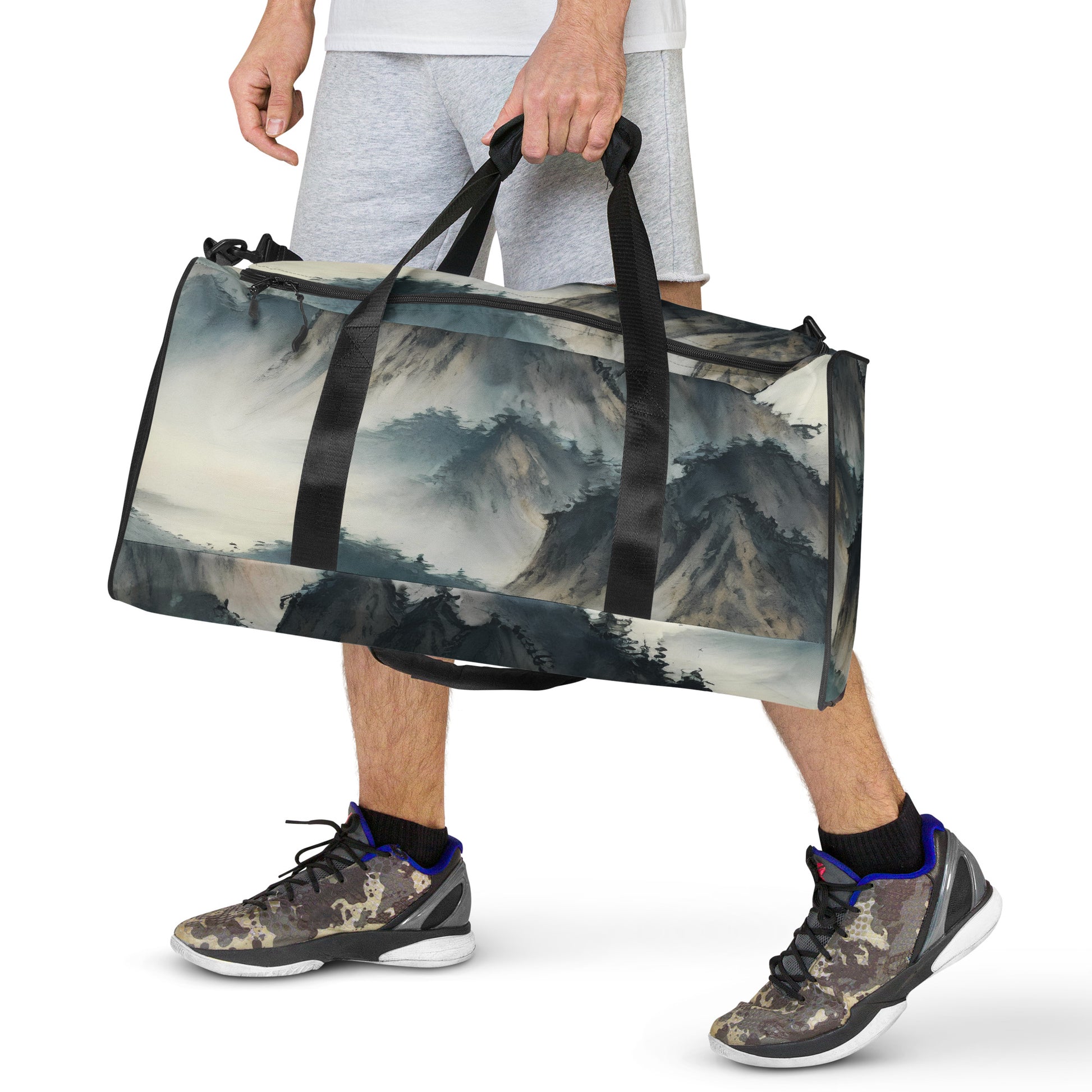 Elevate your travel style with our "Misty Peaks" Duffle Bag, a stunning fusion of functionality and artistry. Inspired by the serene beauty of traditional Chinese mountain landscapes, this bag features an ethereal blend of cool blues, soft grays, and earthy browns, creating a tranquil and timeless aesthetic. Perfectly designed for the artistic spirit, it’s not just a bag; it’s a statement piece that carries your essentials while reflecting your appreciation for nature’s subtle elegance. Whether you're heading to the gym or embarking on a weekend retreat, this duffle bag ensures you do so in style.