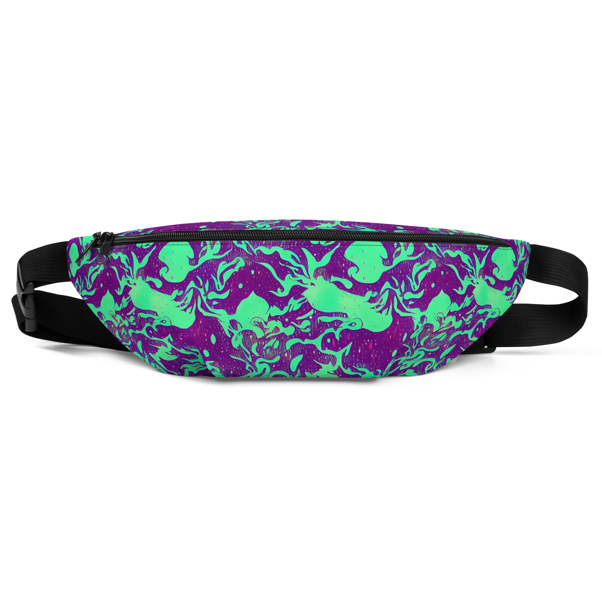 Embark on a sartorial journey through the galaxy with our latest fanny pack, draped in a mesmerizing pattern that captures the essence of an extraterrestrial sea. This accessory is a symphony of psychedelic teal and deep purple hues, swirling into abstract shapes that whisper secrets of the universe. With its dotted textures and fluid forms, it's the quintessential companion for those who command attention at every turn, from pulsating music festivals to the cutting edge of art scenes. Embrace your individuality and the cooler seasons with this versatile, eccentric piece.