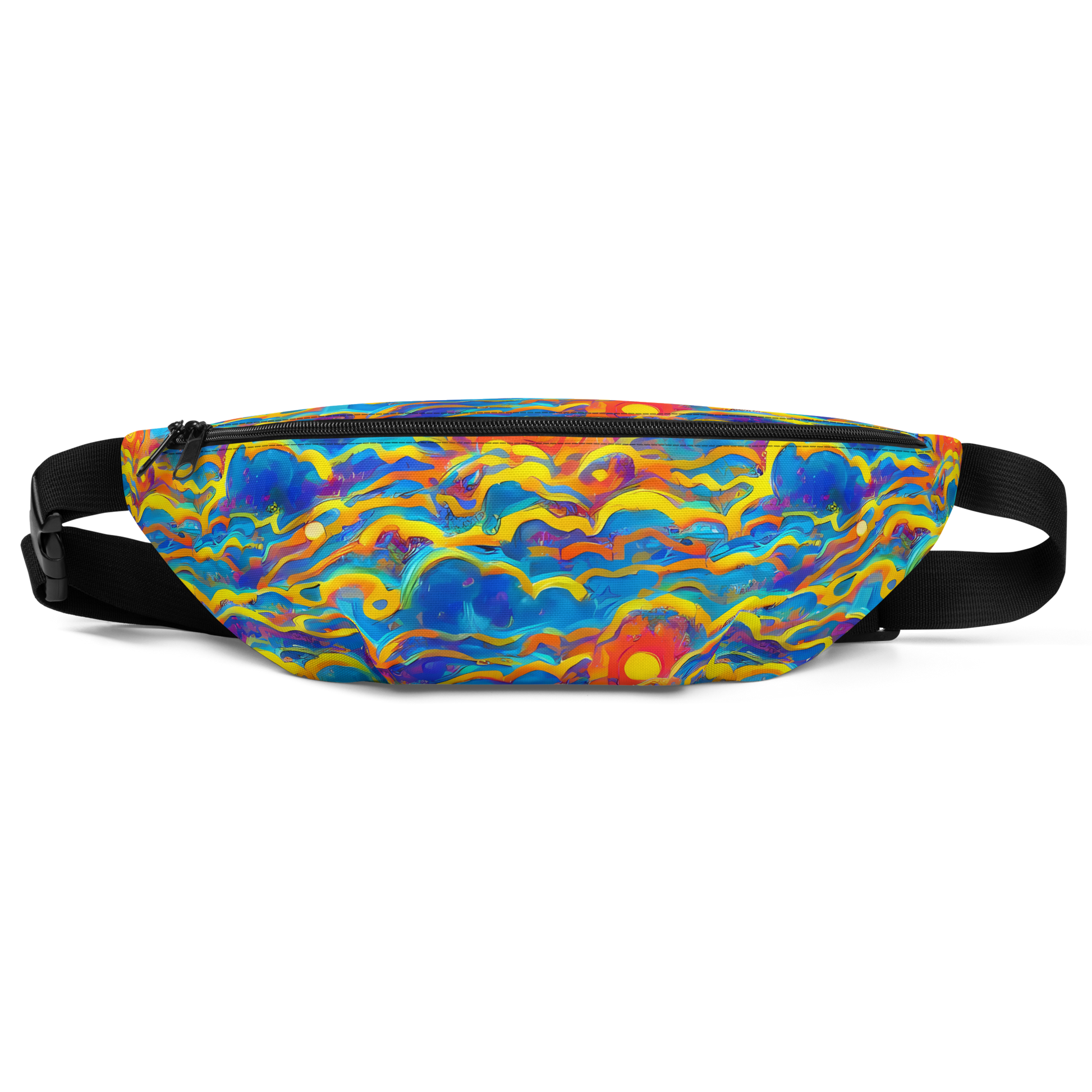 Step into the spotlight with our custom-designed fanny pack, featuring a vibrant, flowing tapestry of electric blues, sunny yellows, and fiery oranges that evoke the dynamic energy of a celestial dance. Perfect for festival wear, summer events, or making a bold, artistic statement, this accessory combines convenience and style like never before.
