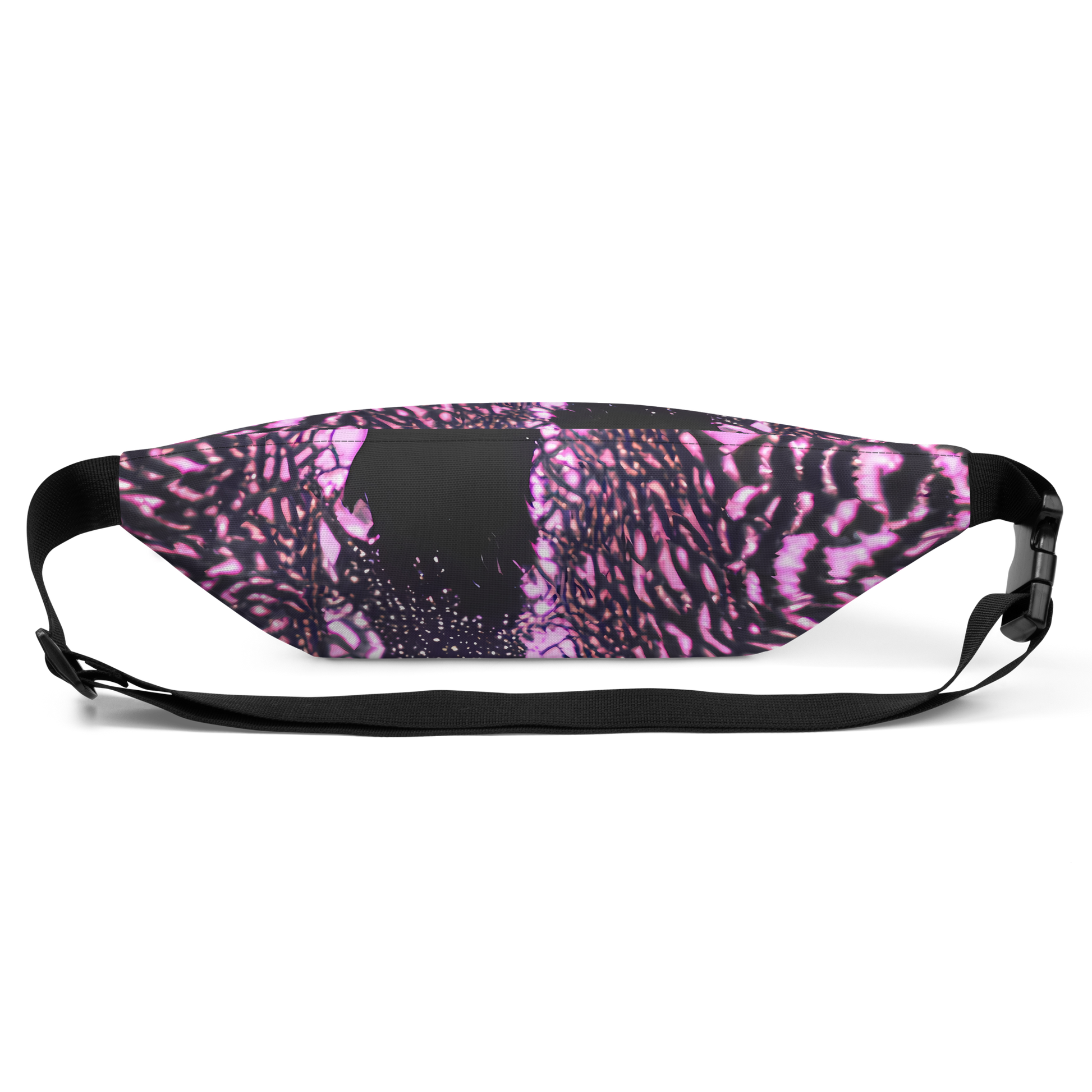 Unveil the essence of artistic mystery with our exclusive fanny pack, a canvas of deep purples and magentas that dance in abstract zebra-like stripes. The design evokes a sense of movement and depth, while a solitary figure, shrouded in a constellation of dots, invites introspection and allure. This piece isn't just an accessory; it's wearable art that captures the provocative and ethereal spirit for those who dare to stand out at avant-garde events and fall gatherings.