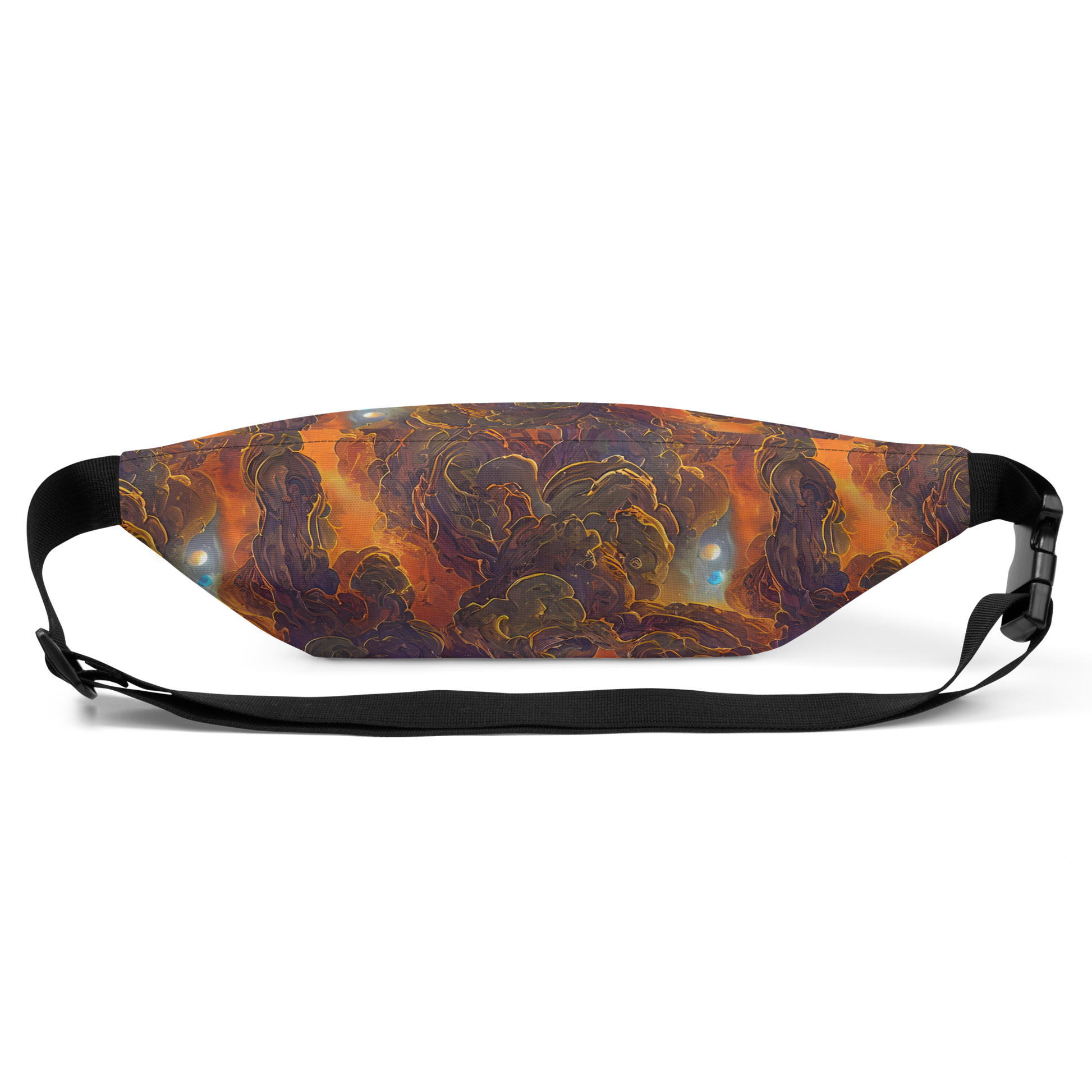Embark on an artistic odyssey with our exclusive fanny pack, cloaked in the mesmerizing swirls of our latest pattern that captures the essence of cosmic baroque artistry. Deep amber spirals entwine with midnight blue in cloud-like formations, creating a warm, vibrant accessory that's as functional as it is a masterpiece. This fanny pack is not just an item; it's wearable art that resonates with the spirit of grand frescoes and modern imagination, perfect for those who dare to stand out.