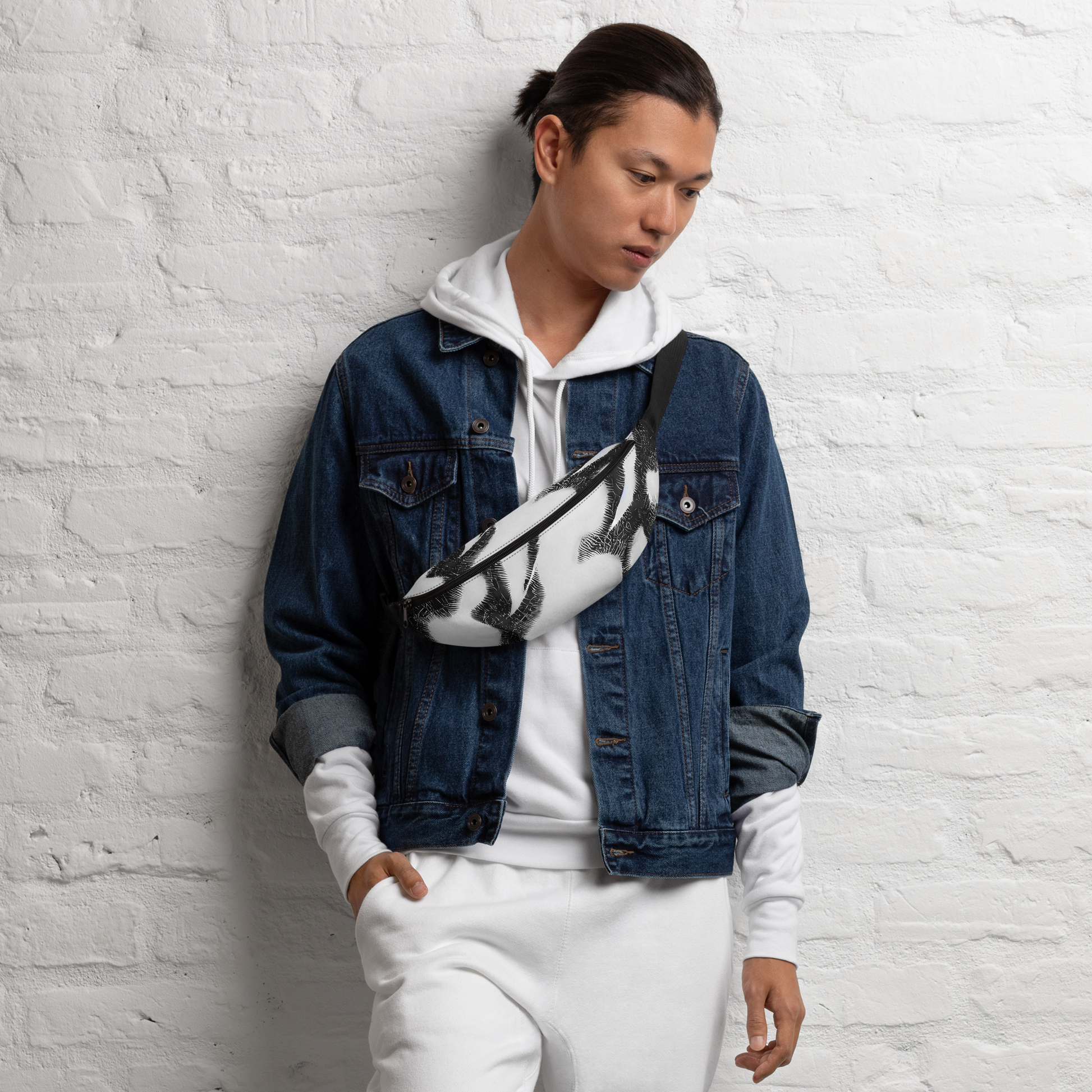 Step into the spotlight with our avant-garde fanny pack, where functionality meets the essence of modern artistry. Inspired by the pioneering vision of light and shadow, this accessory features abstract white shapes that weave an enigmatic dance over a textured black canvas. The stark contrast of the monochrome design makes a bold statement, perfect for anyone with an affinity for art and the drama of surrealism. Ideal for making an impression at gallery openings or standing out in the creative industry, this fanny pack is a year-round companion for the fashion-forward individual.