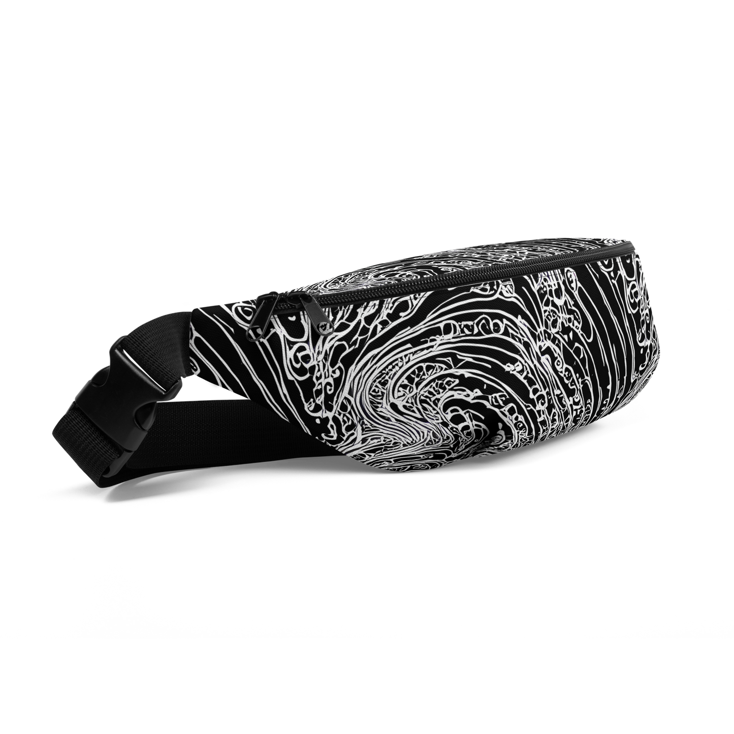 Embark on an interstellar fashion journey with our "Stellar Tsunami" fanny pack, where cosmic wonder meets earthly practicality. Wrapped in a hypnotic pattern of swirling black and white lines, this accessory captures the tumultuous beauty of a celestial wave, with a nod to Hokusai's legendary artistry. A monochrome masterpiece, it's the ultimate statement piece for the daring soul, ready to turn heads at music festivals or to add a splash of avant-garde to any outing.