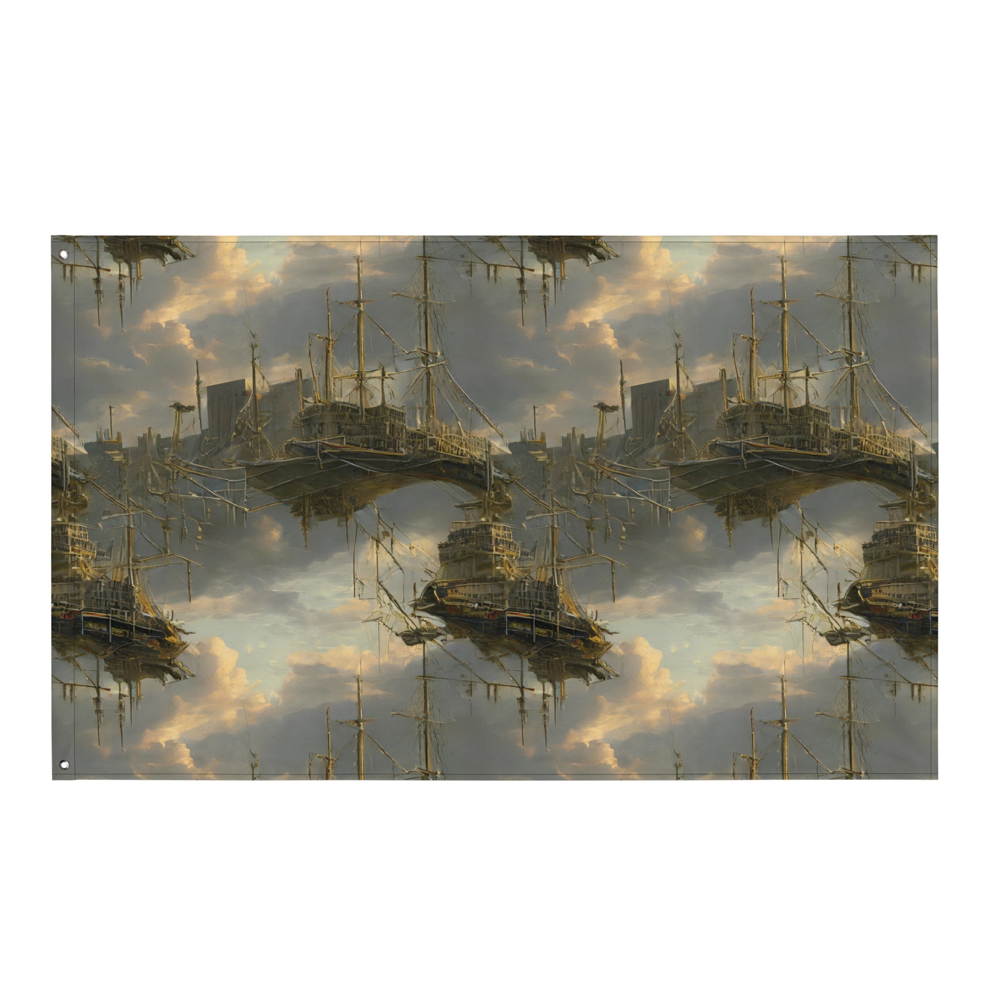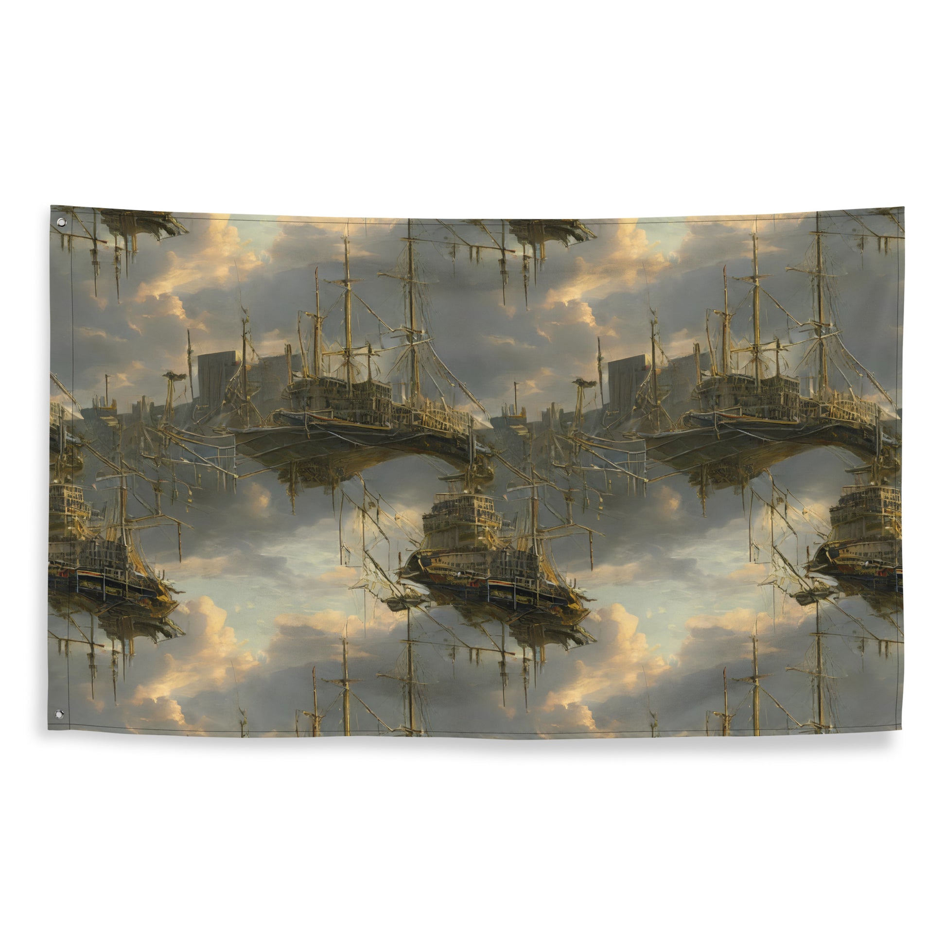 Transform your living space into a realm of adventure and imagination with our "Ethereal Armada" flag. This stunning piece features a captivating blend of steampunk and digital fantasy, showcasing intricate ship silhouettes drifting through a dreamy landscape of swirling clouds in muted gray, gold, and blue. Perfect for those who crave a bold statement, this flag will elevate your decor and inspire your spirit, making it an ideal addition for tech-inspired gatherings or avant-garde art events. Crafted from durable polyester, it promises to maintain its beauty without creasing or shrinking, ensuring it remains a striking focal point in your home for years to come.