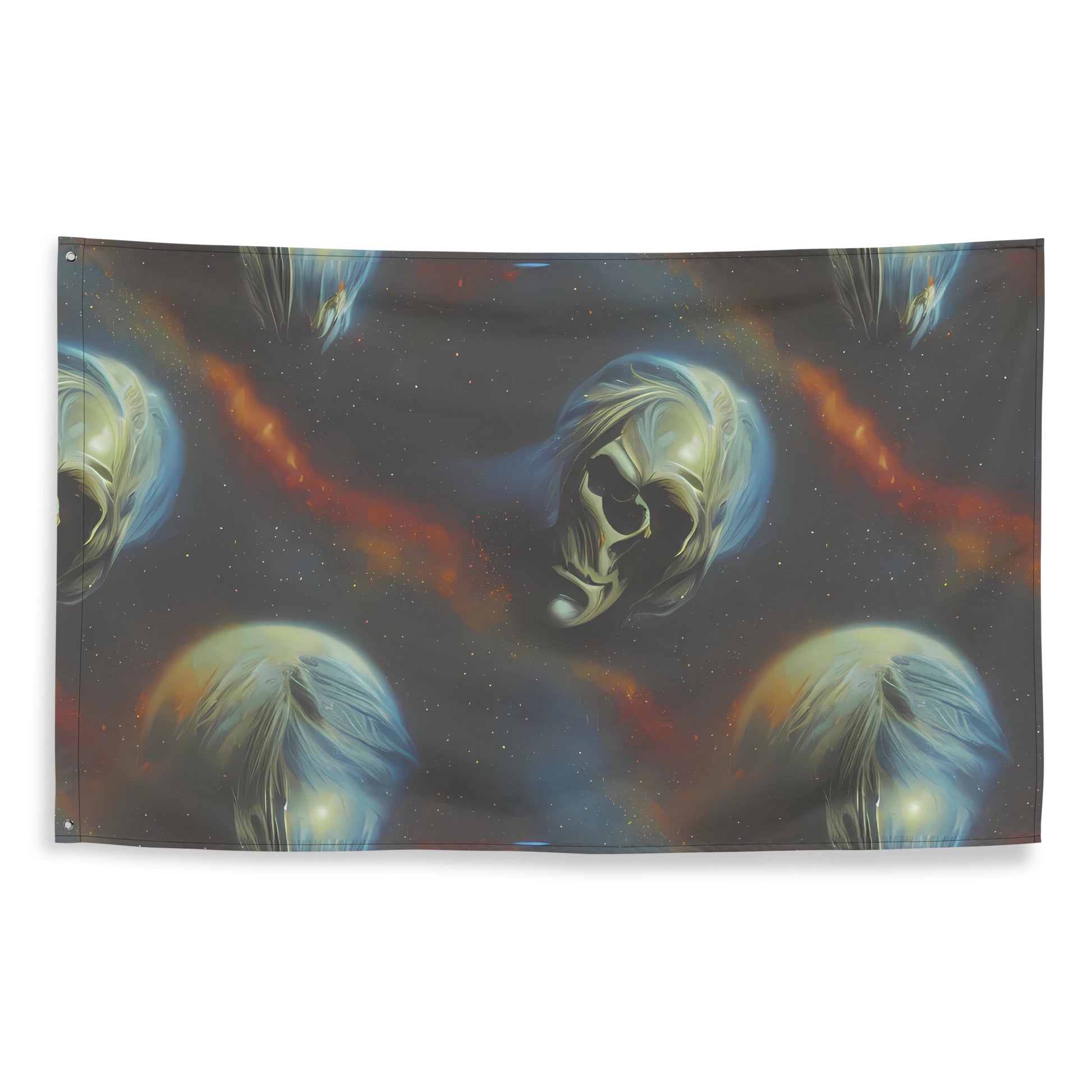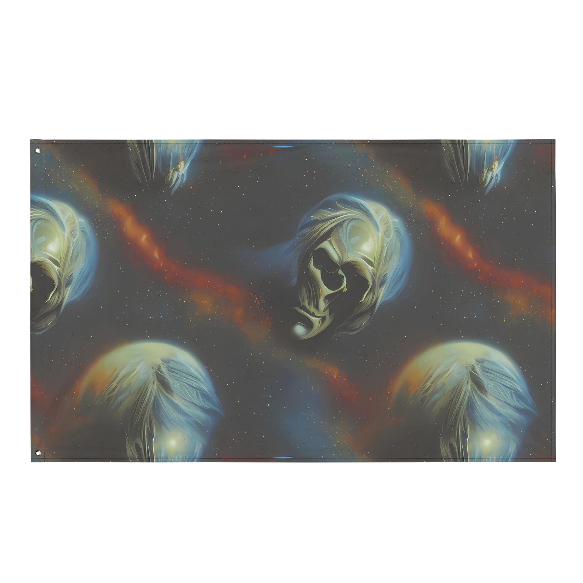 Transform your living space into a celestial sanctuary with our "Ethereal Echoes" flag. This stunning piece showcases a captivating blend of cosmic nebulas in midnight blue and fiery orange, harmoniously intertwined with serene, pearl-like faces that evoke the elegance of classical sculptures. Perfect for evening events or creative gatherings, this flag not only adds a touch of mystery and timelessness to your décor but also reflects your unique style. Made from durable polyester, it promises to remain vibrant and crease-free for years to come!