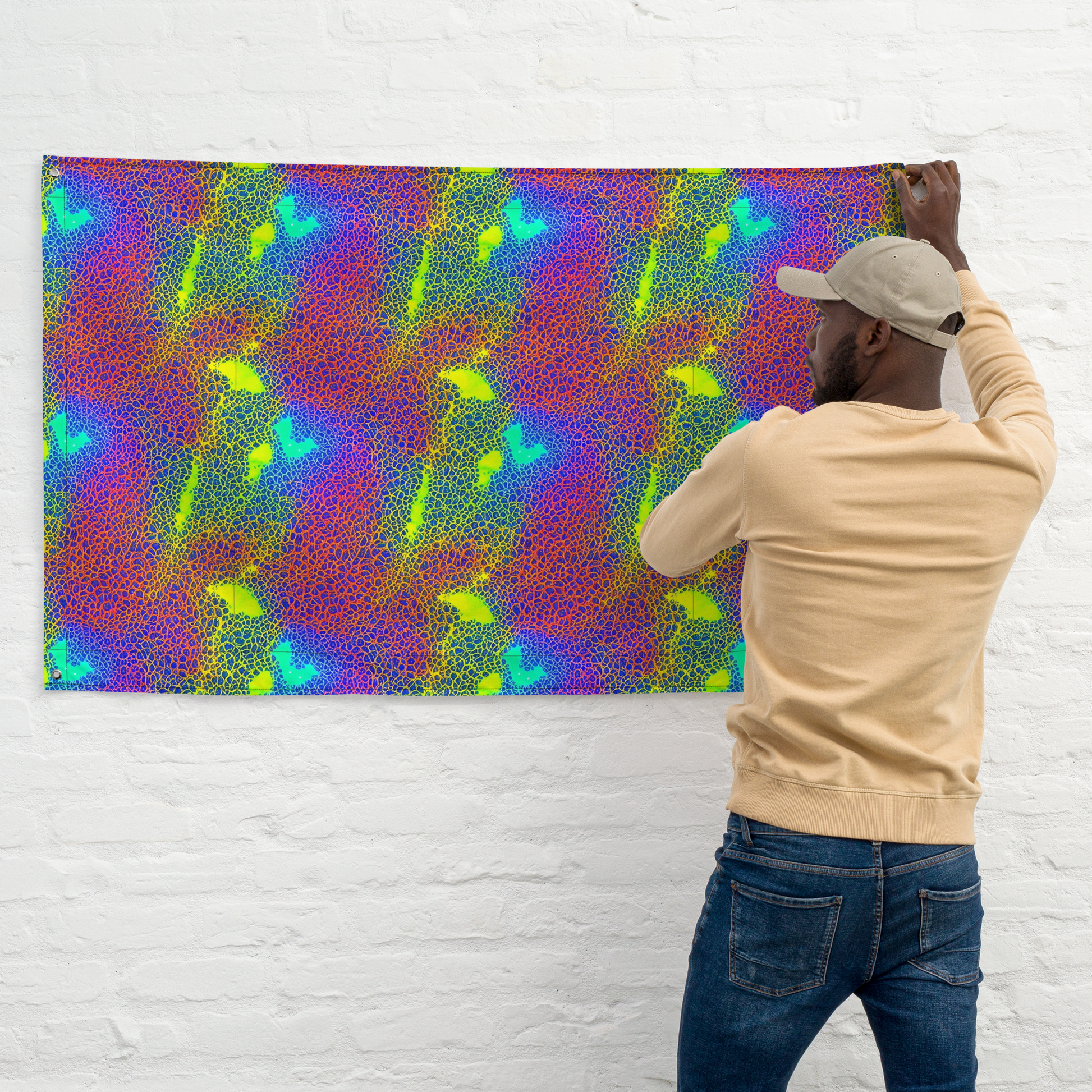 Transform any room into a vibrant sanctuary with our eye-catching flag, featuring a mesmerizing array of interlocking shapes in neon blues, yellows, and greens set against a deep red-orange backdrop. This psychedelic vision of cellular structures is a visual feast, perfect for those who love to stand out with a lively and energetic flair. Ideal for music festivals, summer gatherings, or any space that celebrates uniqueness, this flag captures the essence of a dynamic and youthful spirit, all year round. Embrace the boldness without saying a word – this design speaks volumes on its own.