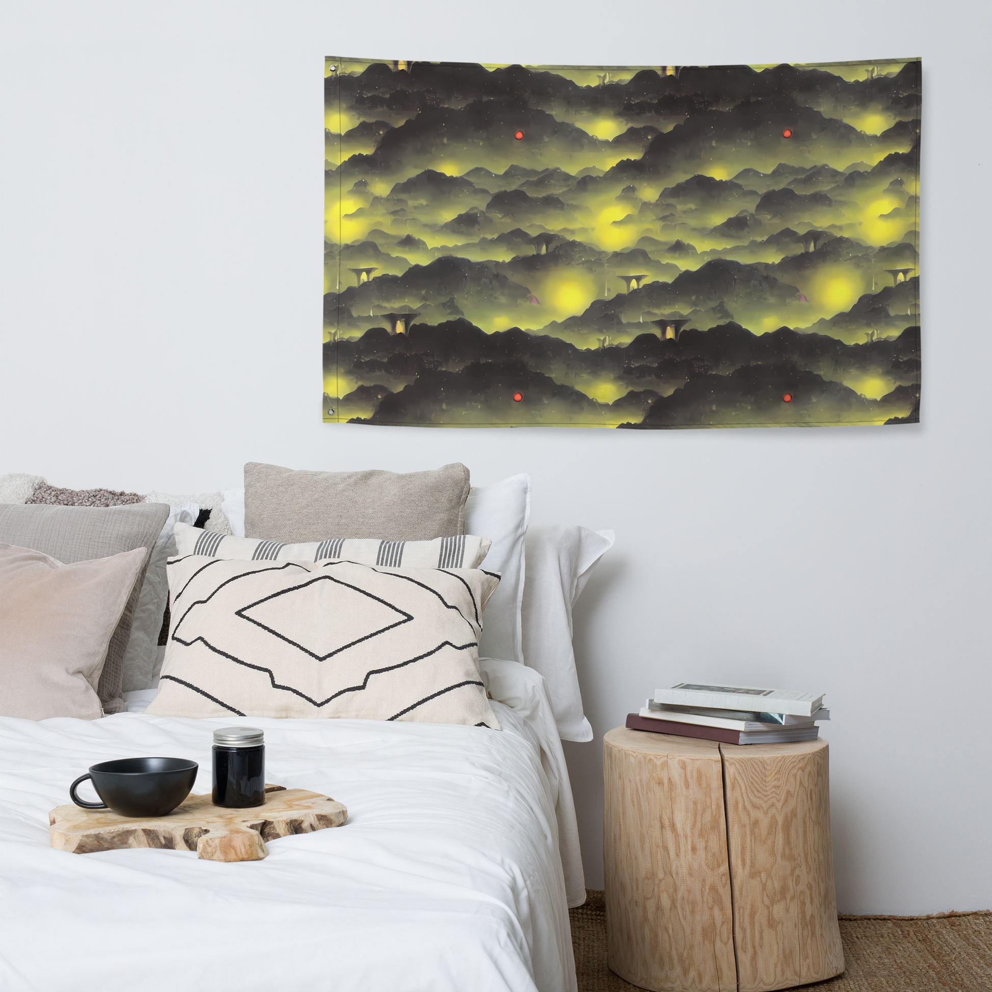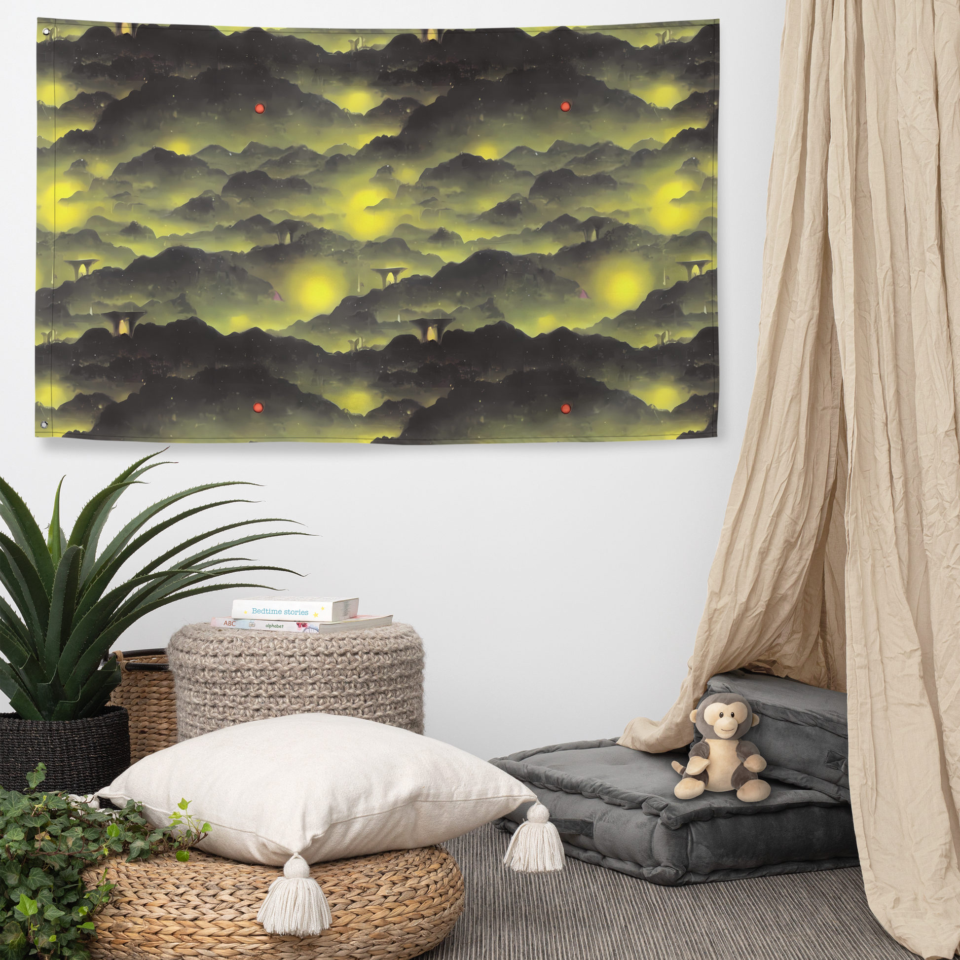 Transform your living space into a realm of mystical allure with our unique flag, featuring a design that captures the essence of a dreamlike landscape. Luminous yellows intertwine with deep greys to create ethereal textures and haunting silhouettes, reminiscent of enigmatic symbolism and the beauty found in the otherworldly. Ideal for those with a soulful imagination, this flag serves as a perfect statement piece for avant-garde events or reflective moments on an introspective autumn evening. Crafted with care, it promises to enchant your wall with its timeless elegance.