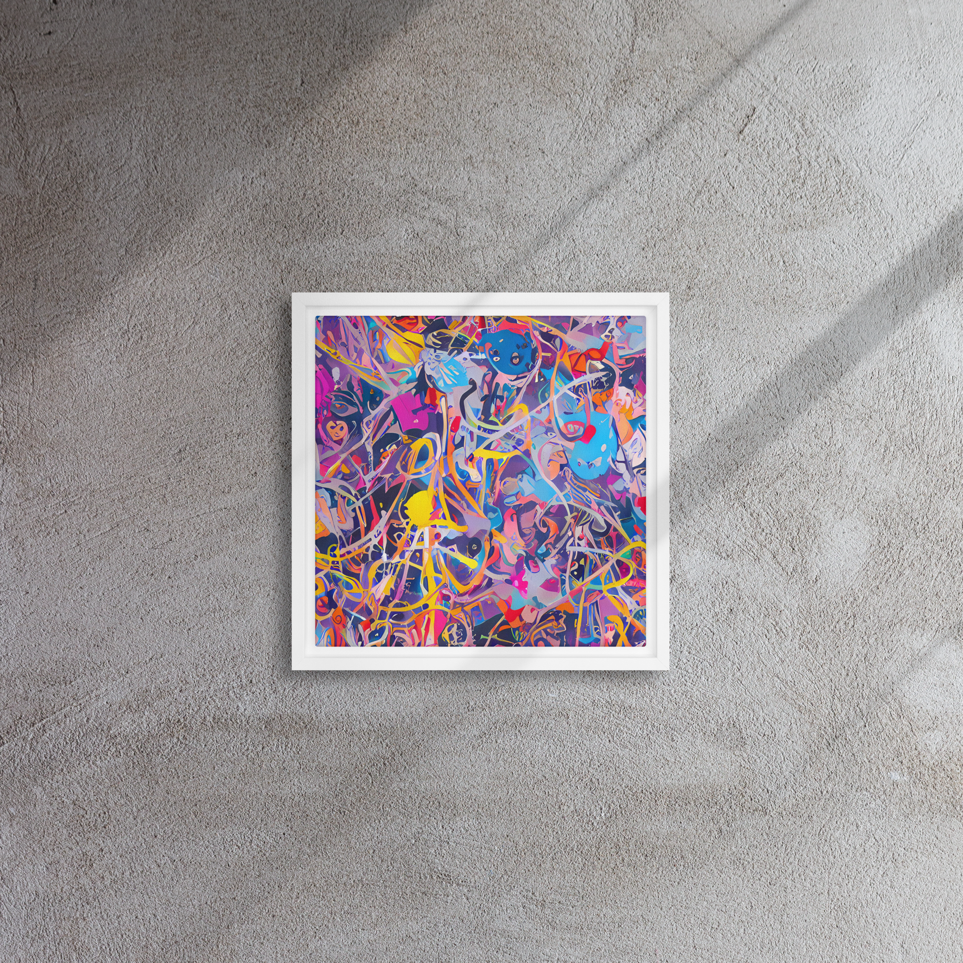 Transform your living space with this electrifying framed canvas, featuring a vibrant fusion of abstract expressionism and pop art. The whirlwind of bold, intertwining shapes and lines in electric blues, fiery reds, playful pinks, and sunny yellows infuses any room with chaotic joy and energetic movement. Perfect for art lovers and those with a creative, confident personality, this head-turning piece is sure to make a statement. Handmade with a high-quality pine tree frame, it comes with rubber pads on the back corners and a hassle-free wall mount, giving the canvas a cool floating effect that enhances its dynamic composition.