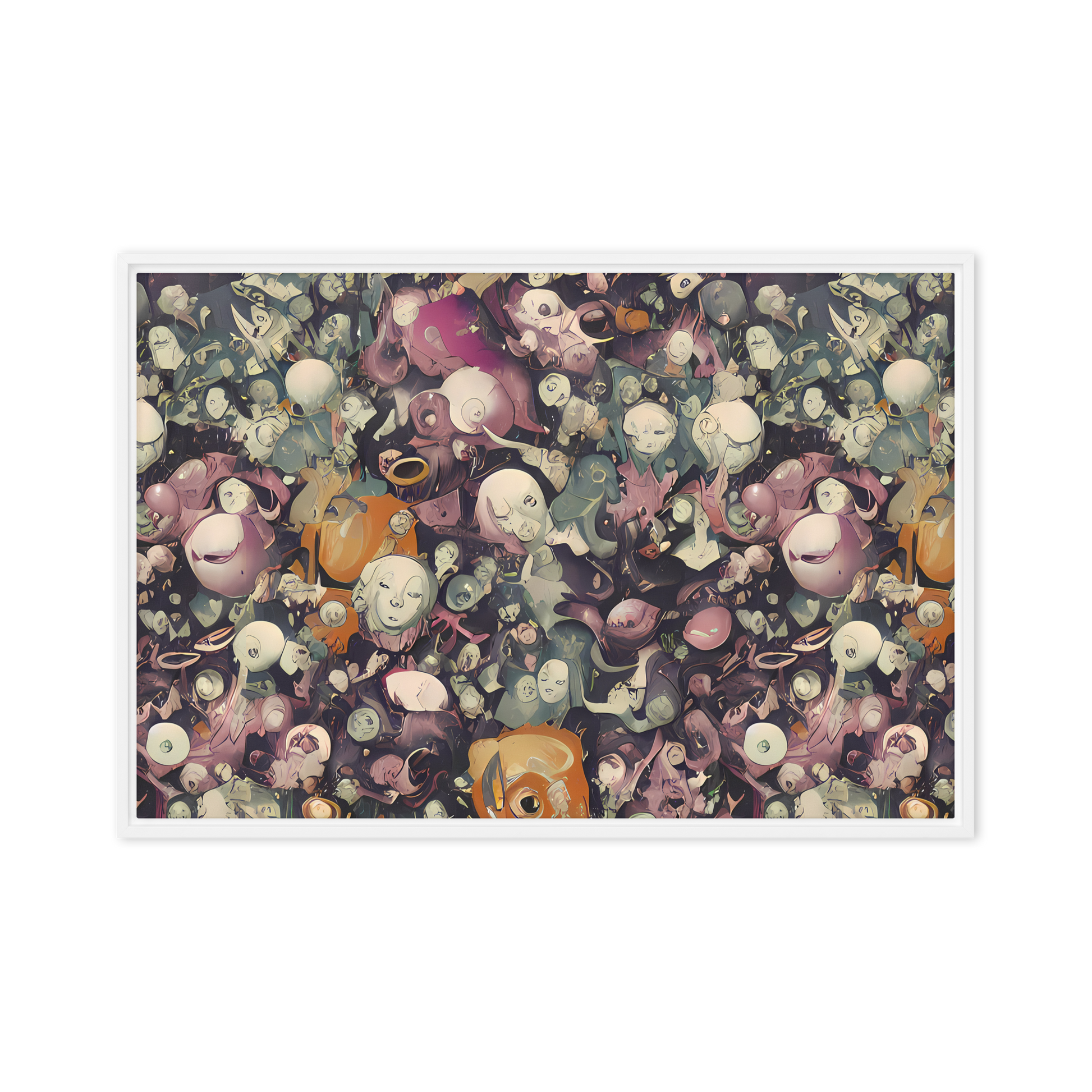 Transform your space with the captivating allure of our "Visions of the Unseen" Framed Canvas. This exquisite piece features a mesmerizing tapestry of surreal faces and abstract forms, bathed in deep purples, muted blues, and warm oranges. Evoking a dreamlike emotion reminiscent of an otherworldly carnival, it's perfect for avant-garde art enthusiasts and those who appreciate bold, introspective decor. The high-quality pine tree frame offers a stylish floating effect, ensuring this artwork becomes a conversation starter in any room. Embrace the imaginative and introspective with this standout choice for the creative soul.