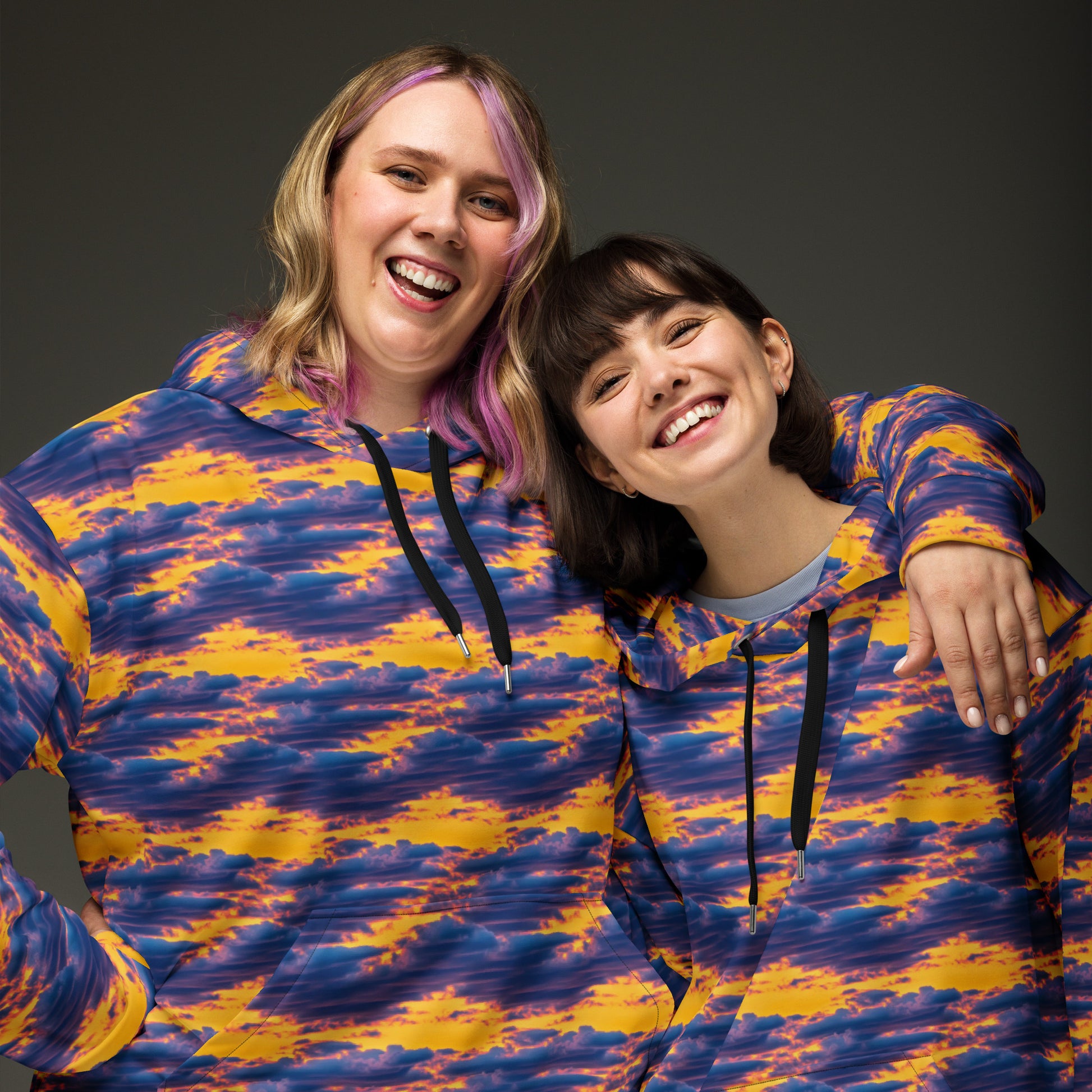 Embrace the enchanting allure of twilight with our "Aubergine Clouds" Hoodie, a stunning fusion of dreamy sunset hues that effortlessly blend deep purples, rich aubergines, vibrant oranges, and soft yellows. This unique piece wraps you in warmth and style, evoking the serene beauty of a dusk sky, making it the perfect companion for evening gatherings or art gallery openings. With its plush feel and eye-catching design, this hoodie is not just a garment; it's a statement of introspection and boldness. Elevate your wardrobe with this one-of-a-kind piece today!