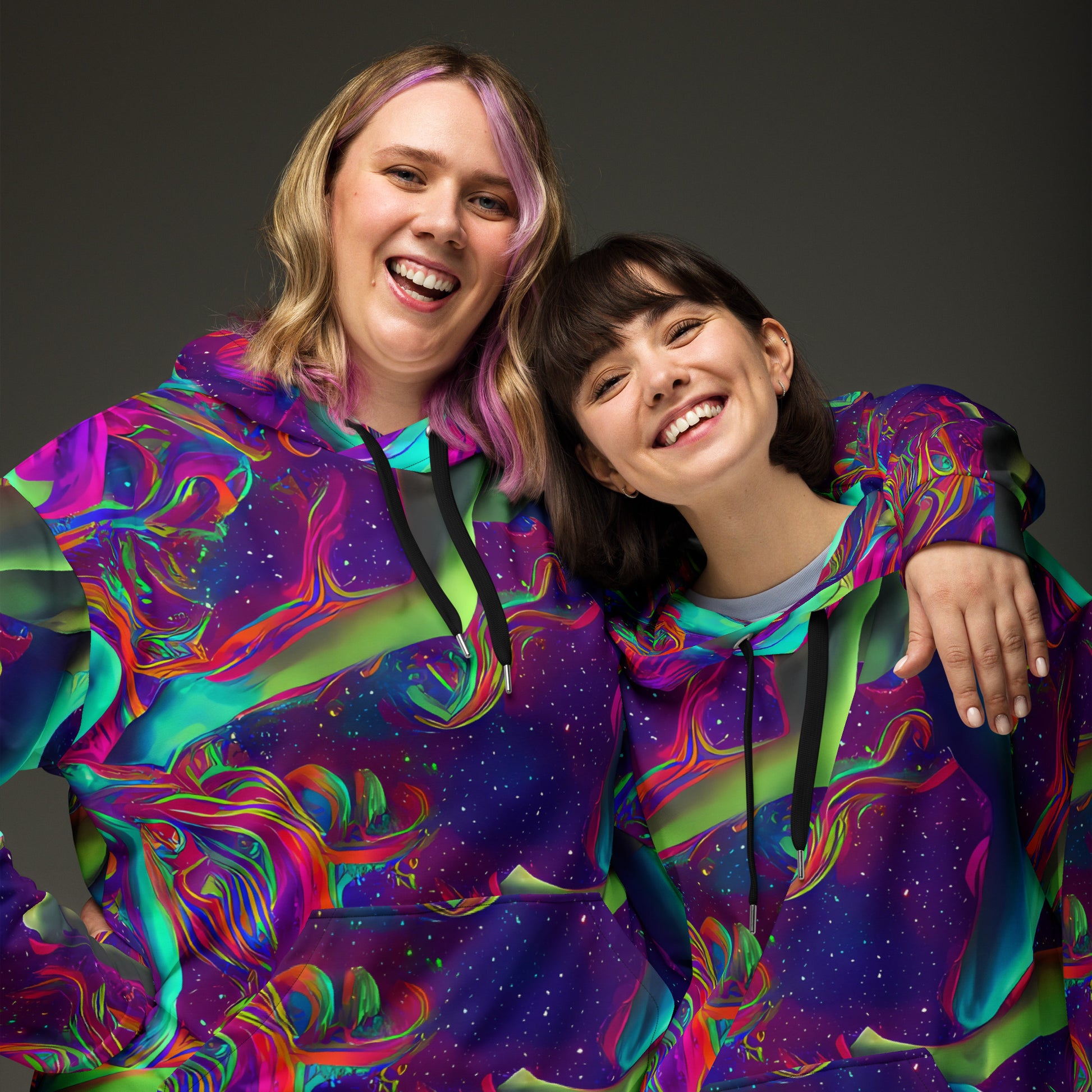 Step into a world of vibrant creativity with our "Carnevale Cosmos" unisex Hoodie! This eye-catching piece features a stunning tapestry of swirling neon blues, greens, and pinks against a cosmic backdrop, perfect for those who dare to express their artistic spirit. Whether you're dancing at a summer festival or making a bold statement at an avant-garde evening event, this hoodie wraps you in plush comfort while showcasing your unique style. Dare to shine and embrace your inner artist!