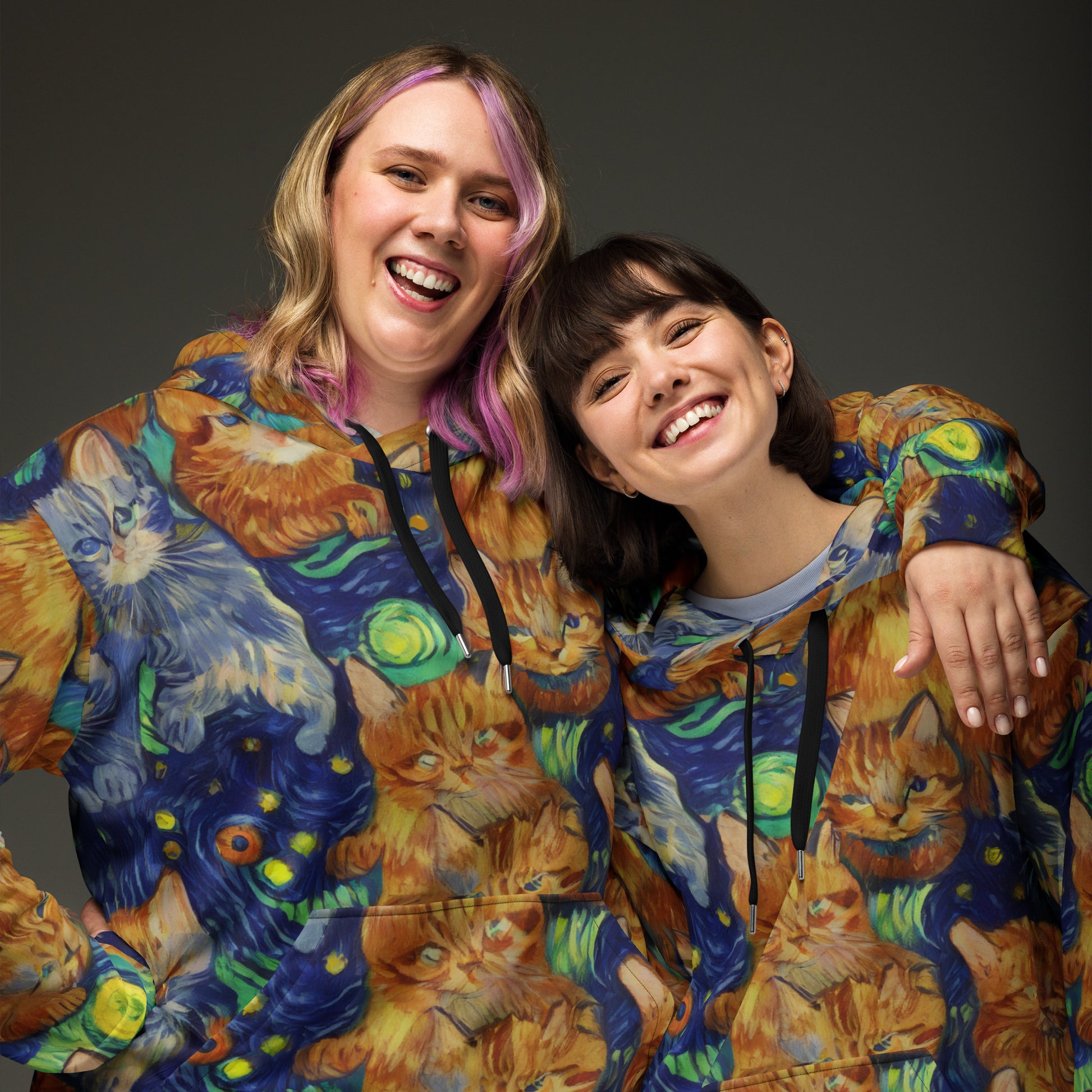 Step into the cosmos with our "Celestial Claws" unisex Hoodie, where art meets comfort! This stunning piece features a mesmerizing tapestry of swirling cosmic blues and greens, interwoven with the warm, fiery tones of ginger and tabby cats, evoking the enchanting spirit of a Van Gogh masterpiece. Perfect for the bold and imaginative, this hoodie not only wraps you in cozy warmth but also makes a striking statement at any avant-garde gallery opening or chic autumn soirée.