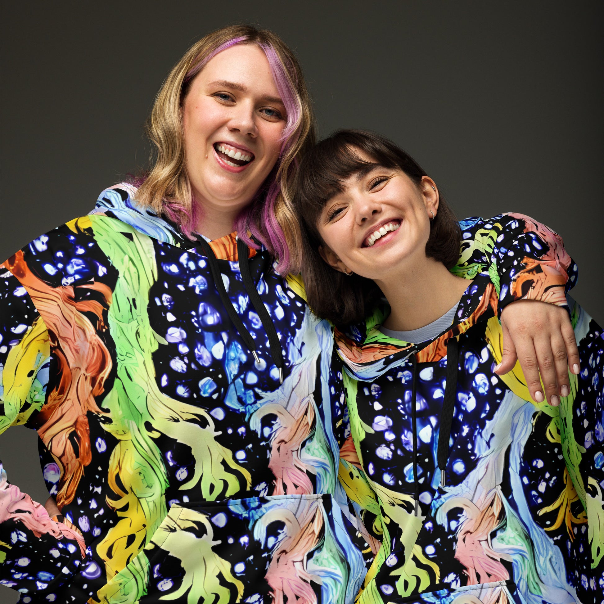 Step into a world of vibrant artistry with our AI-designed unisex Hoodie, featuring the stunning "Celestial Serenade" pattern. This eye-catching design, reminiscent of Filipino Lippi's ethereal touch, showcases swirling hues of fiery oranges, serene yellows, and tranquil greens against a star-speckled night sky. Perfect for making a statement at art galas or evening events, this hoodie effortlessly combines comfort and sophistication, making it a must-have for those who dare to stand out.