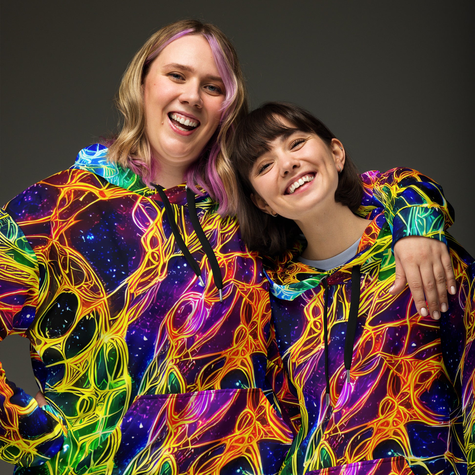 Elevate your wardrobe with our "Dancing in the Ether" unisex Hoodie, where vibrant neon hues dance with cosmic blues and purples, creating an ethereal tapestry that radiates boundless energy. This AI-designed masterpiece not only wraps you in plush comfort but also makes a bold statement at art gallery openings or avant-garde events. Embrace your unique style and let your creativity shine!