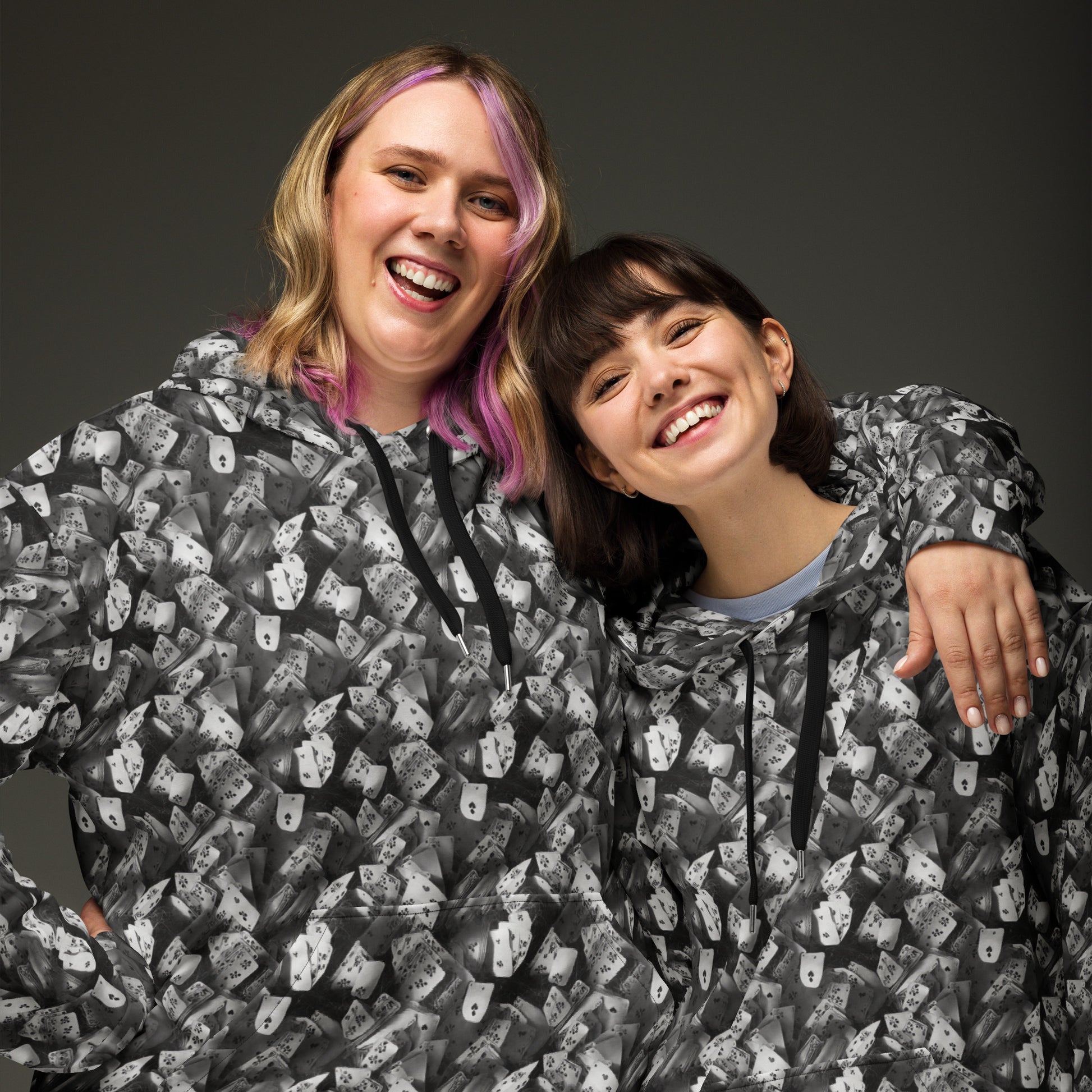 Embrace the allure of the unexpected with our "Fortune’s Folly" Hoodie, where whimsical chaos meets cozy comfort. This striking unisex piece features a captivating monochrome pattern of scattered playing cards that dances across the fabric, inviting intrigue and sparking conversation. Perfect for autumnal gatherings or avant-garde events, this hoodie is designed for those who thrive in life's delightful twists and turns. Wrap yourself in style and warmth, and let your adventurous spirit shine!