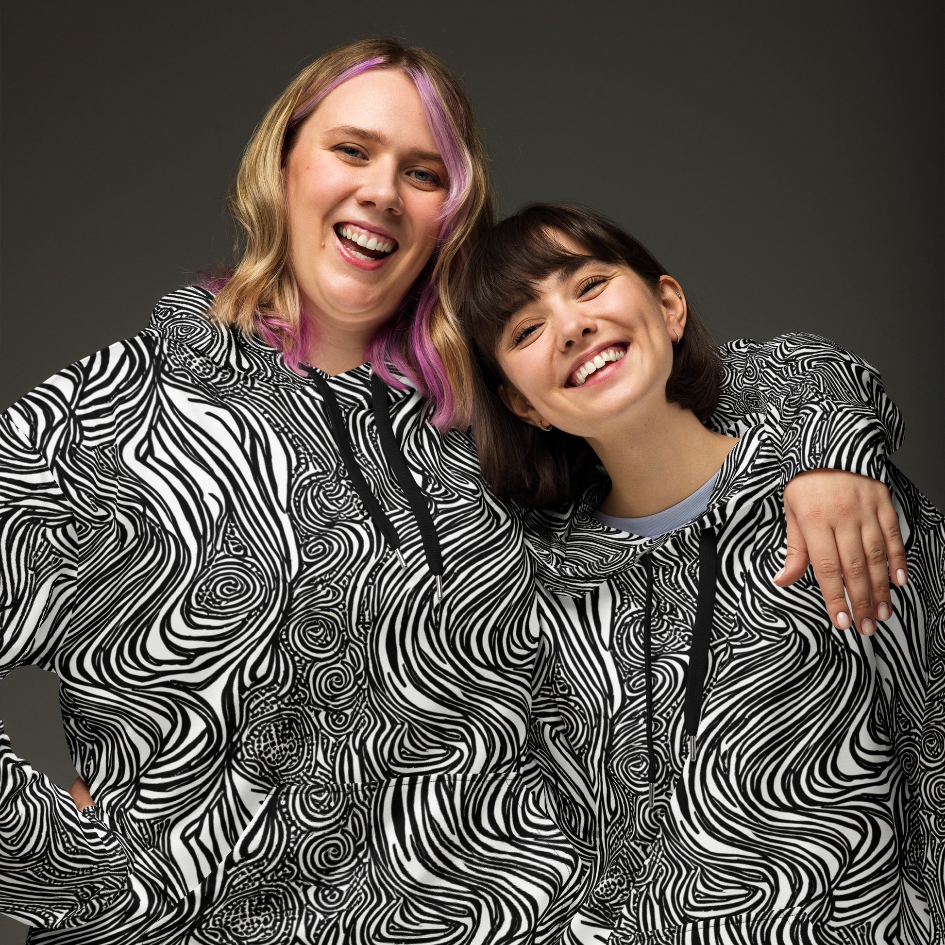 Embrace the allure of the ocean and the cosmos with our "Tidal Tangle" unisex Hoodie, where mesmerizing monochrome swirls create a stunning visual statement. Designed for those with a daring spirit, this hoodie offers not only a unique artistic flair but also unparalleled comfort. The intricate pattern evokes the fluidity of ocean currents, making it the perfect companion for avant-garde gatherings, art exhibitions, or music festivals. Wrap yourself in this bold expression of style and warmth!