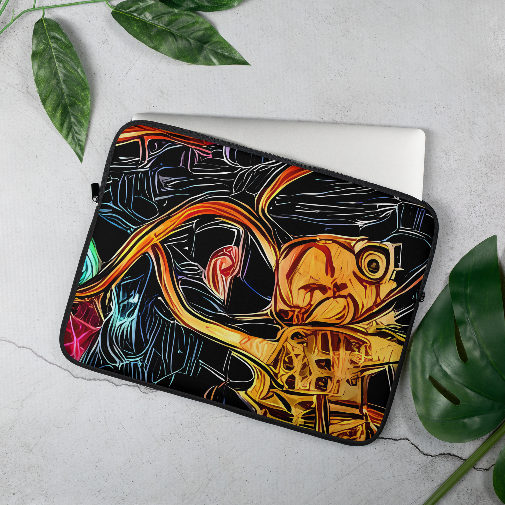 Embrace the vibrancy of the cosmos with our exclusive laptop sleeve, where neon radiance meets the mysteries of the universe. This sleeve features a mesmerizing design with neon pink, orange, yellow, and blue hues that dance against a deep black canvas, evoking the essence of cosmic abstraction. It's the perfect companion for those who dare to stand out at the most electrifying gatherings and the most imaginative of venues. Let your tech accessory be as dynamic and spirited as you are, mirroring the perpetual motion of spring and summer's zest.