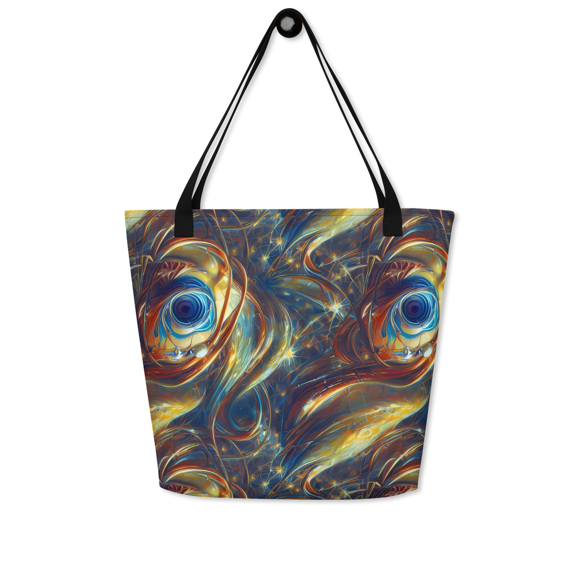 Elevate your style with our Large Tote Bag, featuring a mesmerizing pattern that swirls with deep cosmic blues, fiery oranges, and shimmering golds. This dynamic design evokes a sense of wonder and mysticism, making it the perfect accessory for avant-garde events, music festivals, or art exhibitions. Whether you're heading to the beach or running everyday errands, this tote is spacious, versatile, and uniquely you.
