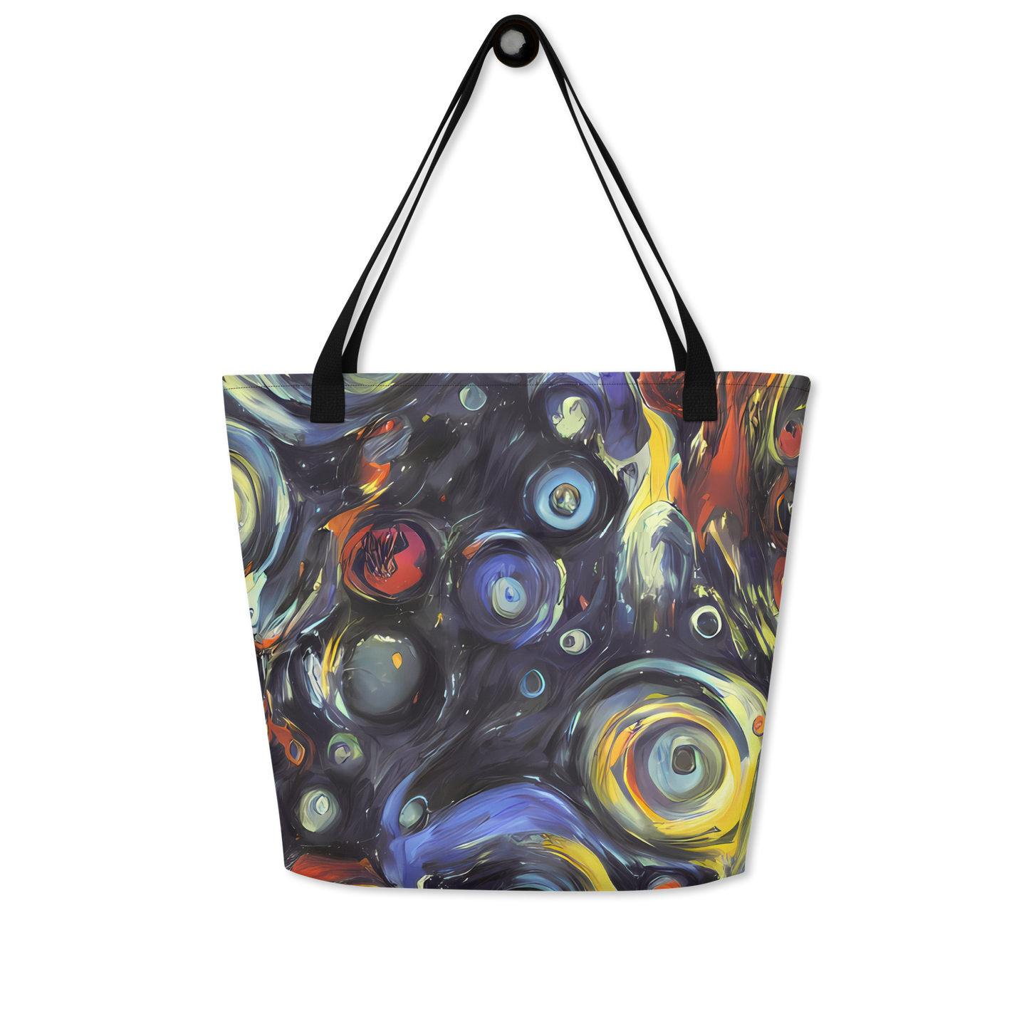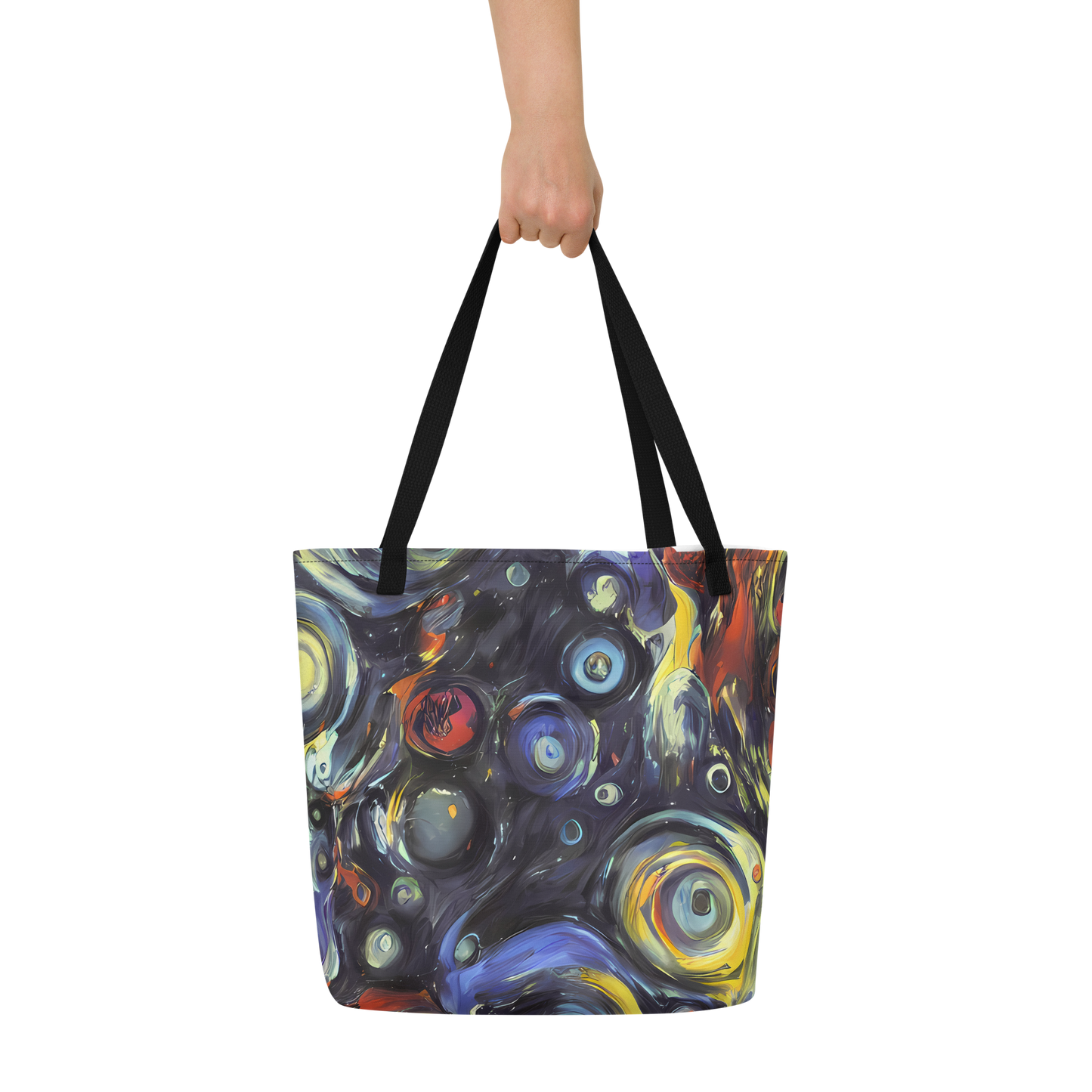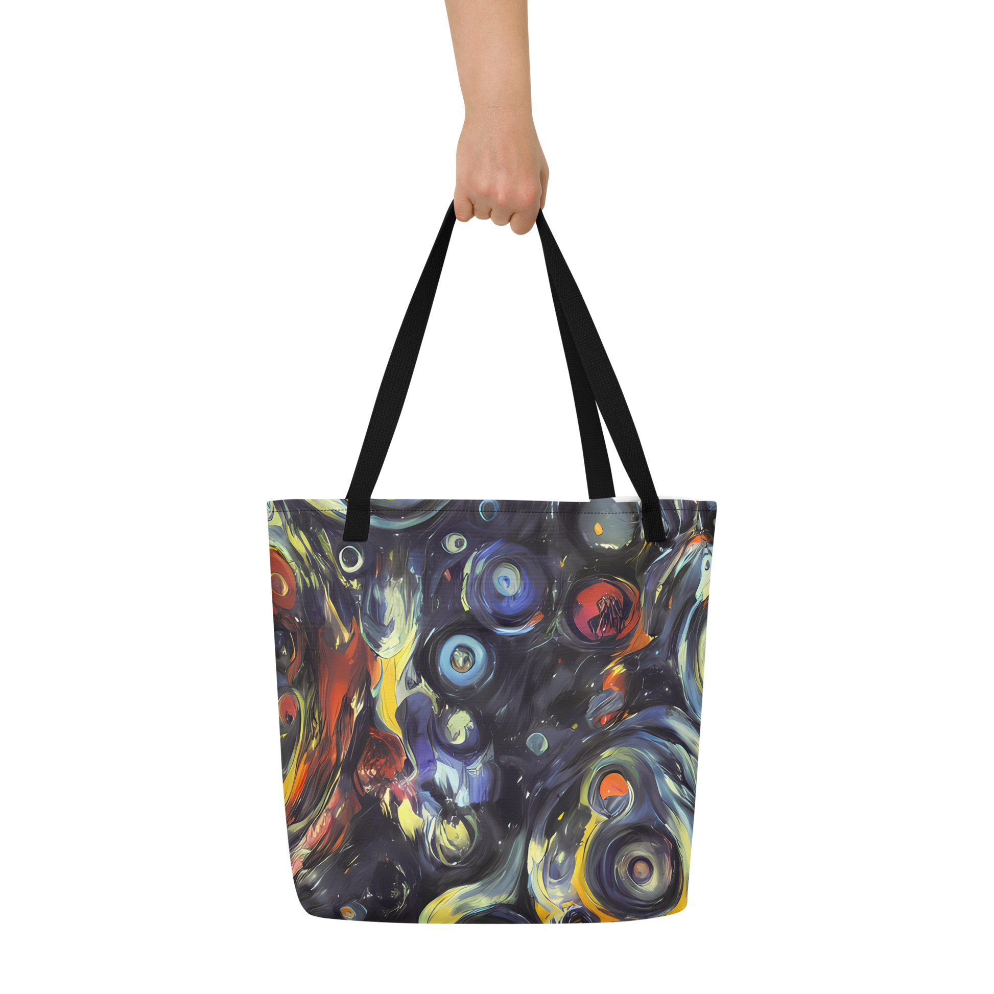 Ignite your daily ensemble with the exuberance of our Large Tote Bag featuring the exclusive "Corinthian Swirl" pattern. This AI-crafted masterpiece merges the spontaneous energy of abstract art with practical design, creating a tote that is not just a bag but a bold statement piece. Its swirls of blues, yellows, and fiery oranges are reminiscent of Lovis Corinth's expressive brushwork, designed to captivate attention and complement your unique style, whether you're at an artistic event or a casual spring or autumn gathering.
