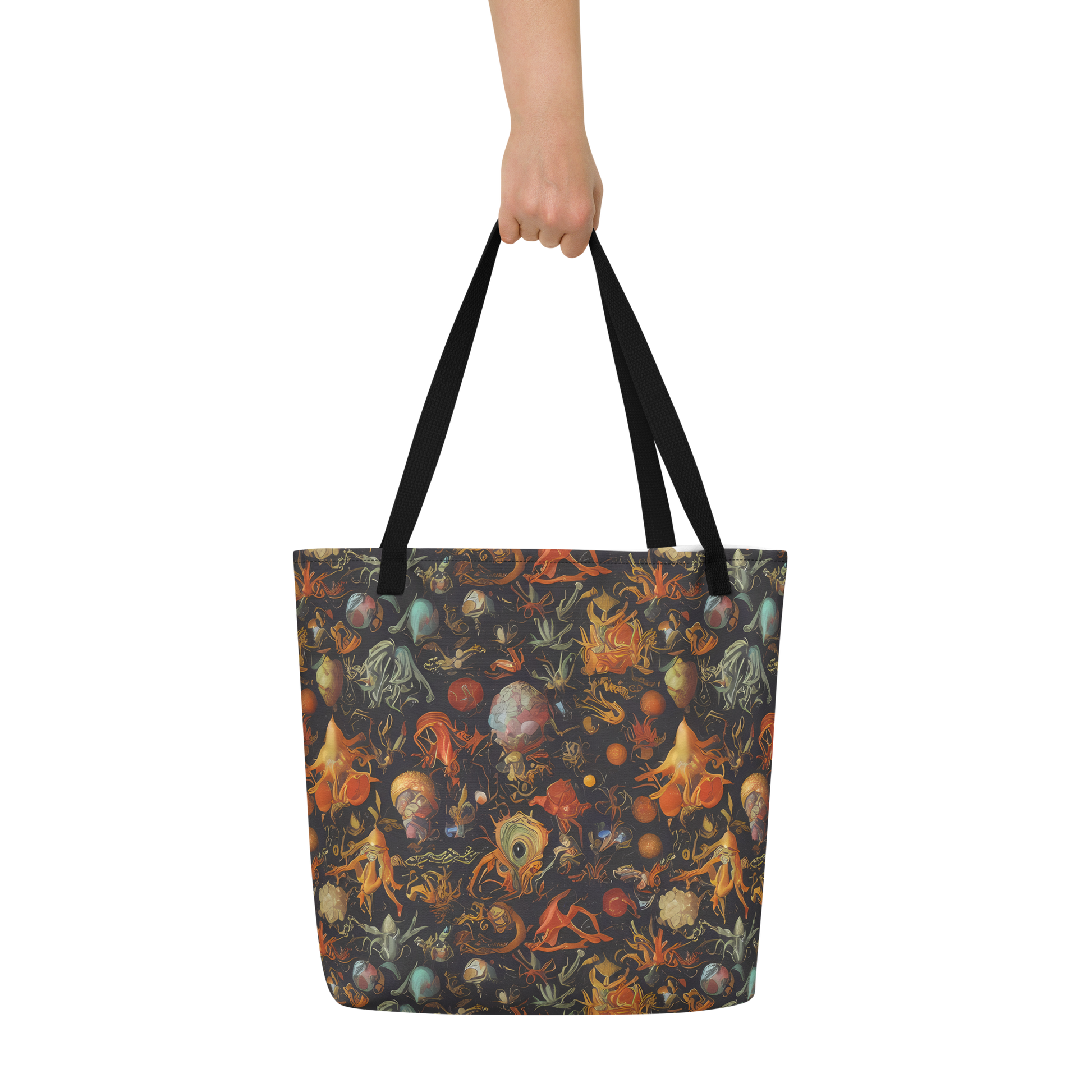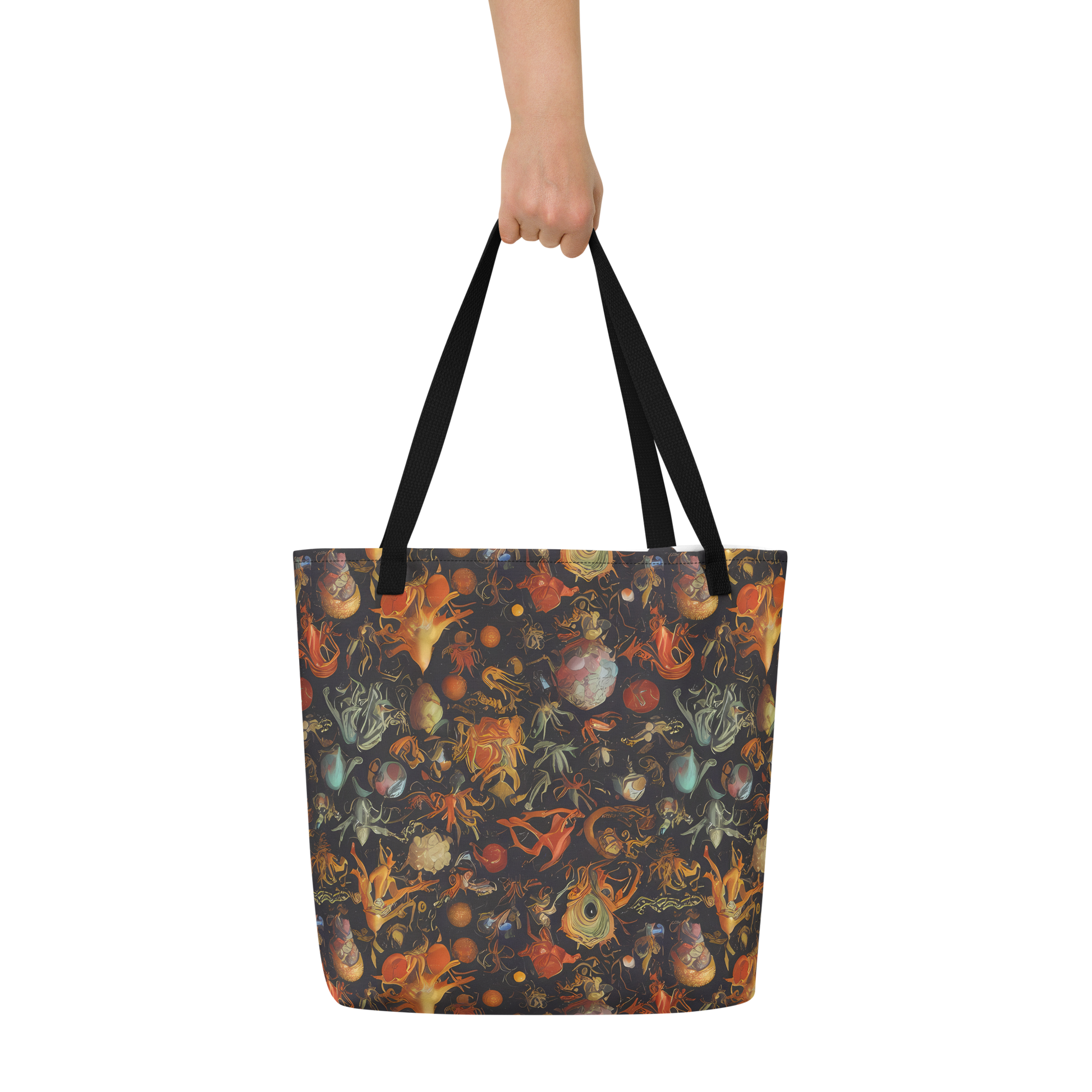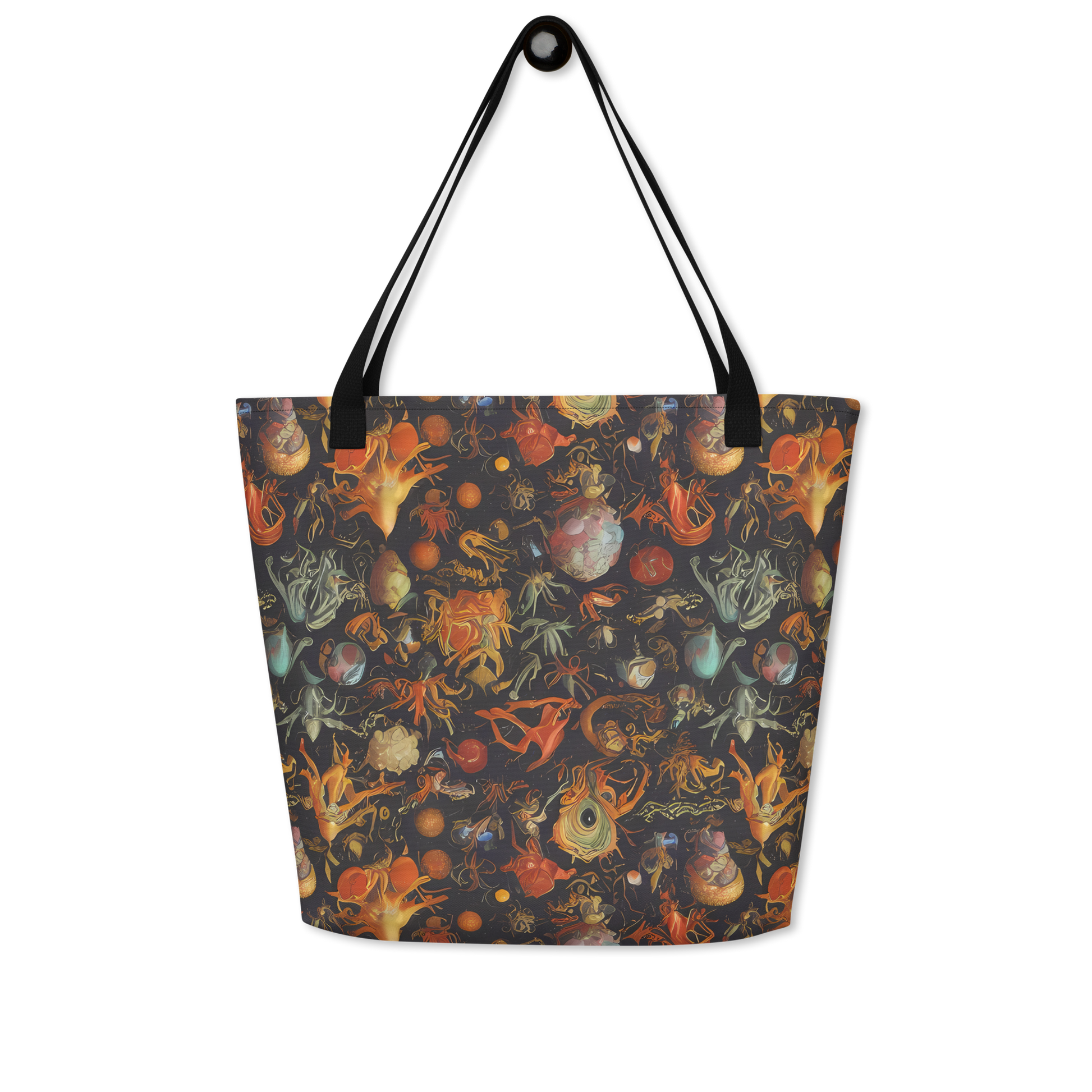 Immerse yourself in the enchanting fusion of art and cosmos with our Large Tote Bag – a fashion masterpiece that captures the essence of the Dutch Golden Age reimagined through a psychedelic lens. The intricate "Florescent Void" design features a breathtaking array of flowers, celestial orbs, and abstract shapes, all set against a deep, mysterious backdrop. This tote isn't just an accessory; it's a portable piece of art that complements your unique style and boldness, perfect for turning heads at creative gatherings or while on a casual stroll.