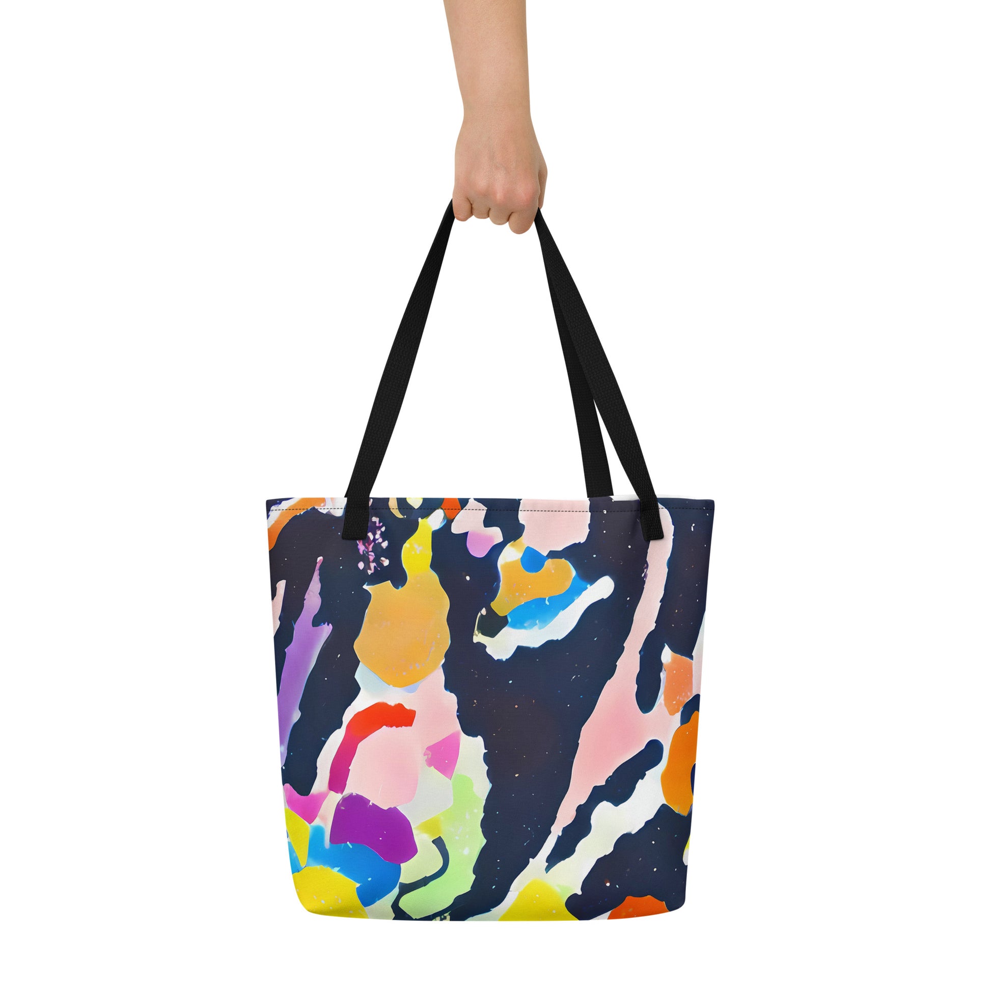 Unleash your vibrant spirit with our AI-designed Large Tote Bag featuring the stunning "Kaleido Burst" pattern! This eye-catching tote is a dazzling fusion of electric blue, fiery orange, sunny yellow, and vivid pink set against a cosmic black backdrop, making it the ultimate accessory for art gallery openings, creative festivals, or simply brightening up your everyday errands. Spacious and stylish, this tote is not just a bag; it’s a statement piece that reflects your bold personality.