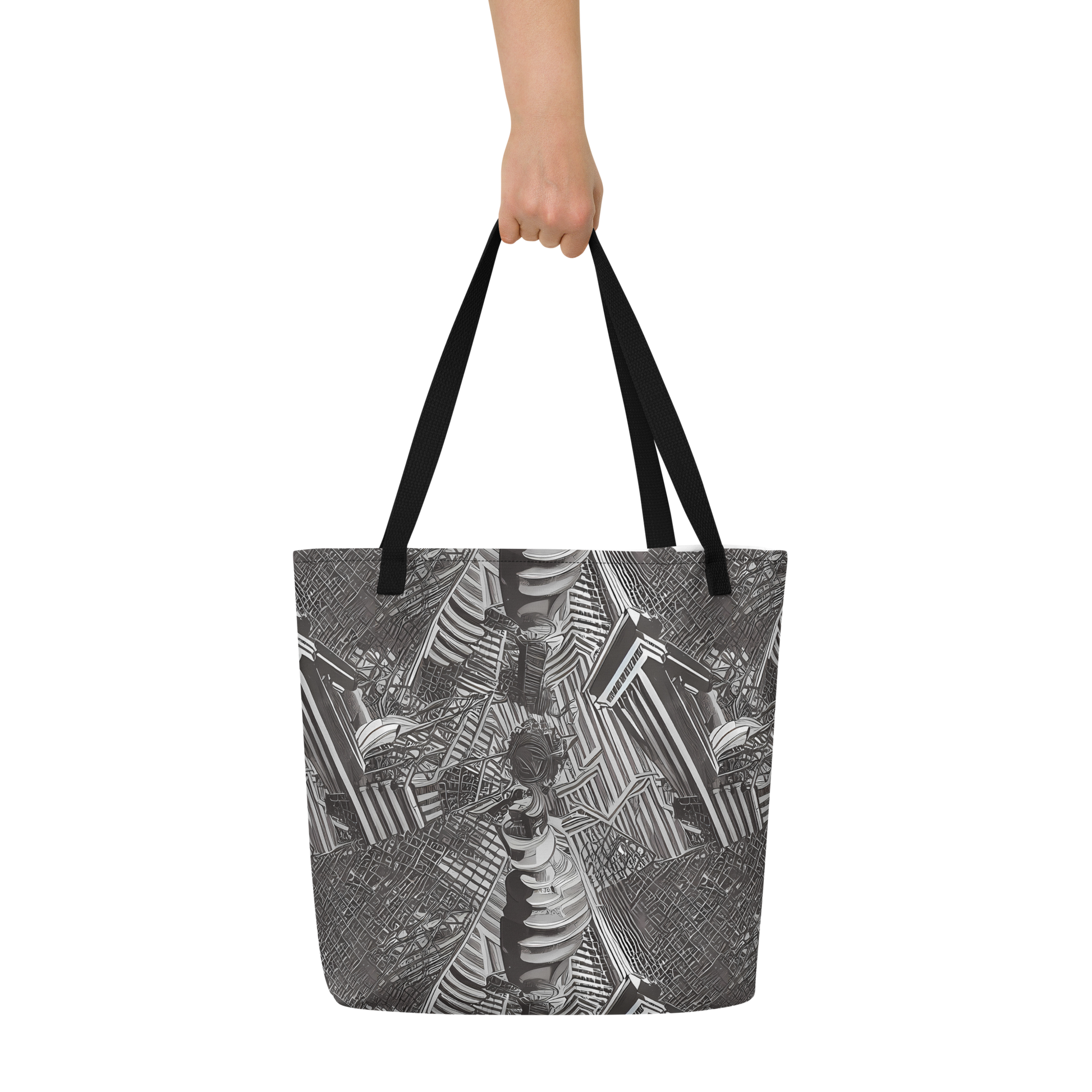 Elevate your everyday style with our AI-designed Large Tote Bag, featuring an intricate, monochromatic linework pattern with a surreal, architectural twist. Perfect for those who appreciate the grandeur and complexity of fine art, this tote is ideal for avant-garde events, art exhibitions, and urban settings. Its spacious design, durable construction, and vibrant, long-lasting colors make it your go-to accessory for beach days, errands, and beyond.