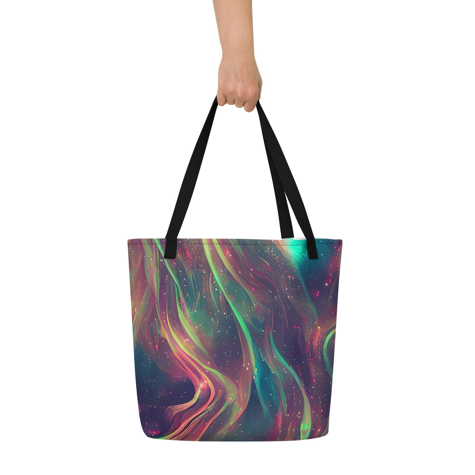 Unleash your creativity and make a bold statement with our AI-designed Large Tote Bag featuring the captivating "Temple Wave" pattern! This eye-catching design, a swirling fusion of neon teal, pink, and gold, brings a touch of cosmic fluidity to your everyday adventures. Whether you're heading to the beach or running errands, this tote not only showcases your unique style but also offers the practicality you need for all your essentials.