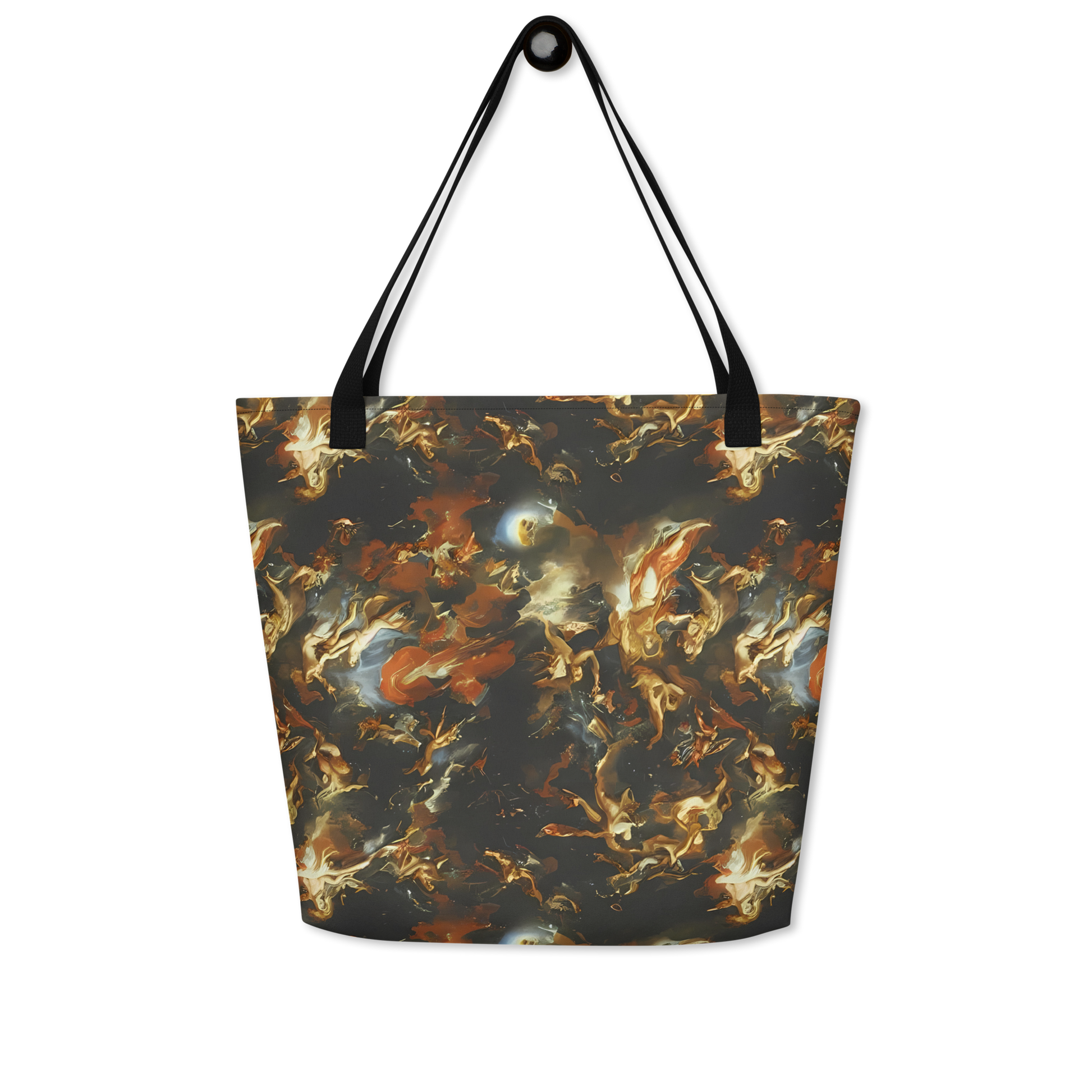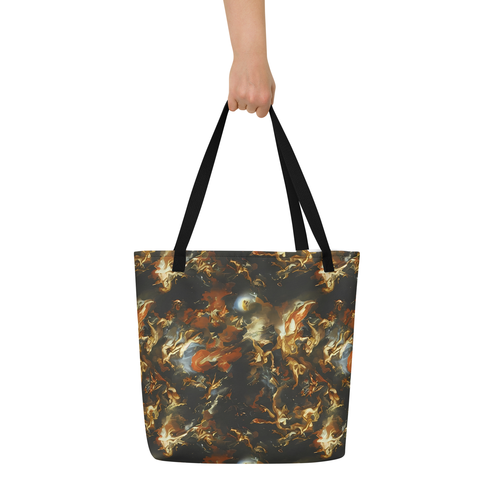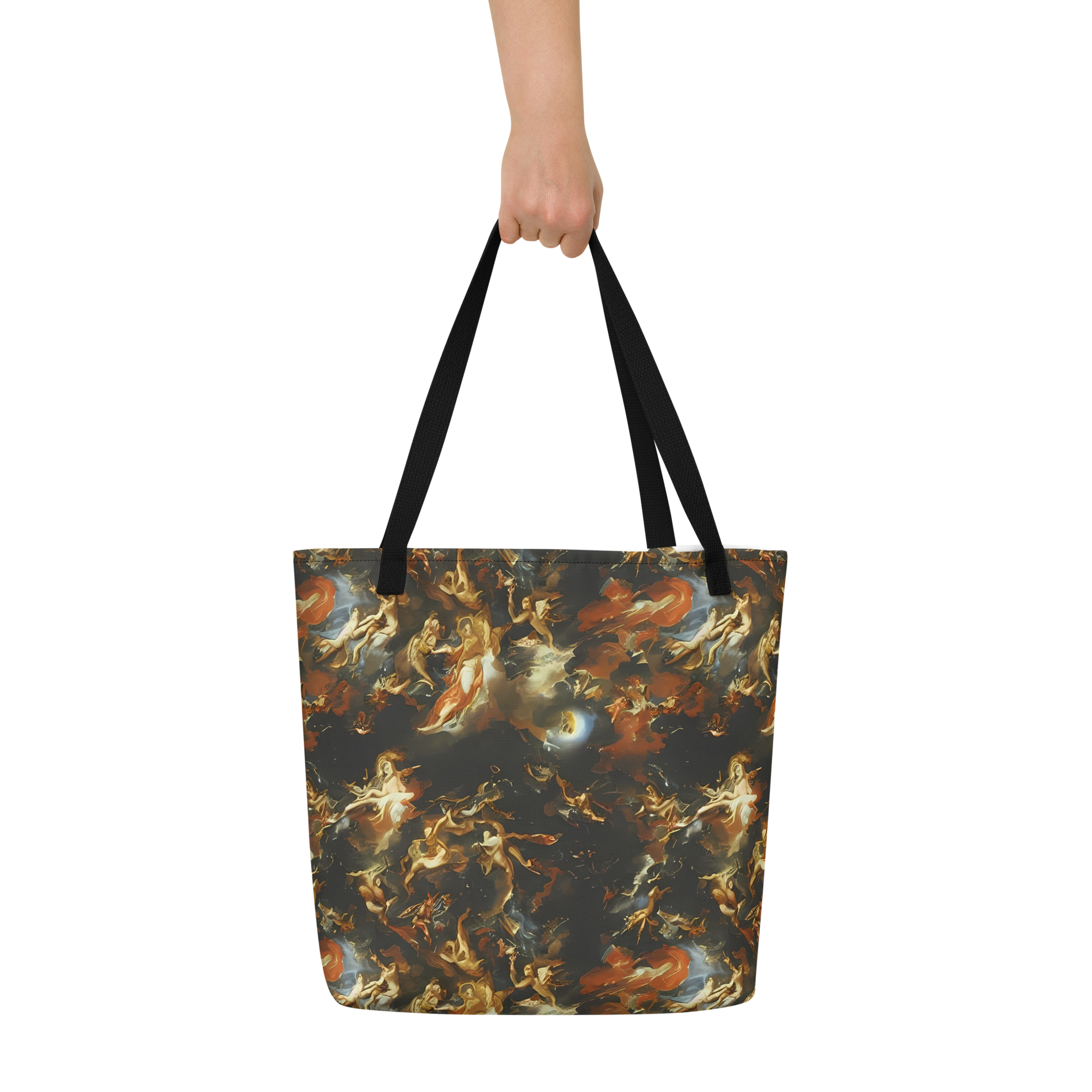 Experience the fusion of art history and celestial wonder with our Large Tote Bag, featuring a mesmerizing design that transports you to the opulence of Baroque grandeur set against the infinite canvas of the cosmos. The swirling golden, amber, and ebony tones intermingle with ethereal figures, creating a sense of a timeless journey through both art and space. Perfect for those who appreciate a touch of drama and sophistication, this tote bag promises to be the centerpiece of conversation at any evening affair.