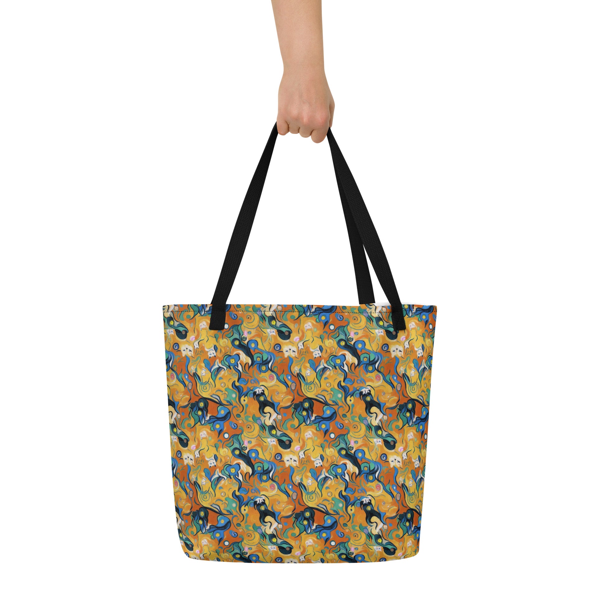 Unleash your artistic spirit with our "Whimsical Feline Dance" Large Tote Bag! This stunning tote features a captivating design of swirling blues, greens, and fiery oranges, reminiscent of a playful kitten frolicking in a Van Gogh-inspired dreamscape. Perfect for the vibrant soul, this bag combines style and functionality, making it your go-to accessory for beach days, art shows, or eclectic soirées. Stand out and express your unique personality with every outing!