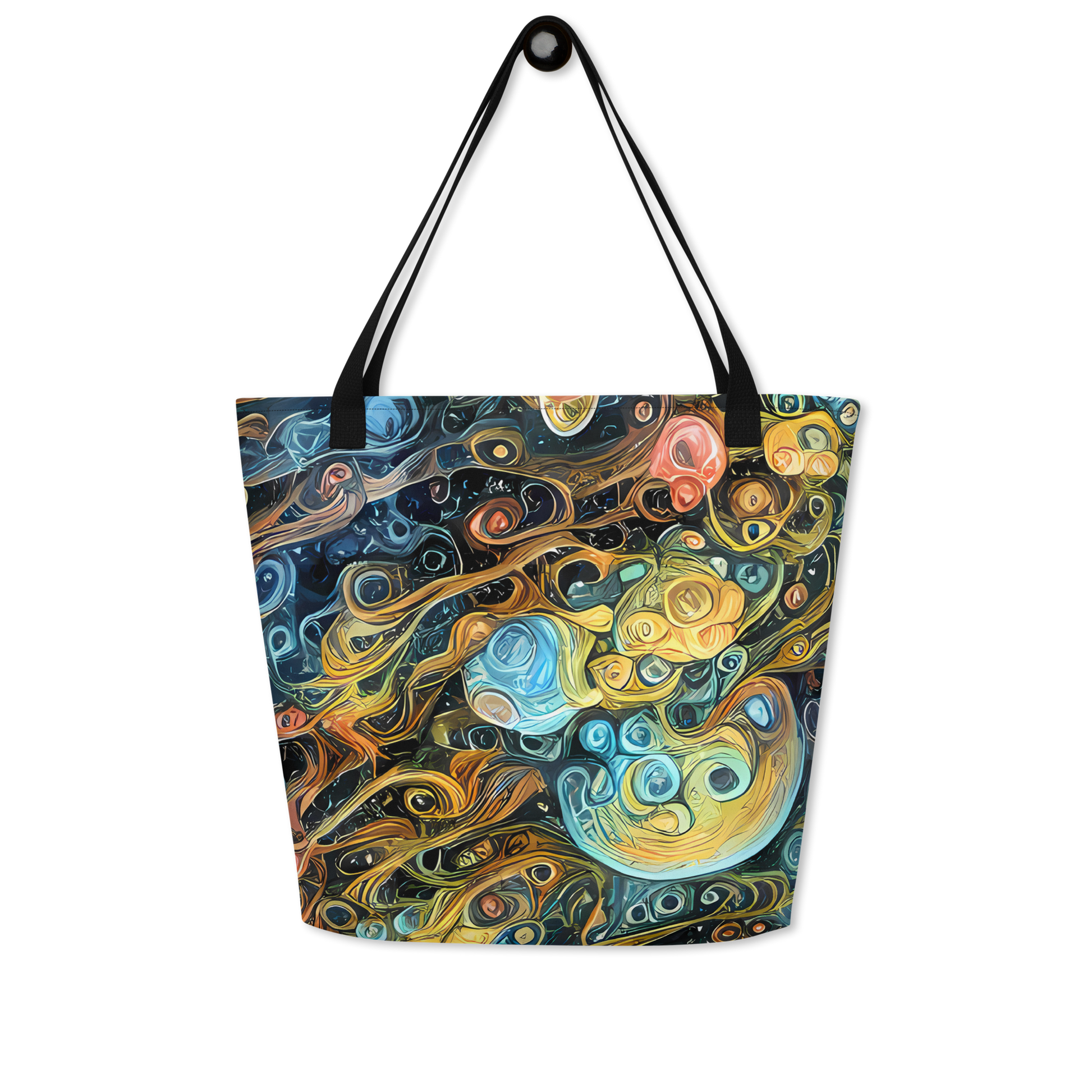 Embark on an interstellar journey with our Large Tote Bag, featuring a design that captures the essence of an untamed galaxy. Swirling with vibrant hues of blues, golds, and pinks, this tote mirrors the beauty of a cosmic dreamscape, inviting onlookers to gaze into a starry night sky spun from your wildest dreams. The fluidity of its patterns promises to spark conversation and admiration, making it a standout accessory for those who embrace the extraordinary in their daily lives.