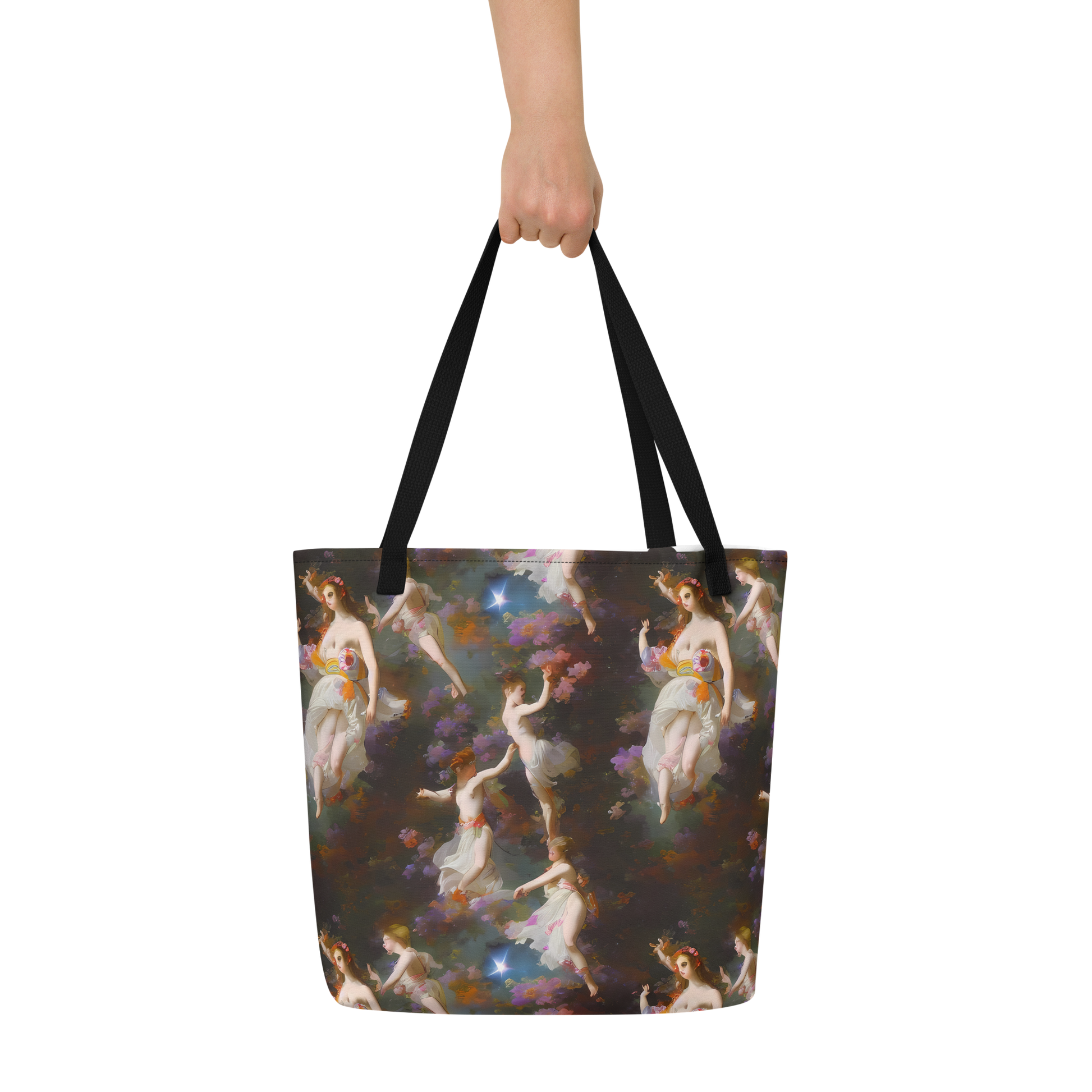 Embark on a journey of elegance and fantasy with our Large Tote Bag, draped in the mesmerizing dance of ethereal figures set against a cosmic backdrop of deep space hues. This tote is a harmonious blend of historical romanticism and avant-garde style, designed to turn heads and evoke admiration at every turn. Its dreamlike quality is sure to add a touch of otherworldly sophistication to your ensemble, perfect for those who adore making bold, whimsical statements.