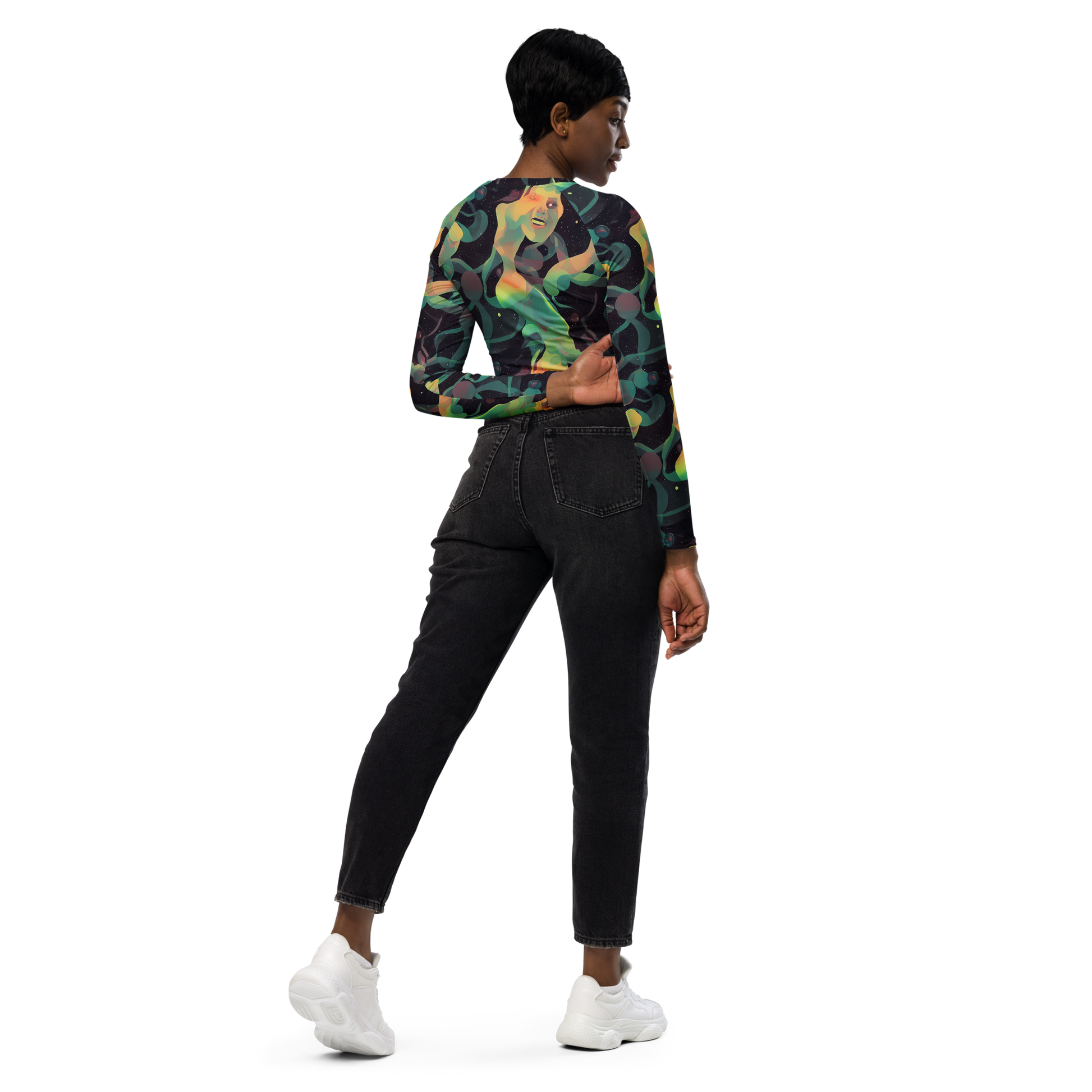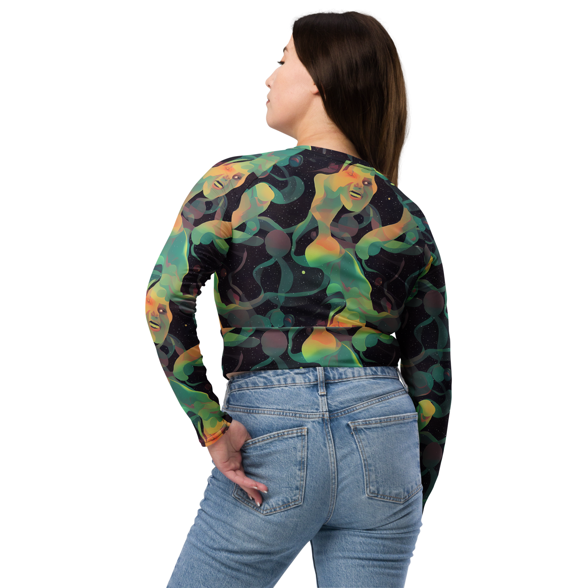 Step into a universe of style with our long-sleeve crop top, featuring a mesmerizing blend of swirling nebulae and ethereal faces in vibrant hues of teal, peach, and deep space black. Perfect for festival wear, artistic gatherings, or any event where bold self-expression is celebrated, this top is designed for the adventurous spirit. Crafted from recycled materials and boasting UPF 50+ protection, it's as eco-friendly as it is stylish. The trendy cropped silhouette and wide, double-layered waistband ensure a flattering fit, making it ideal for both active and leisurely pursuits.