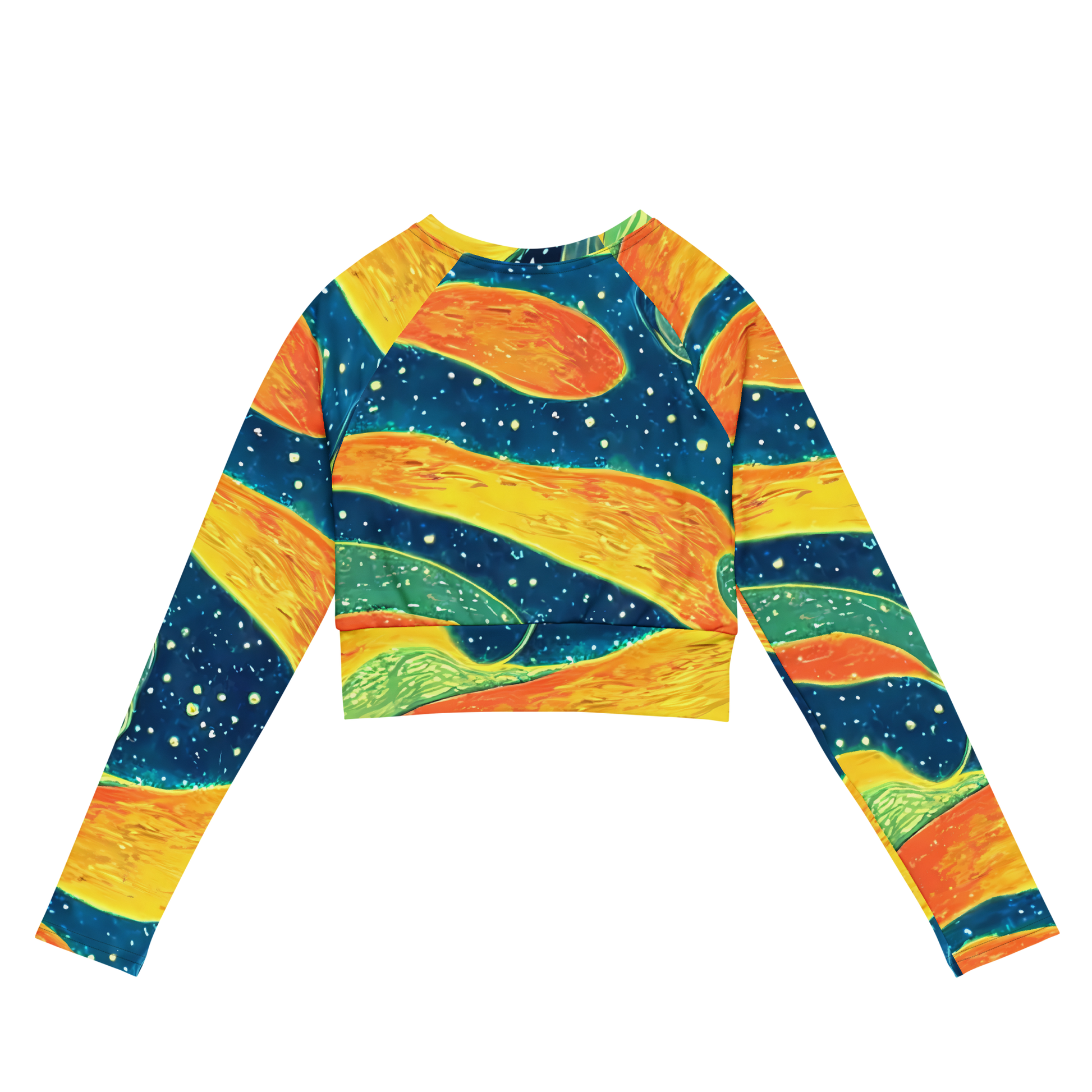 Ignite your style with our "Celestial Harmony" Long Sleeve Crop Top, a stunning blend of eco-chic fashion and cosmic artistry! Adorned with a mesmerizing pattern of swirling oranges, yellows, and greens against a deep cosmic blue, this top captures the essence of adventure and creativity. Perfect for art gallery openings or summer festivals, it's designed for the free-spirited individual who wants to make a statement while embracing sustainability.