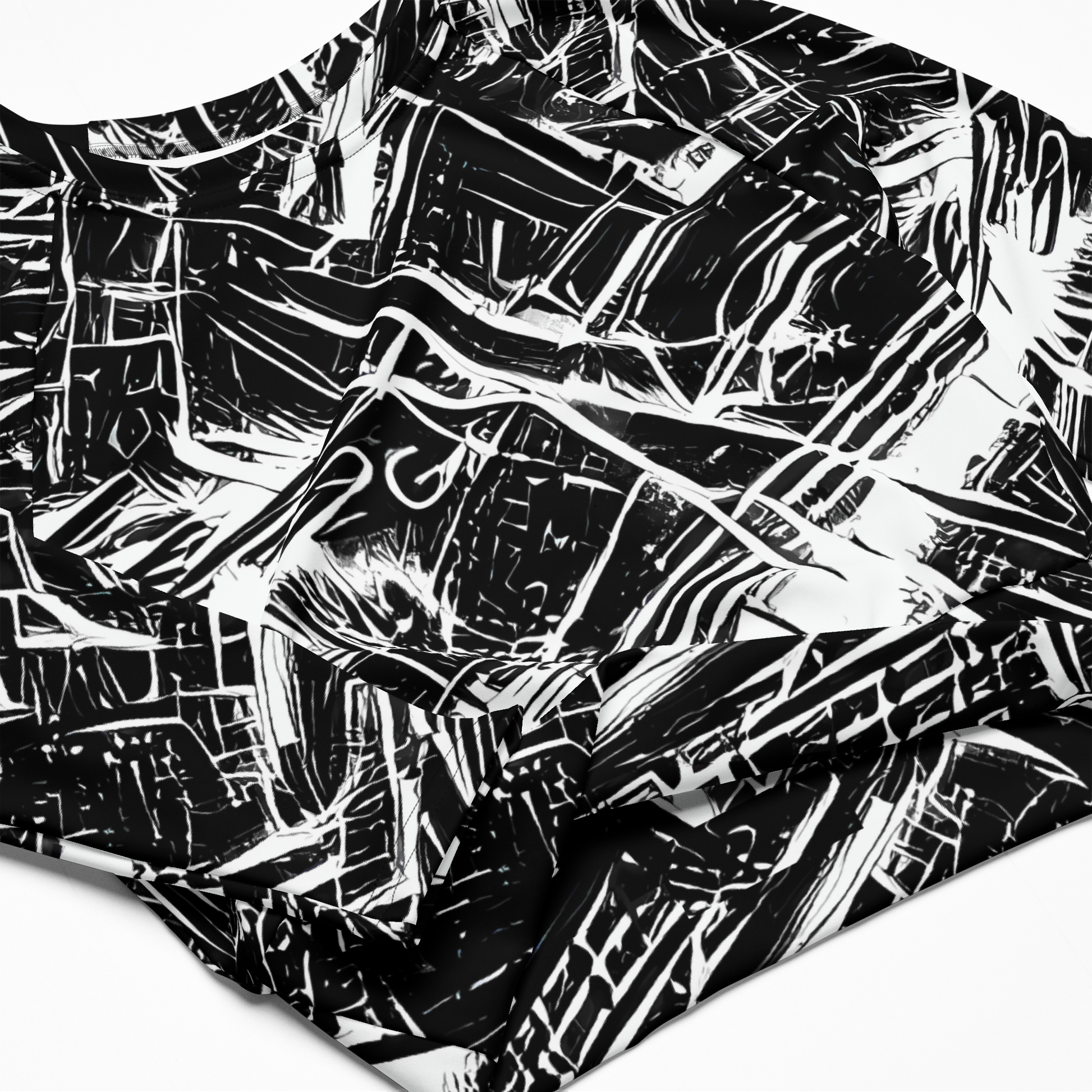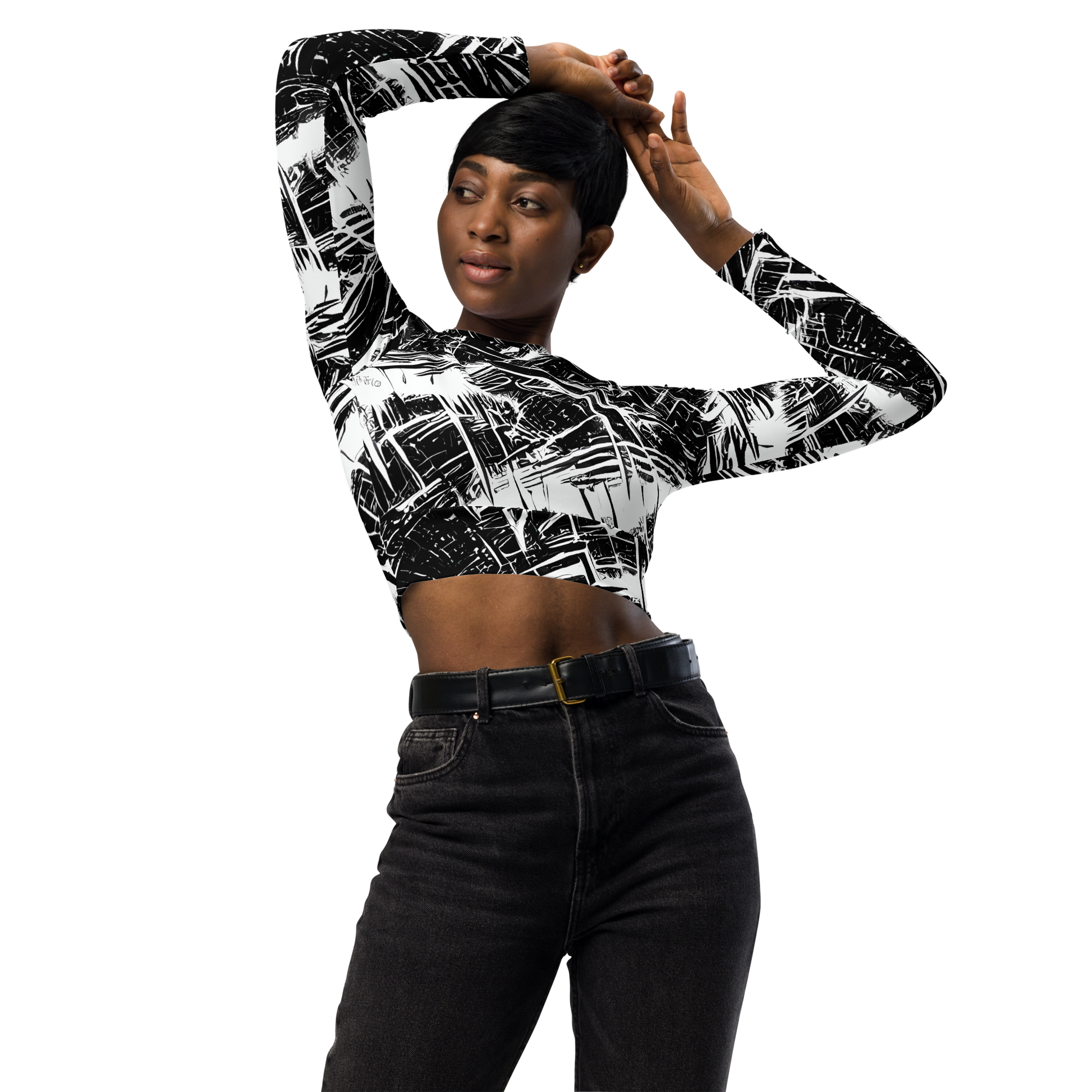 Step into the spotlight with our eco-chic, long-sleeve crop top featuring bold, monochromatic black and white lines and geometric shapes. This sophisticated design evokes urban architectural sketches, perfect for making a statement at any fashion-forward event. Crafted with recycled materials and a flattering cropped silhouette, this top is as stylish as it is sustainable. Elevate your wardrobe with this unique piece that fuses art and architecture, embodying modernist grandeur and dynamic cityscapes.