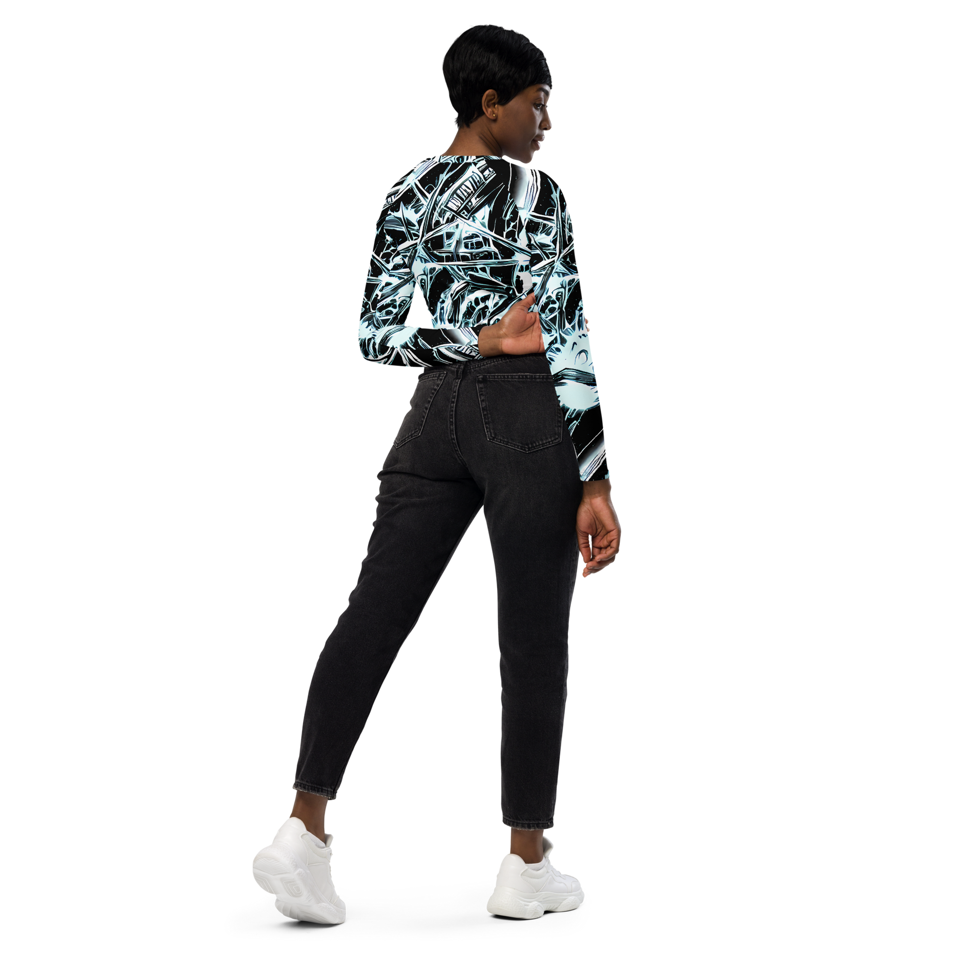 Unleash your inner artist with our "Frosted Infusion" Long Sleeve Crop Top! This stunning piece features a dynamic pattern of intricate ice-like shards and swirling shapes, enveloped in a palette of icy blues, stark whites, and deep blacks. Perfect for those who embrace adventure and seek to make a bold statement, this eco-chic top combines avant-garde flair with sustainability. Whether you're at a winter event or an edgy gathering, this top will elevate your style while protecting the planet.
