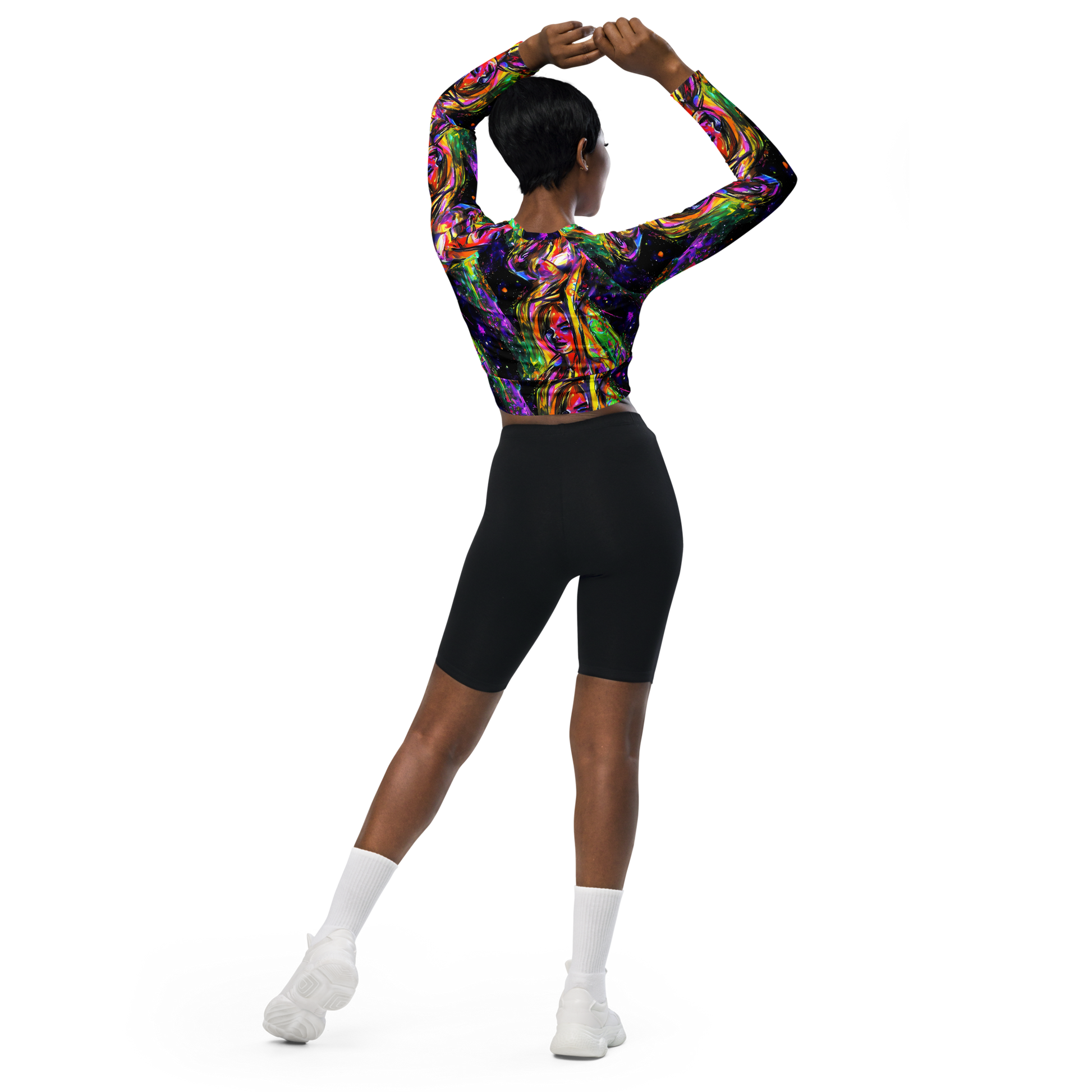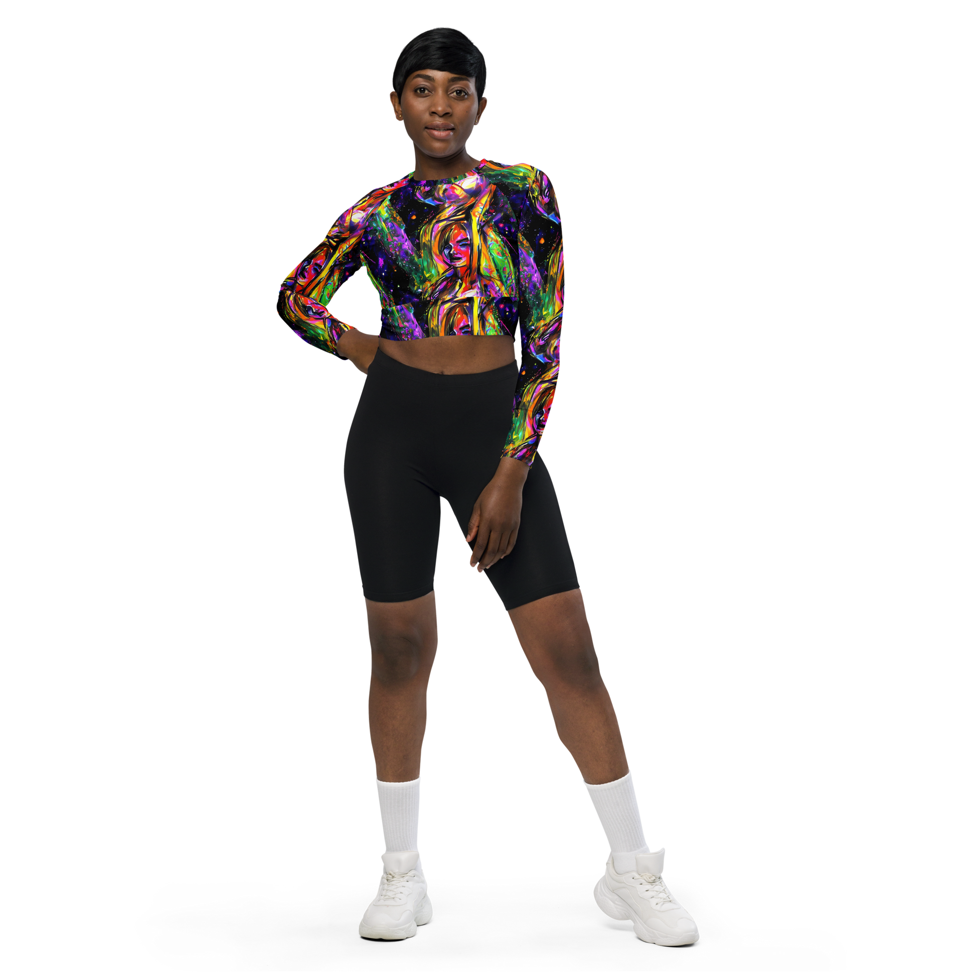 Step into a universe of style with our long-sleeve crop top, adorned with the vibrant energy of a cosmic dance. The deep blues, purples, and fiery oranges of our design evoke the passionate spirit of flamenco, set against the infinite canvas of space. Abstract shapes that whisper tales of celestial wonders wrap you in an aura of mystery, making this top the ideal choice for those who shine as brightly as the stars at any festival or artistic gathering.