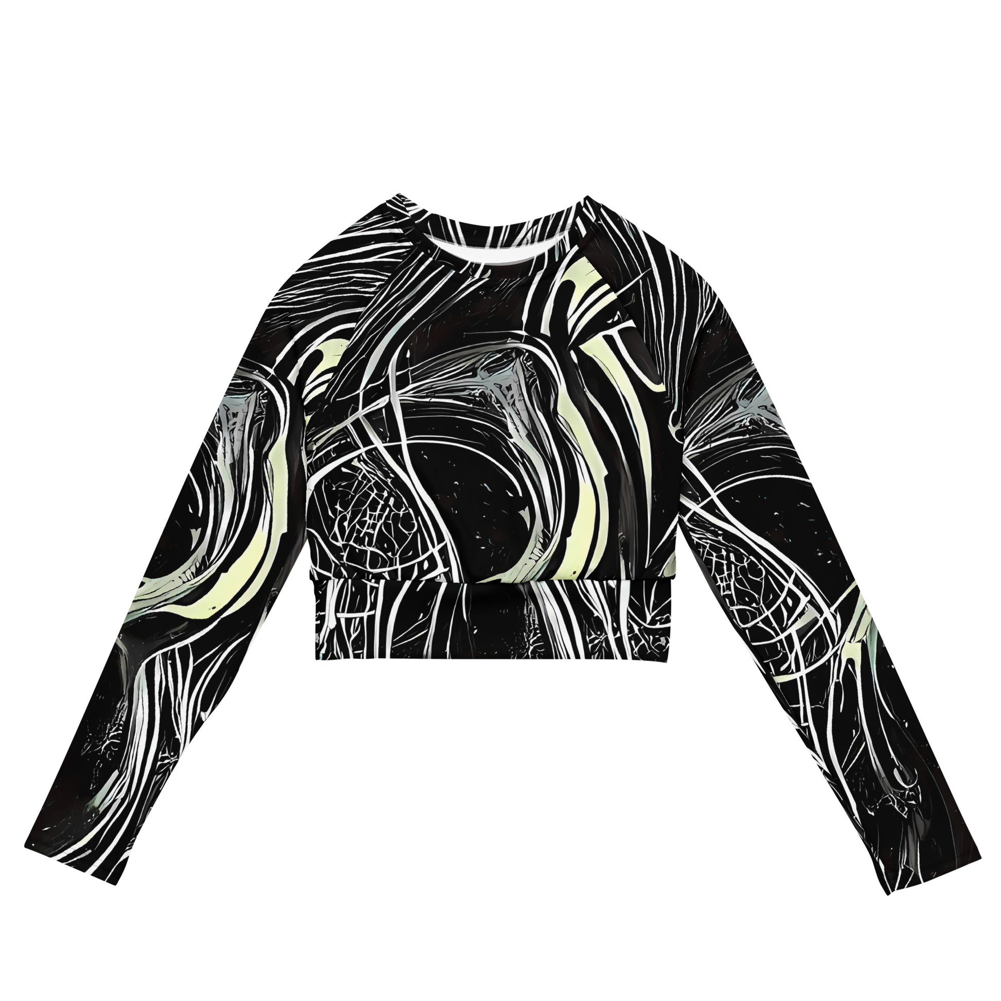Step into the spotlight with our "Helmut's Whisper" Long Sleeve Crop Top, where avant-garde fashion meets eco-chic sophistication! This custom-designed piece features an intricate pattern that embodies noir elegance and abstract expression, swirling in bold blacks, stark whites, and subtle grays. Perfect for the confident individual who craves the unconventional, this top is not just a garment—it's a statement. Made from recycled materials, it offers both style and sustainability, making it an essential addition to your wardrobe.